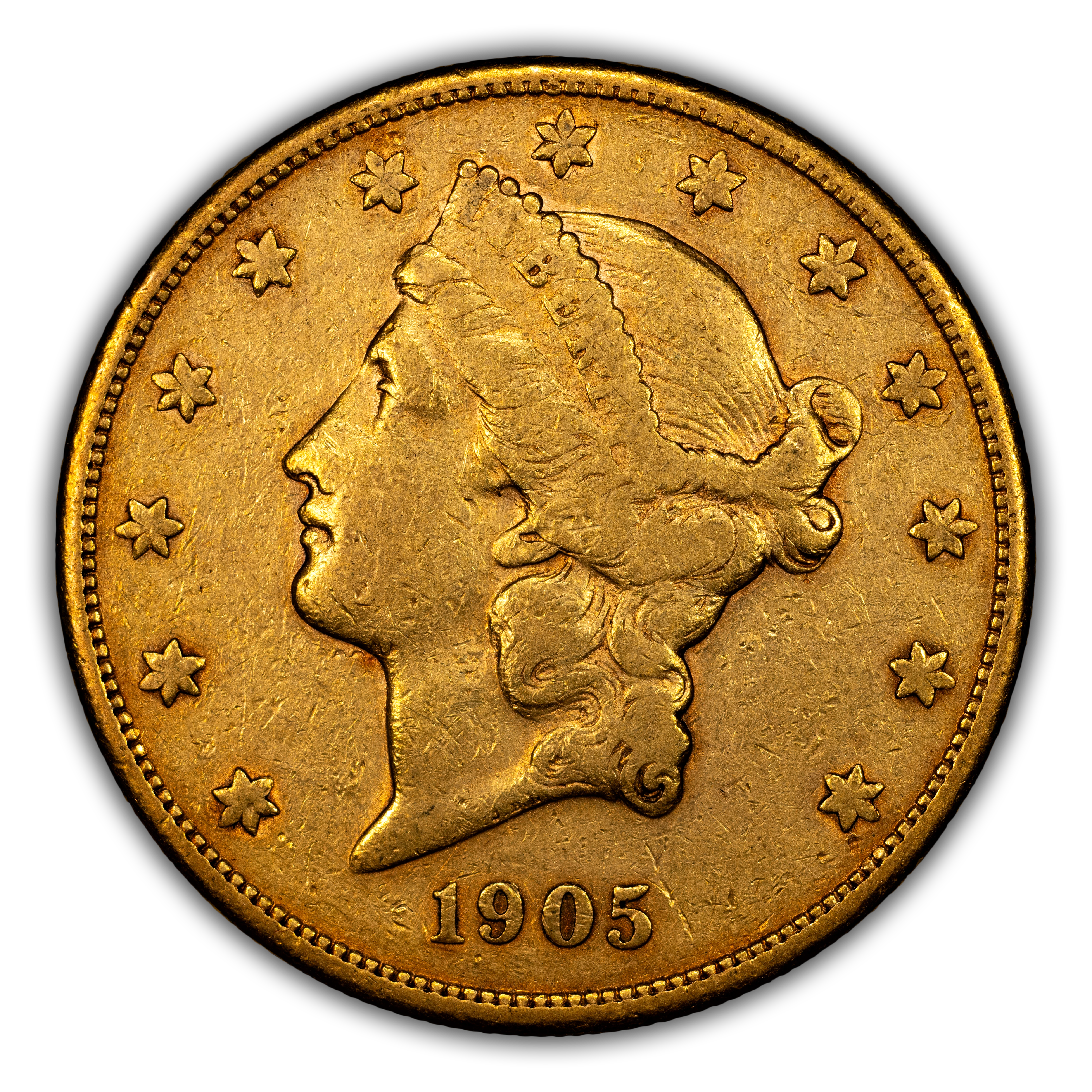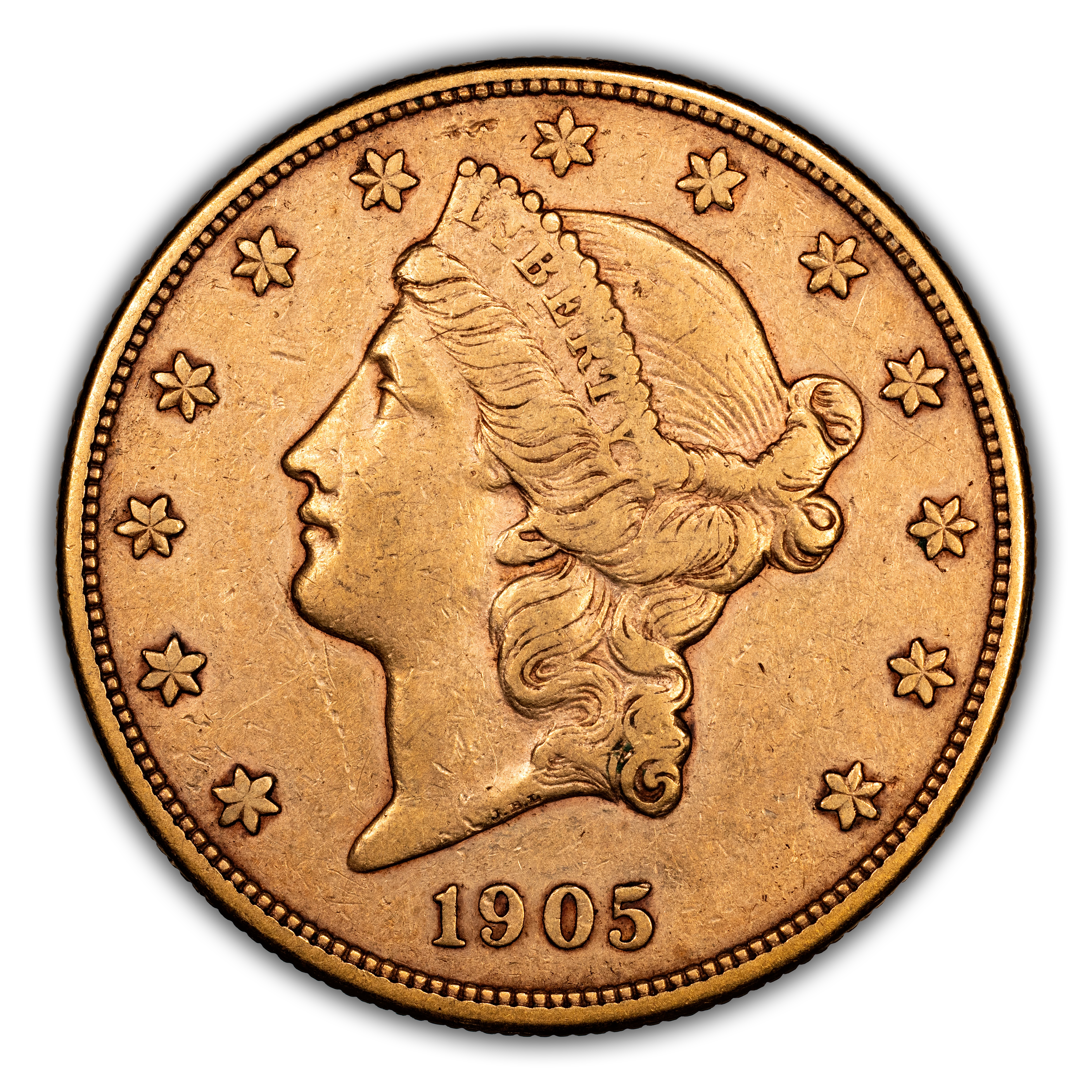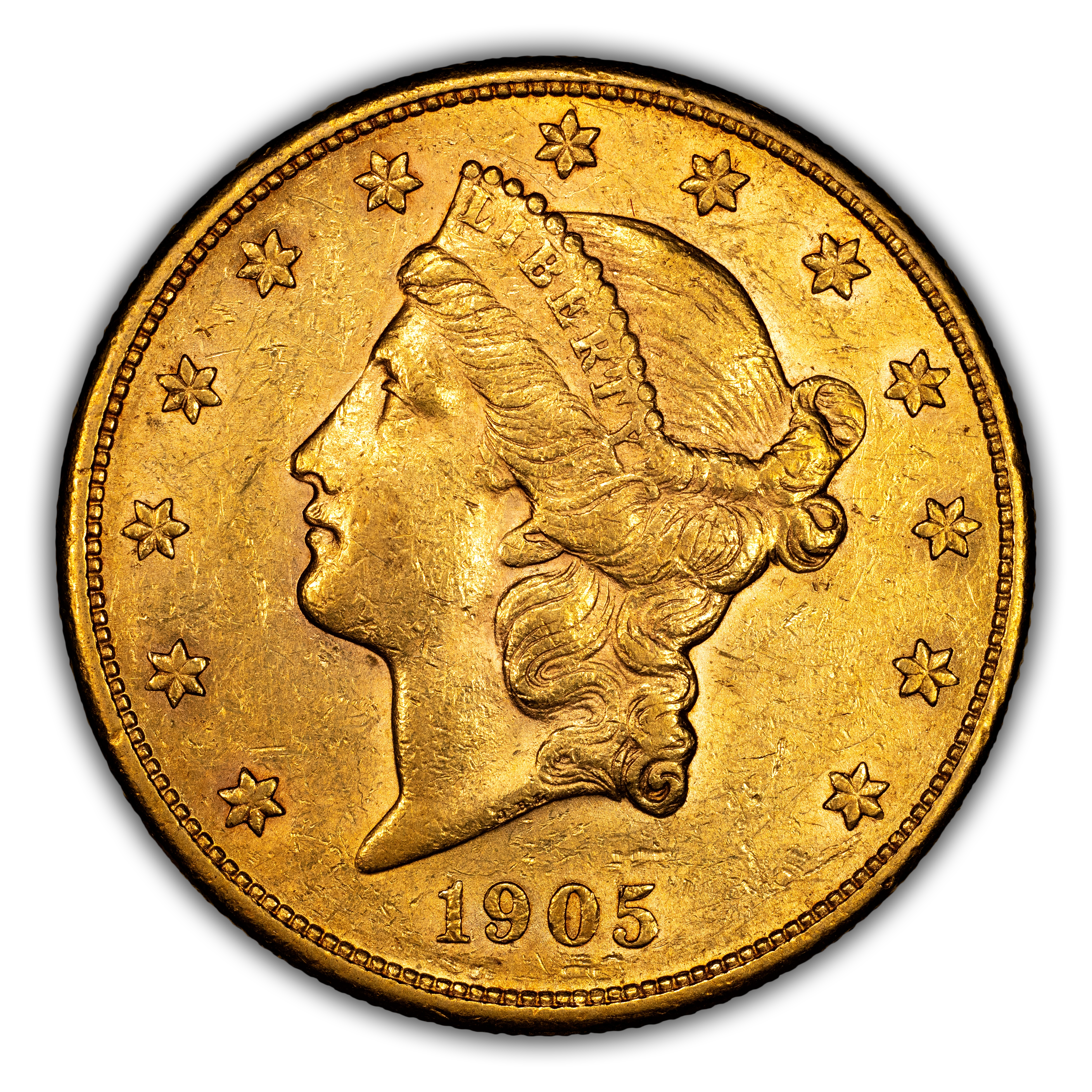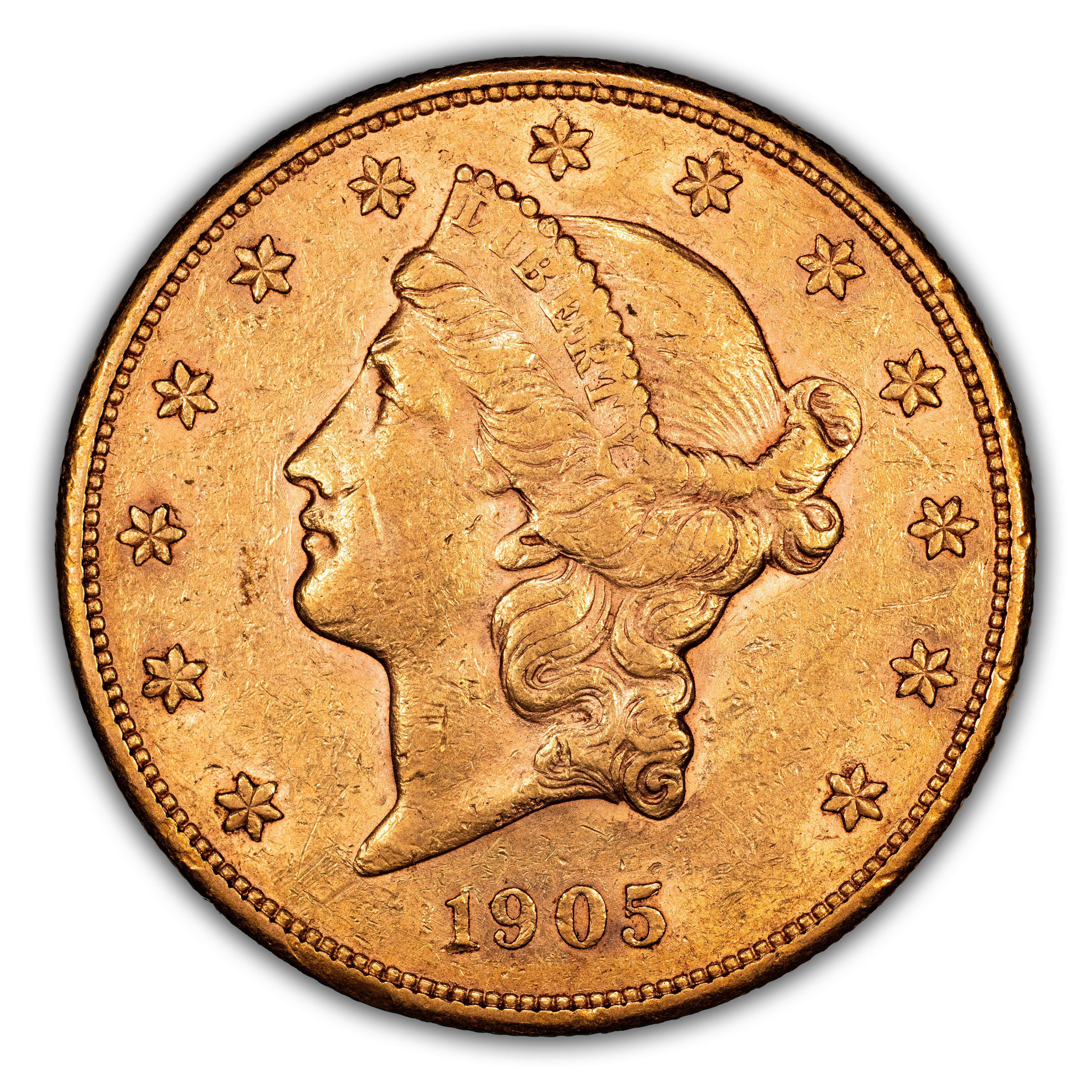 Reverse: Shielded eagle with wings outstretched holding arrows and olive branches. The words UNITED STATES OF AMERICA * TWENTY D. appear around the periphery. Mint mark, if any, appears below the eagle's tail, above the N in TWENTY.