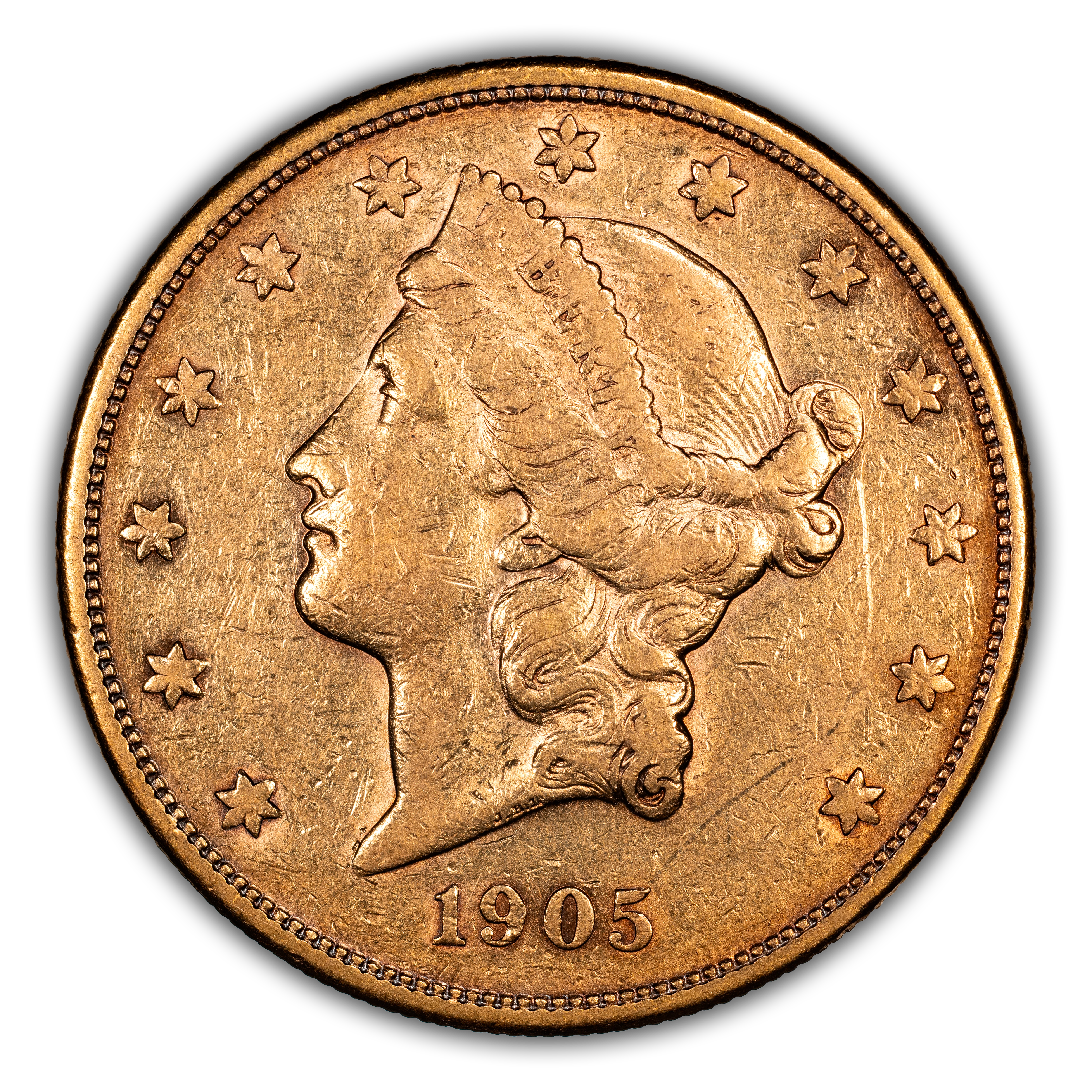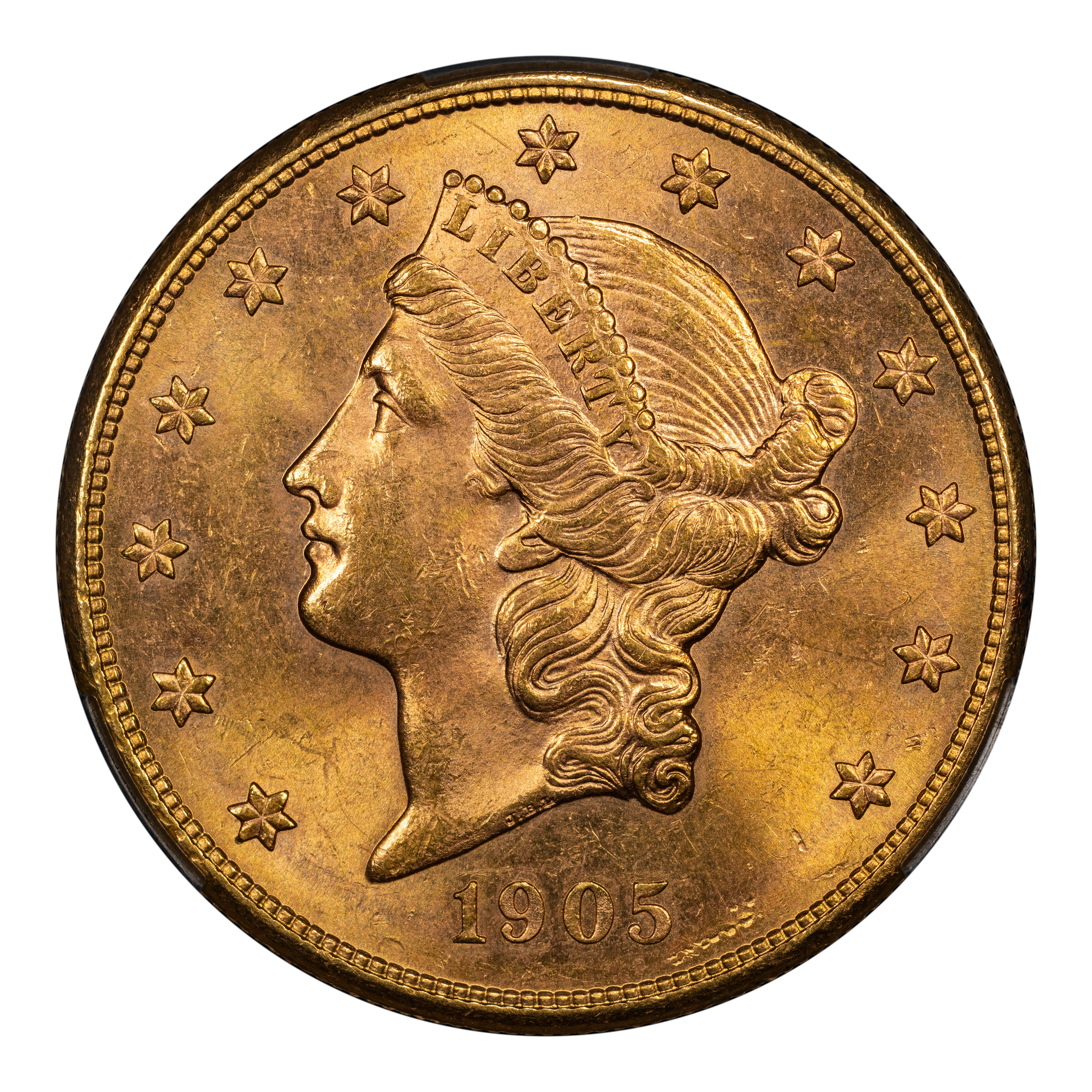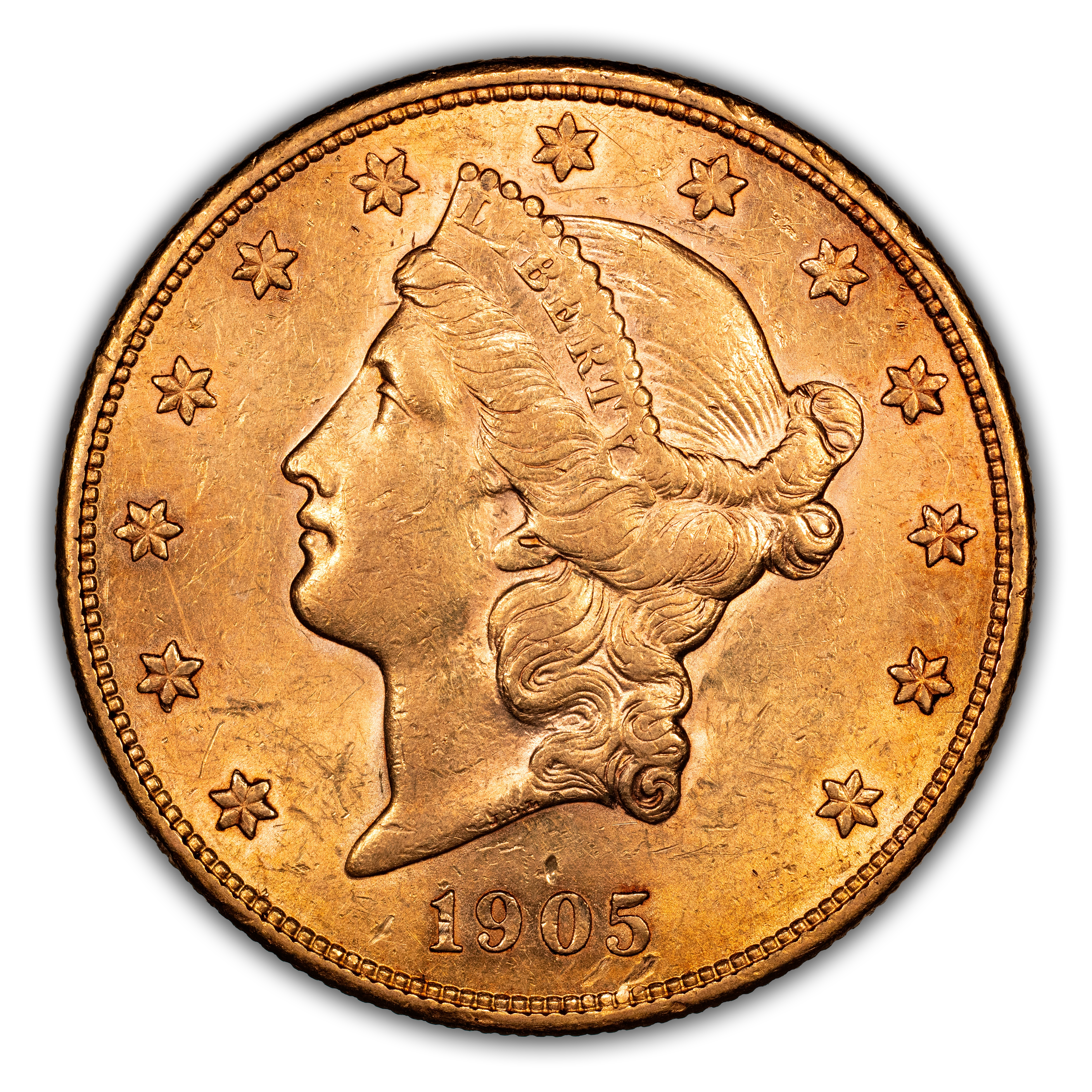 Reverse: Shielded eagle with wings outstretched holding arrows and olive branches. The words UNITED STATES OF AMERICA * TWENTY D. appear around the periphery. Mint mark, if any, appears below the eagle's tail, above the N in TWENTY.