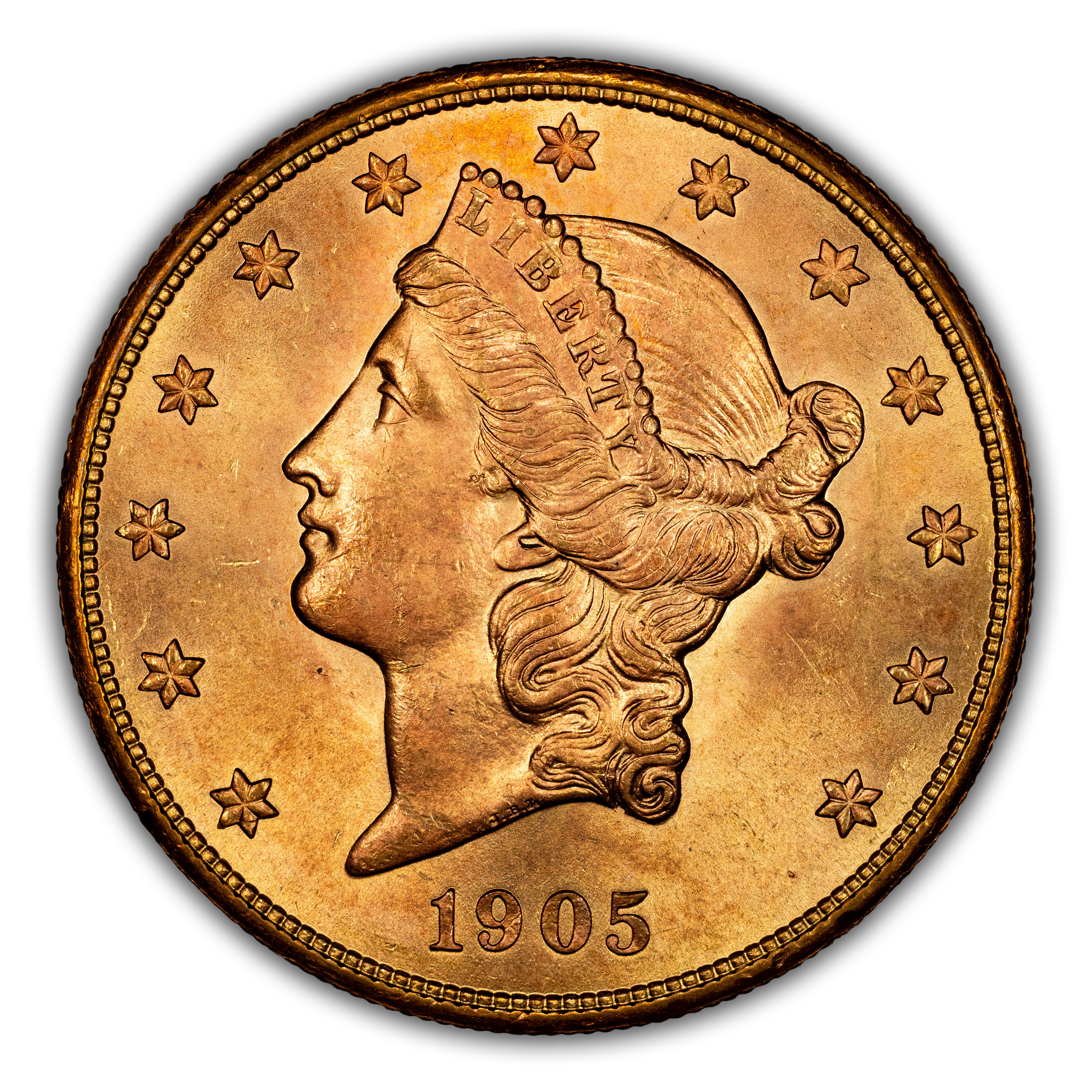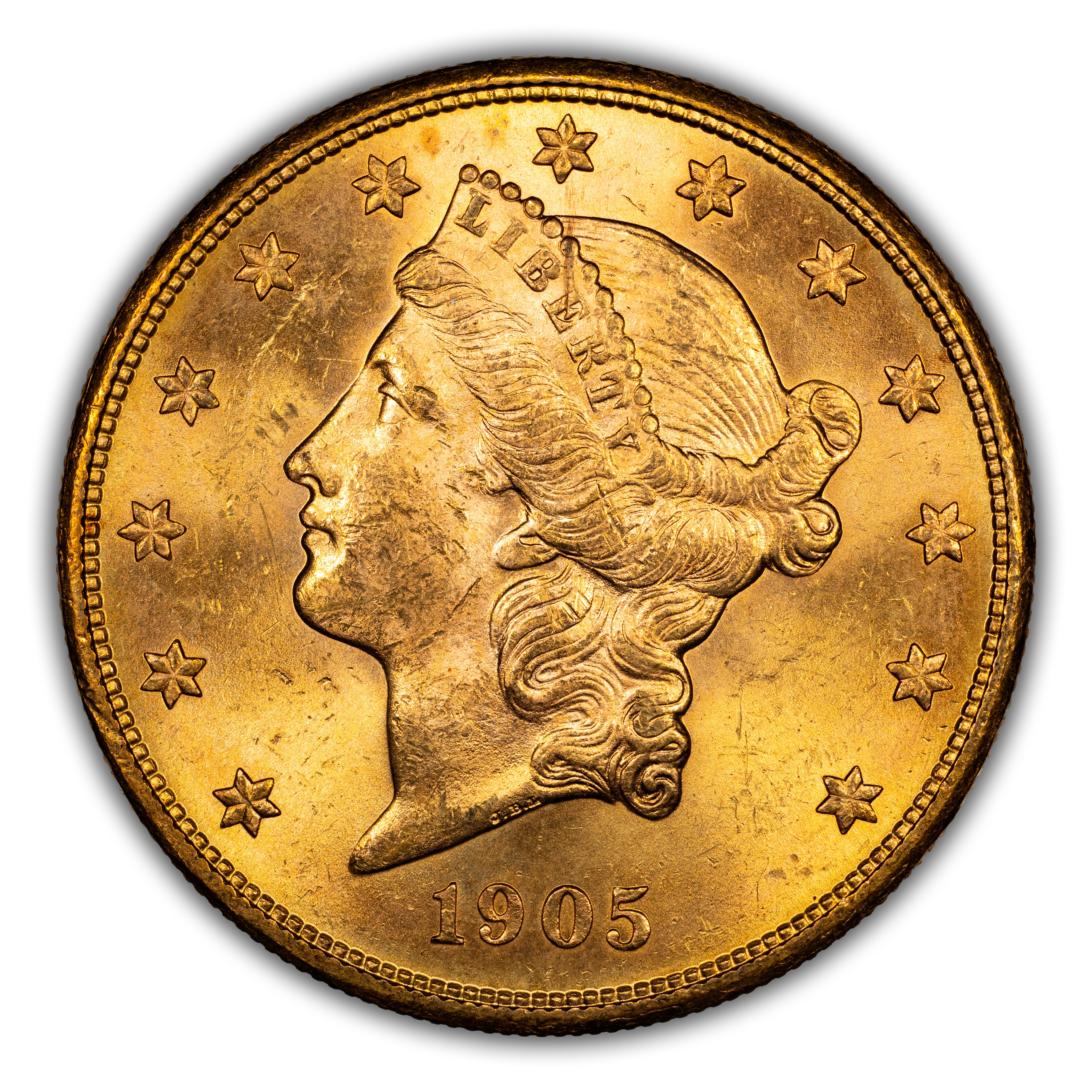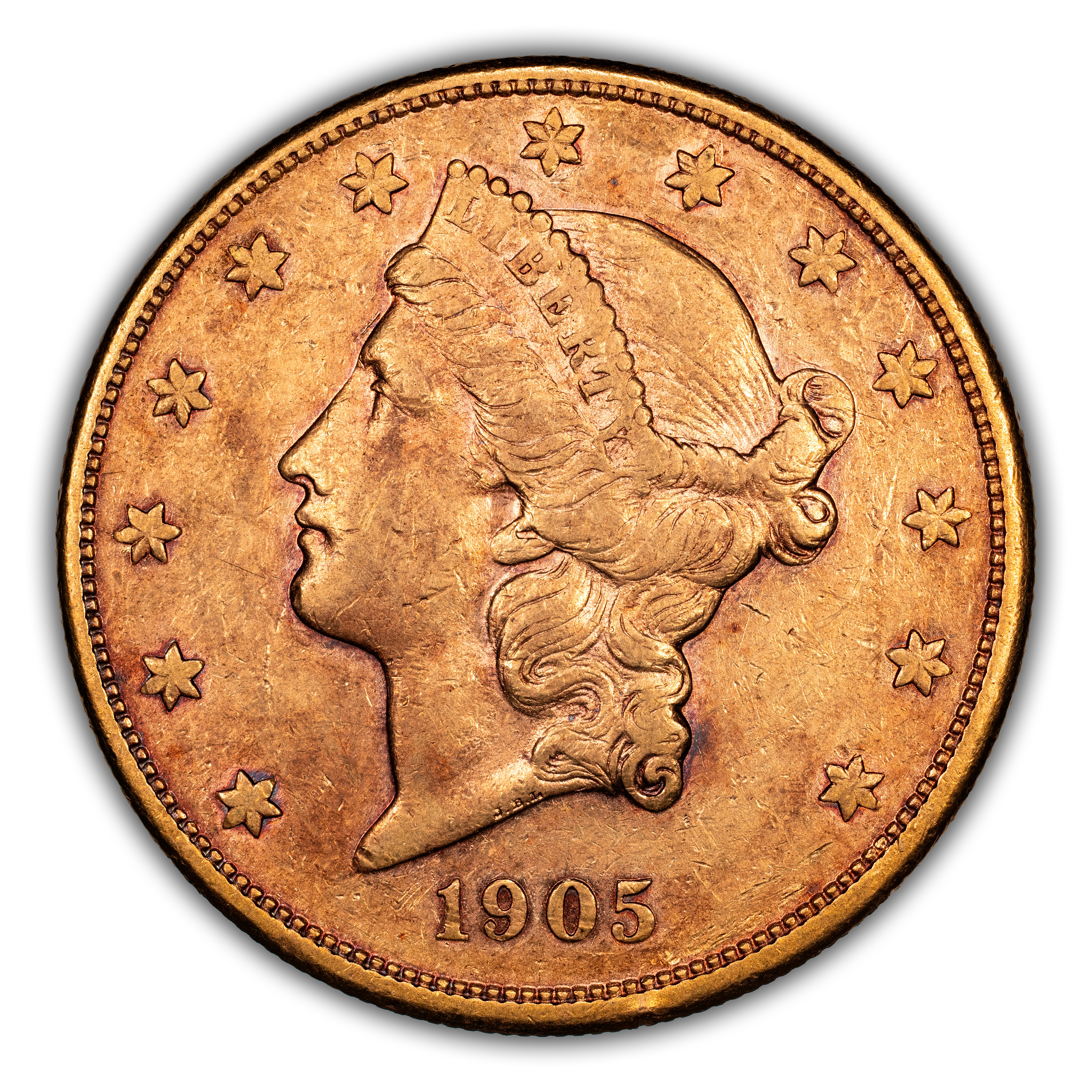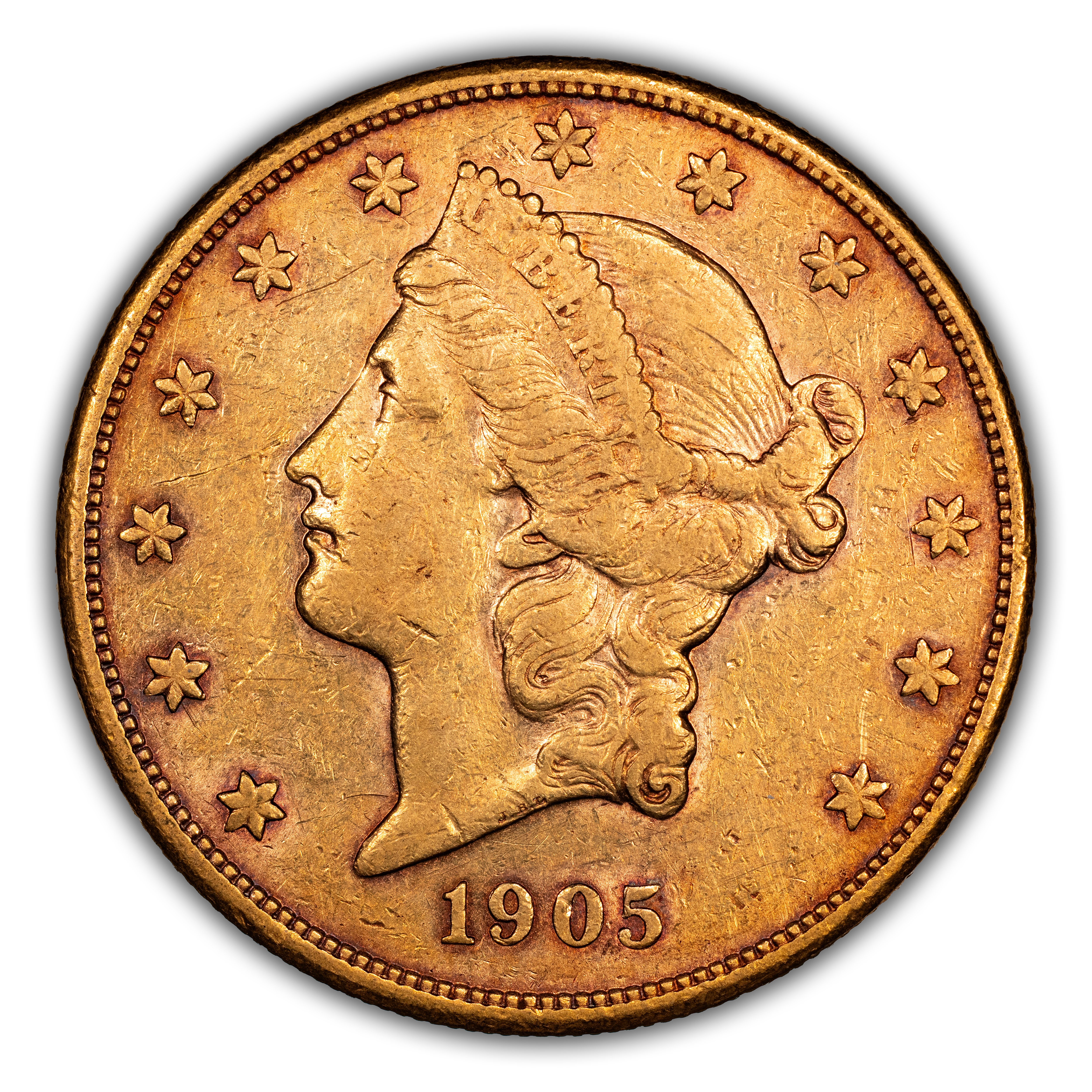 Reverse: Shielded eagle with wings outstretched holding arrows and olive branches. The words UNITED STATES OF AMERICA * TWENTY D. appear around the periphery. Mint mark, if any, appears below the eagle's tail, above the N in TWENTY.