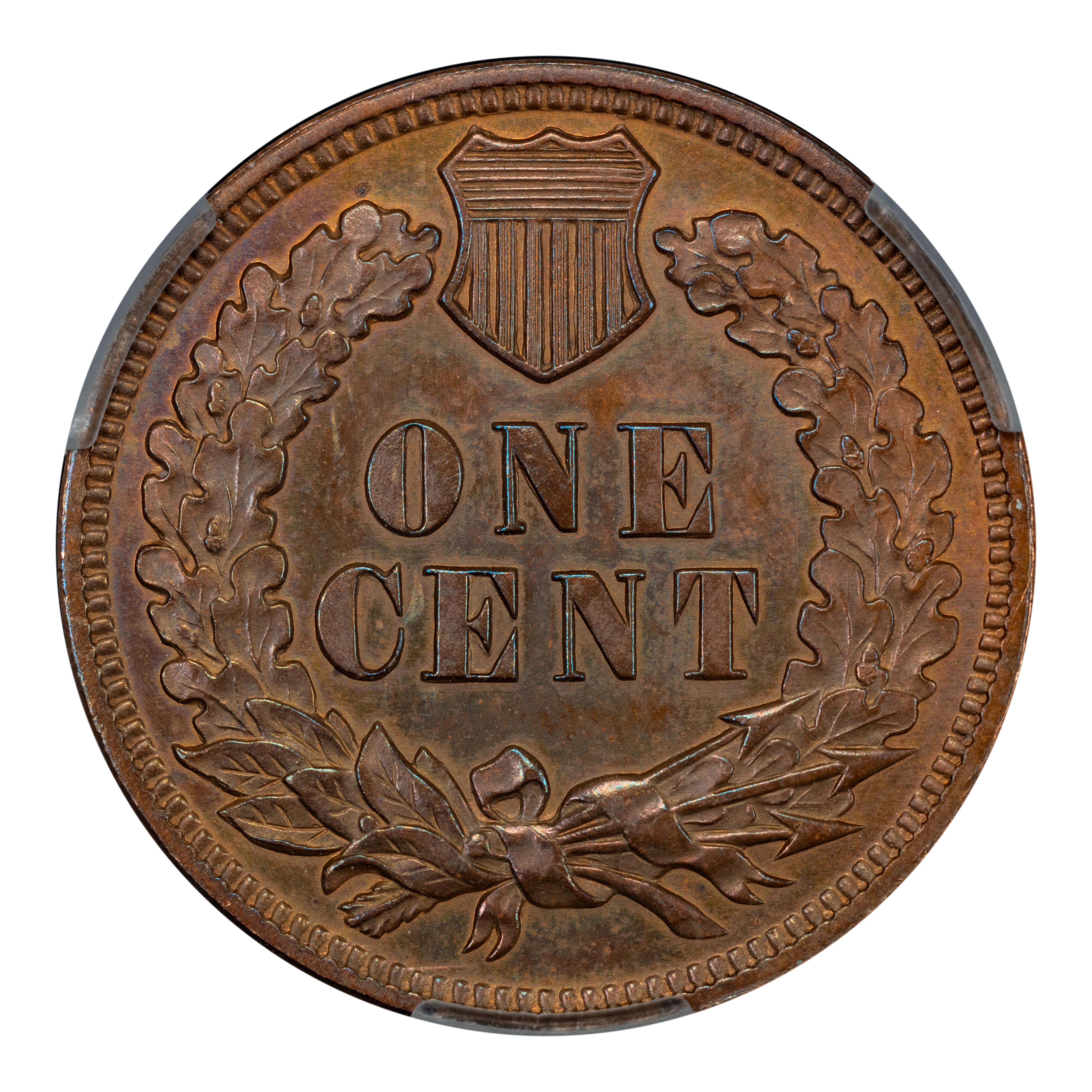 Reverse: The reverse bears the denomination of ONE CENT in the center surrounded by a wreath bearing a ribbon with arrows tied in at the bottom center.
