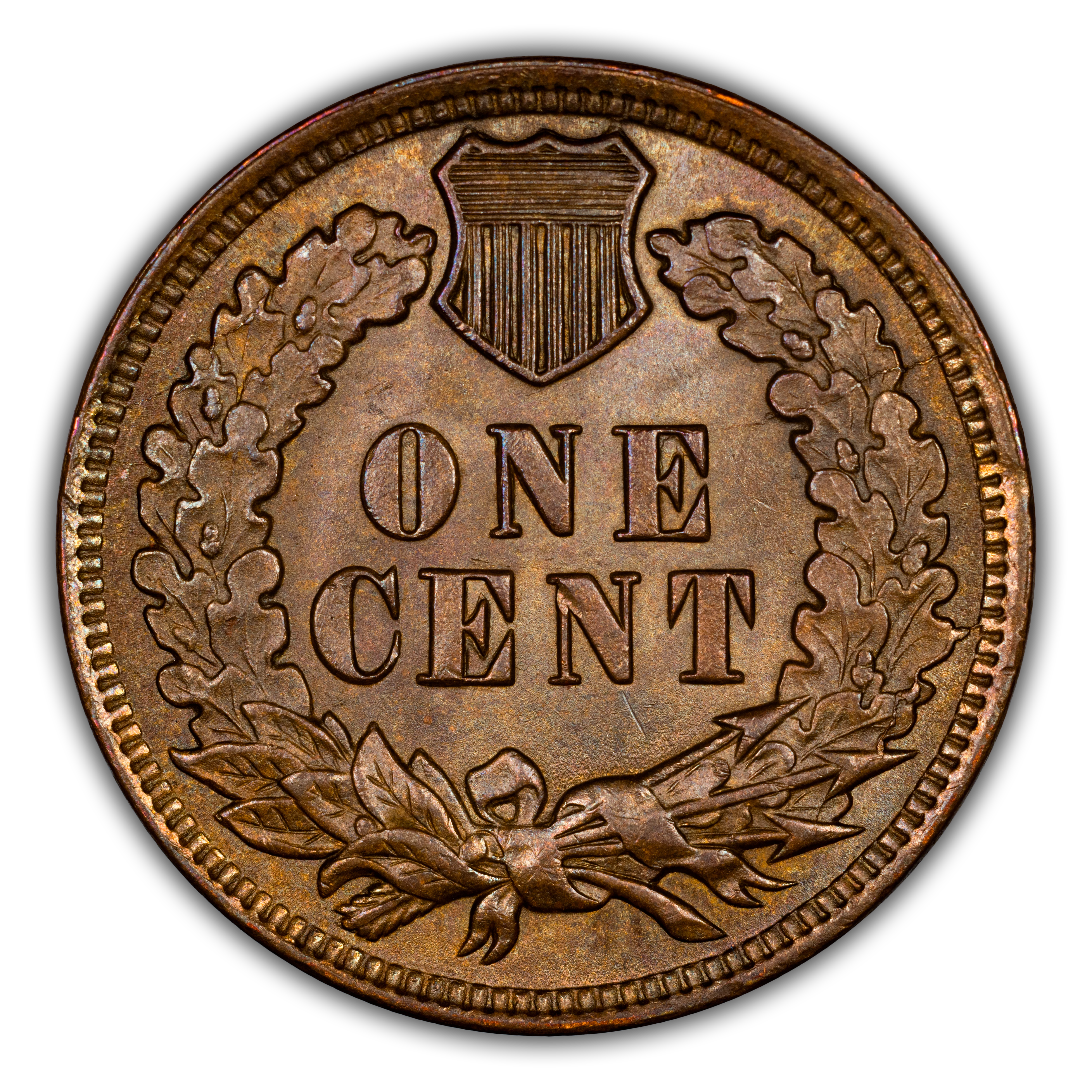 Reverse: The reverse bears the denomination of ONE CENT in the center surrounded by a wreath bearing a ribbon with arrows tied in at the bottom center.