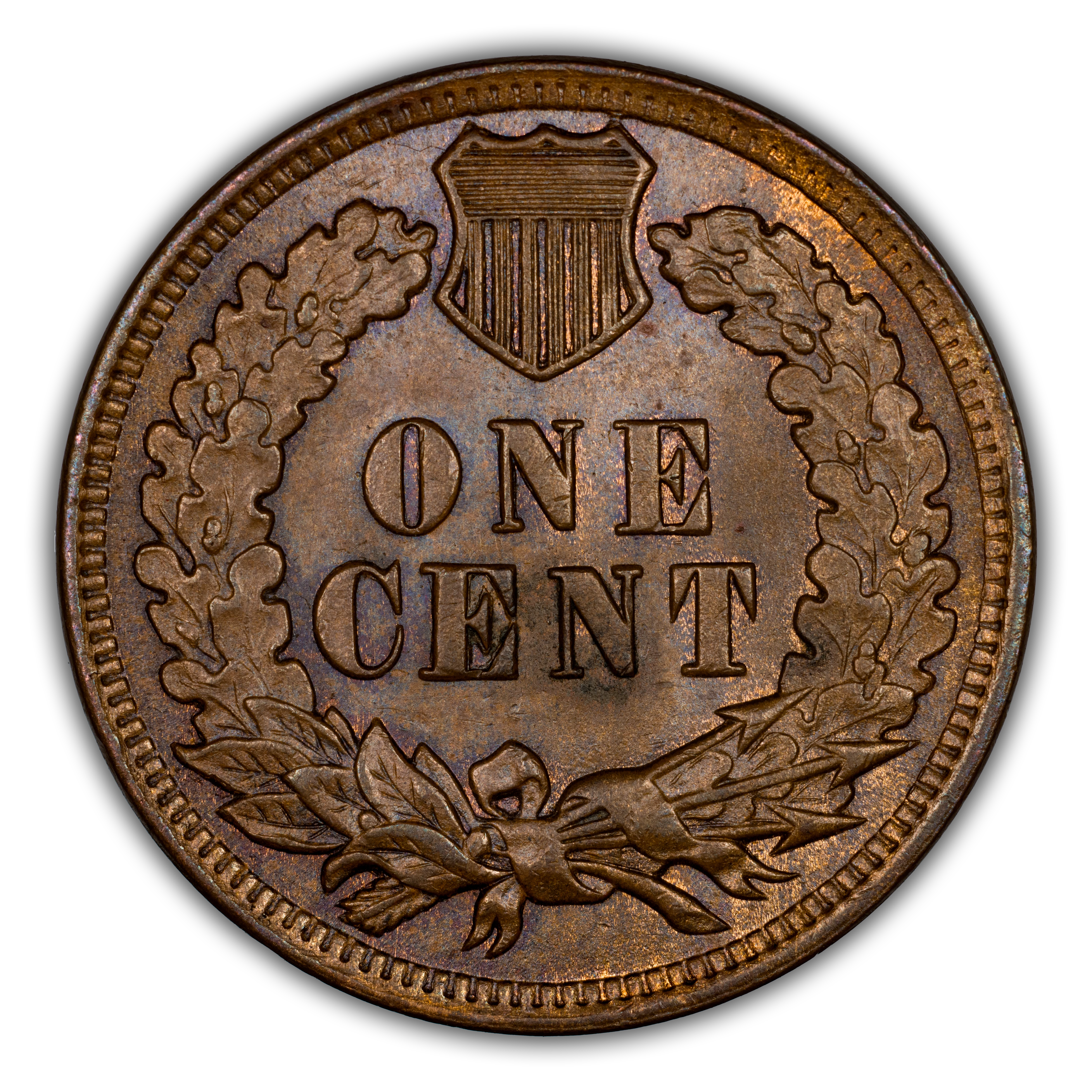 Reverse: The reverse bears the denomination of ONE CENT in the center surrounded by a wreath bearing a ribbon with arrows tied in at the bottom center.