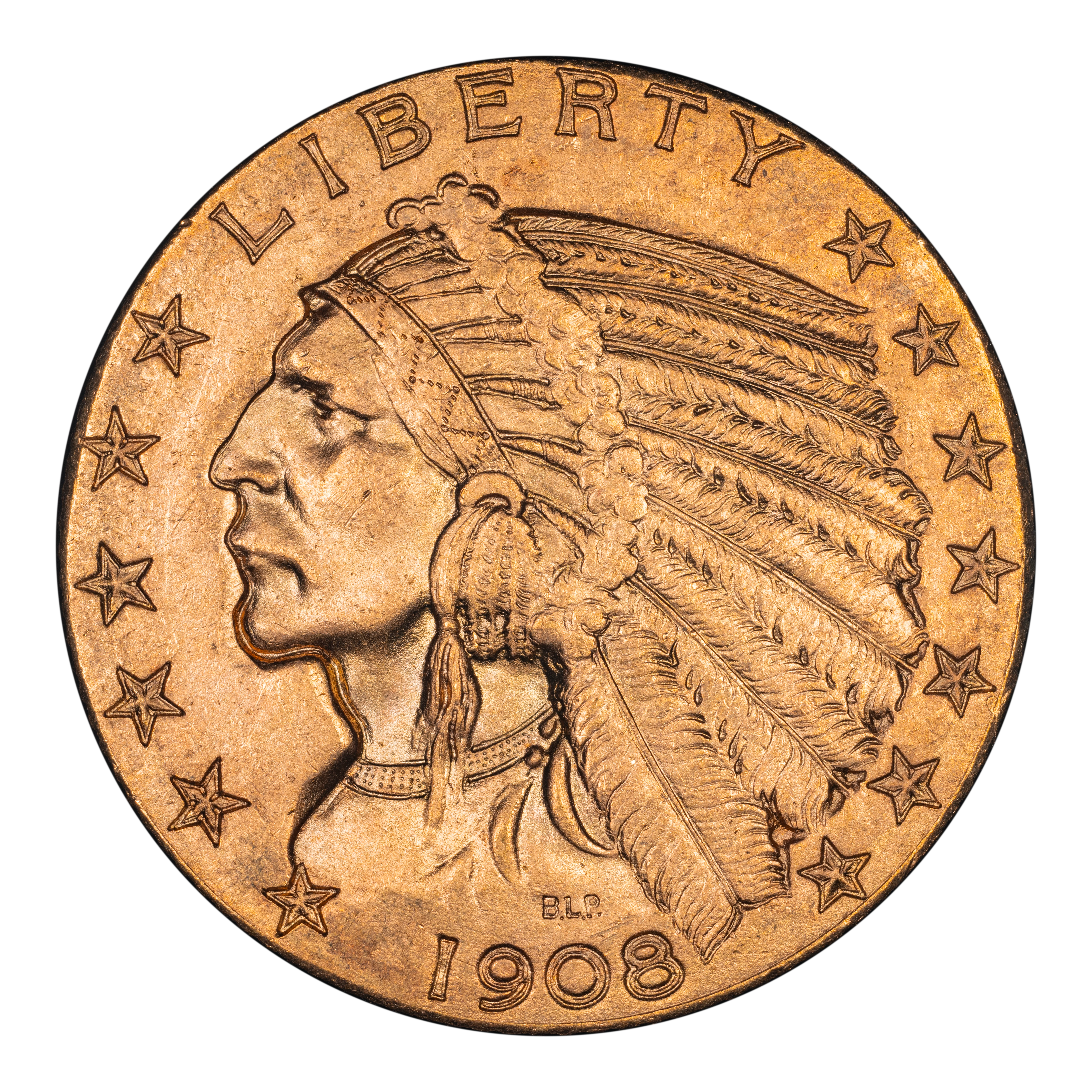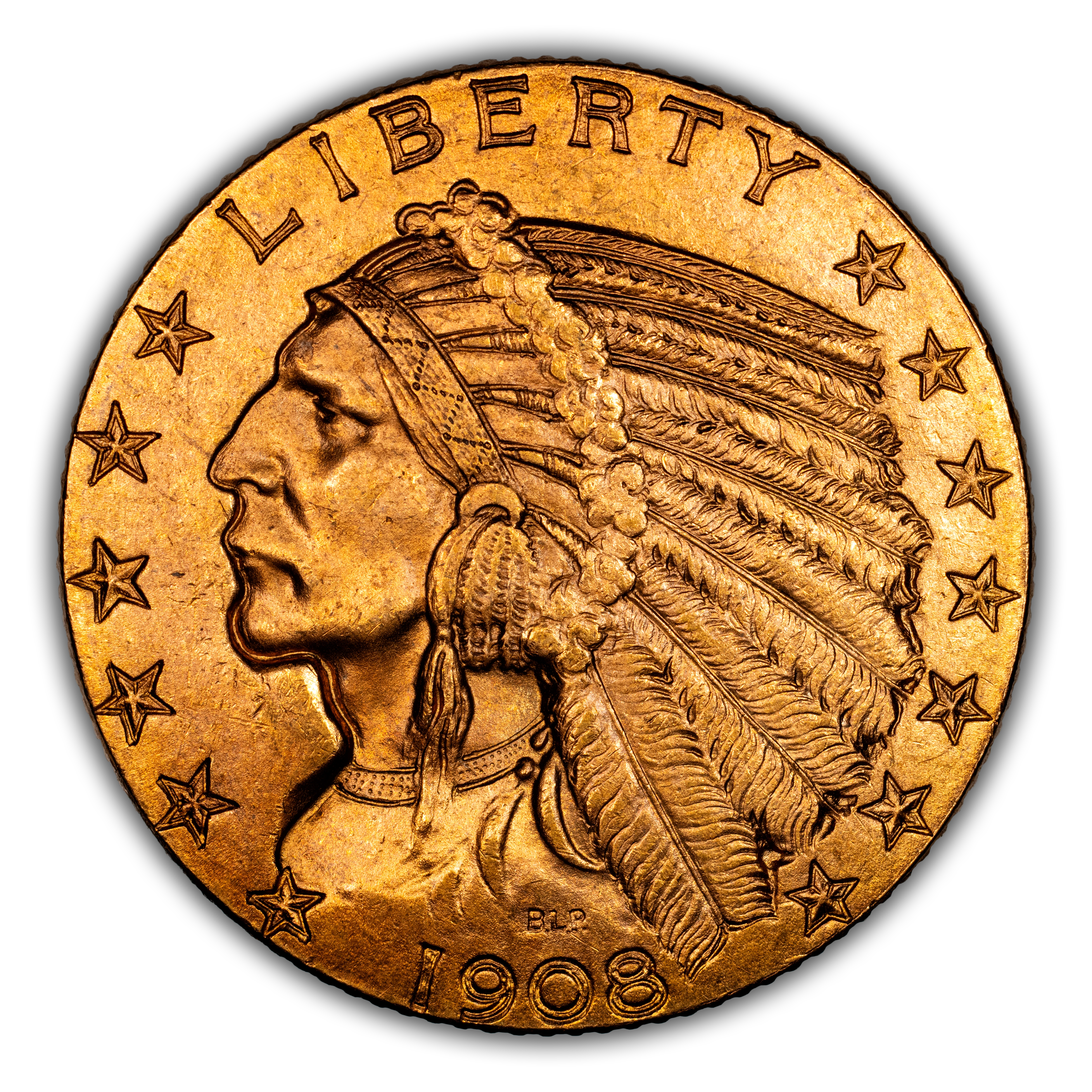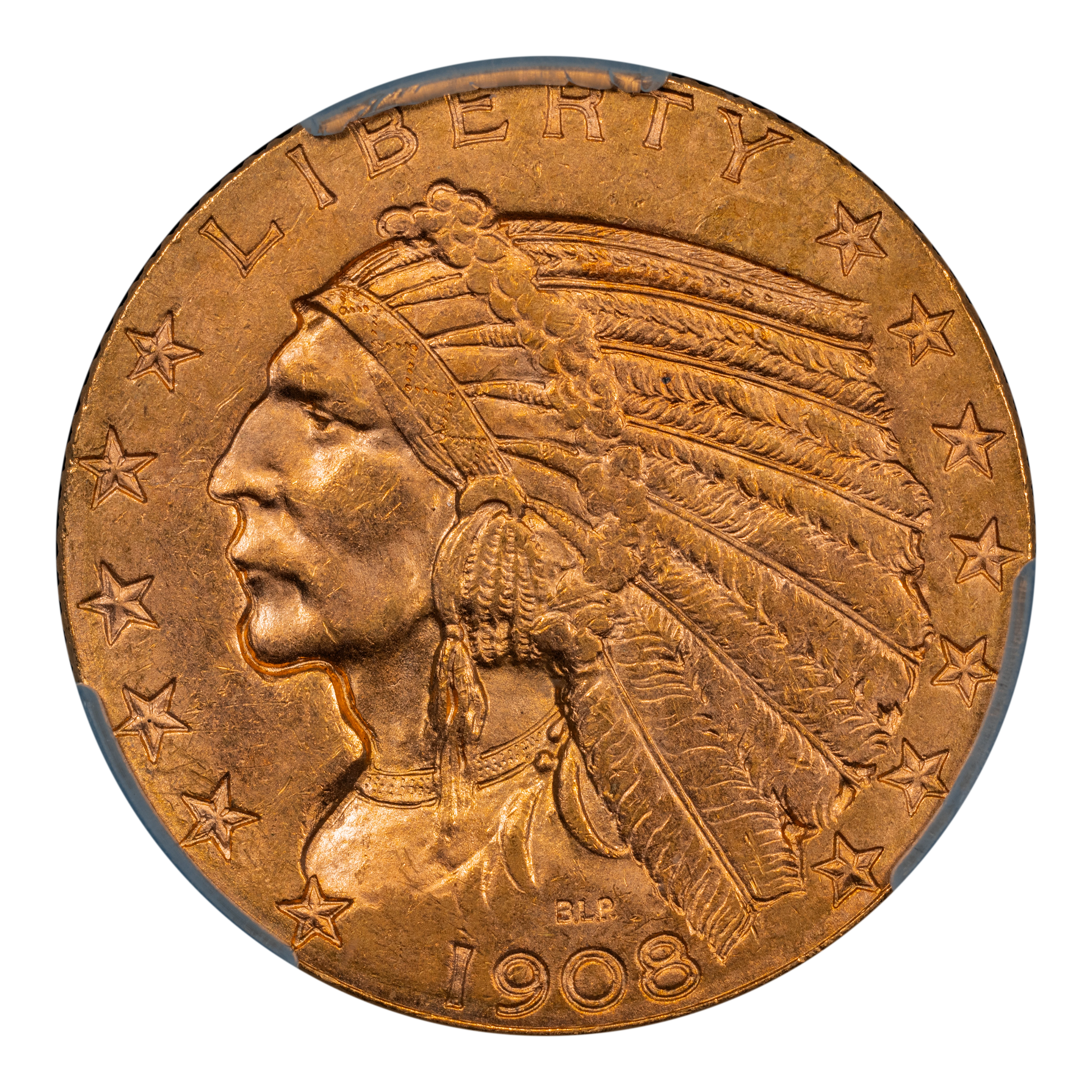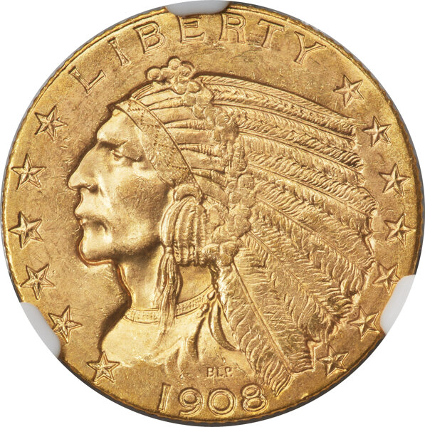 The 1908-D Half Eagle is quite abundant and not overly valuable up to MS64 which is very unexciting. This is due to multiple hoards of the date coming up throughout the years but it is the gem examples of this issue that are eye popping. This date is nearly nonexistent in MS65 and especially finer than that. Only a handful of higher end gems can be found and barely ever see the auction block.