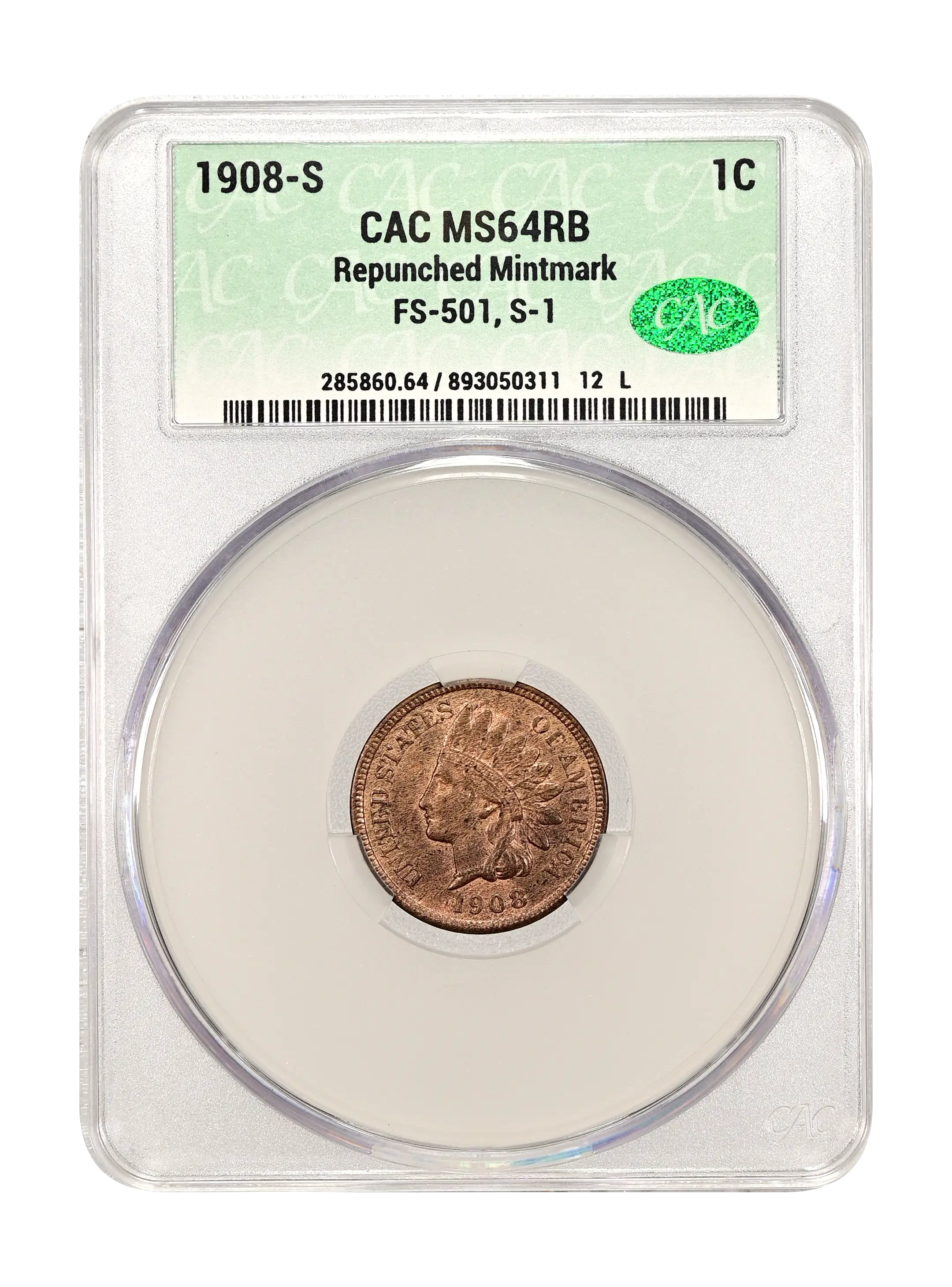 1908-S Repunched Mintmark 1c FS-501, S-1 RB CAC MS64RB