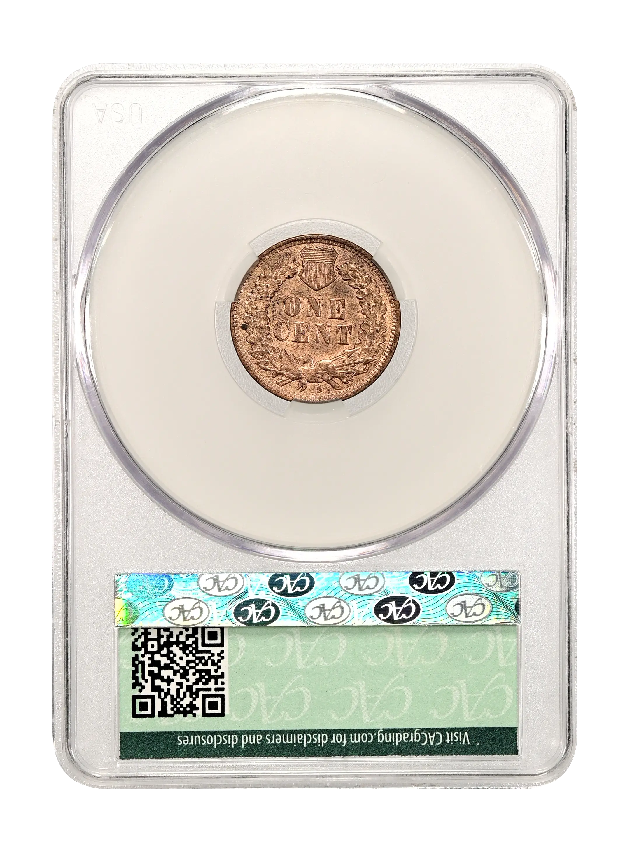 Reverse: The reverse bears the denomination of ONE CENT in the center surrounded by a wreath bearing a ribbon with arrows tied in at the bottom center. The 'S' minmark is positioned at the bottom under the ribbon.