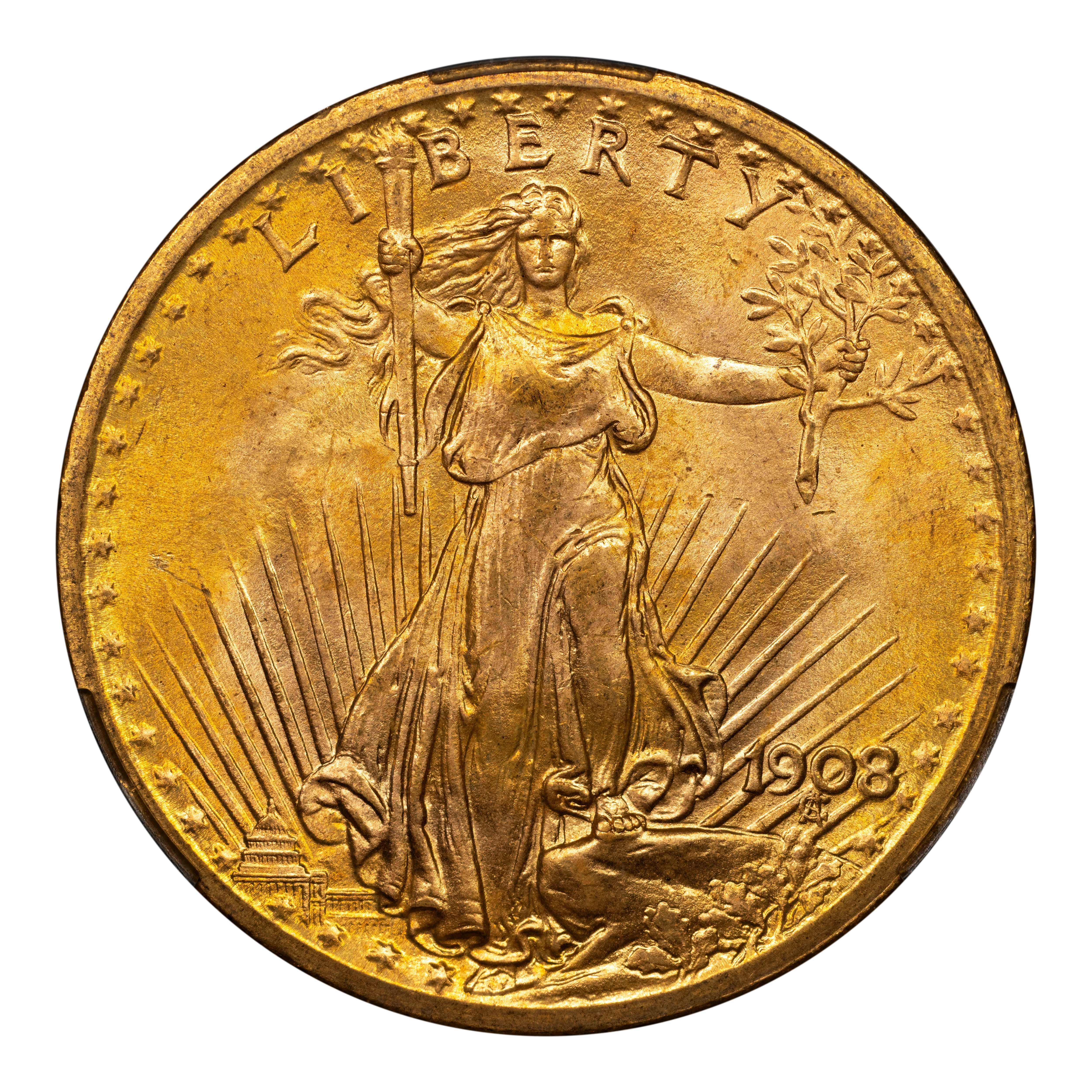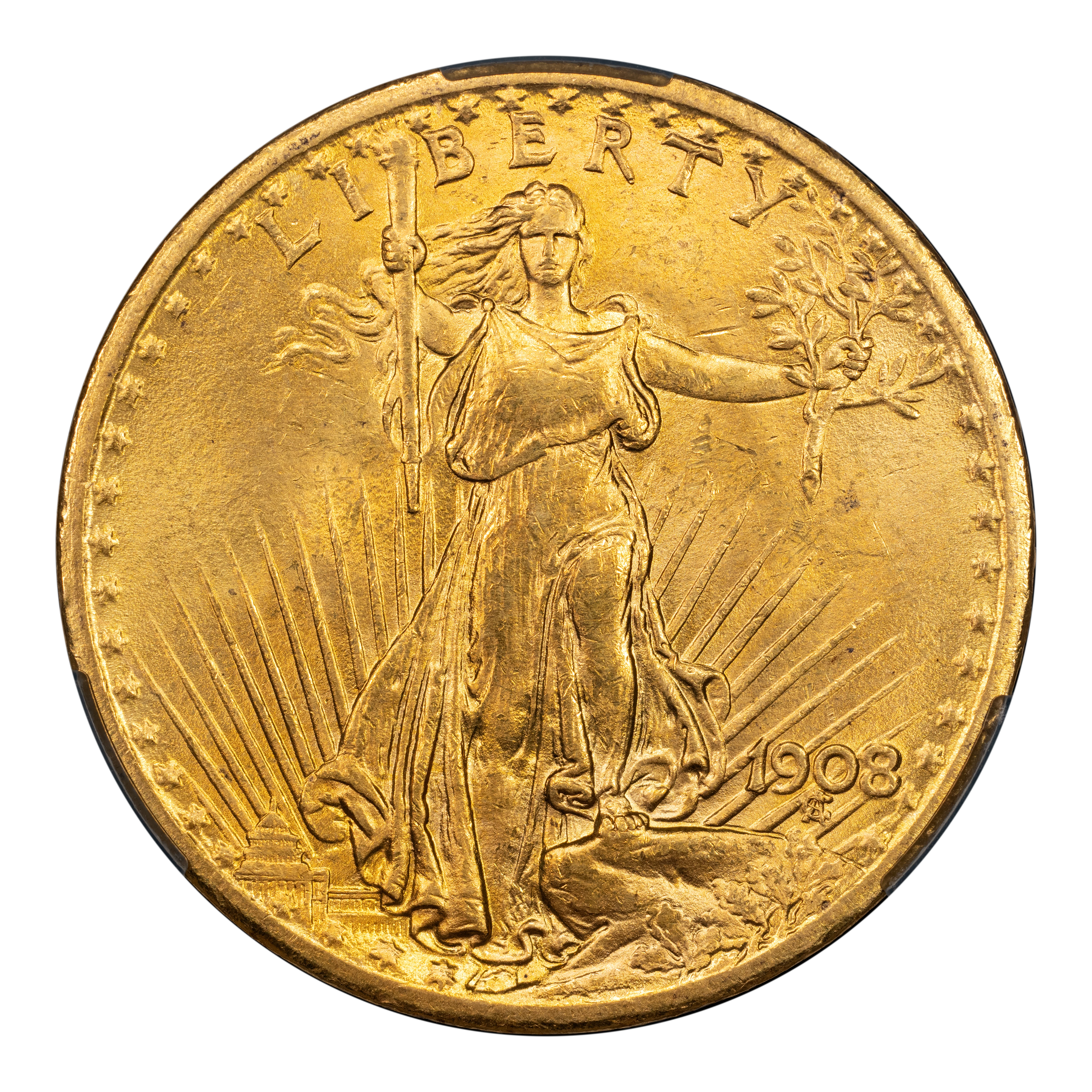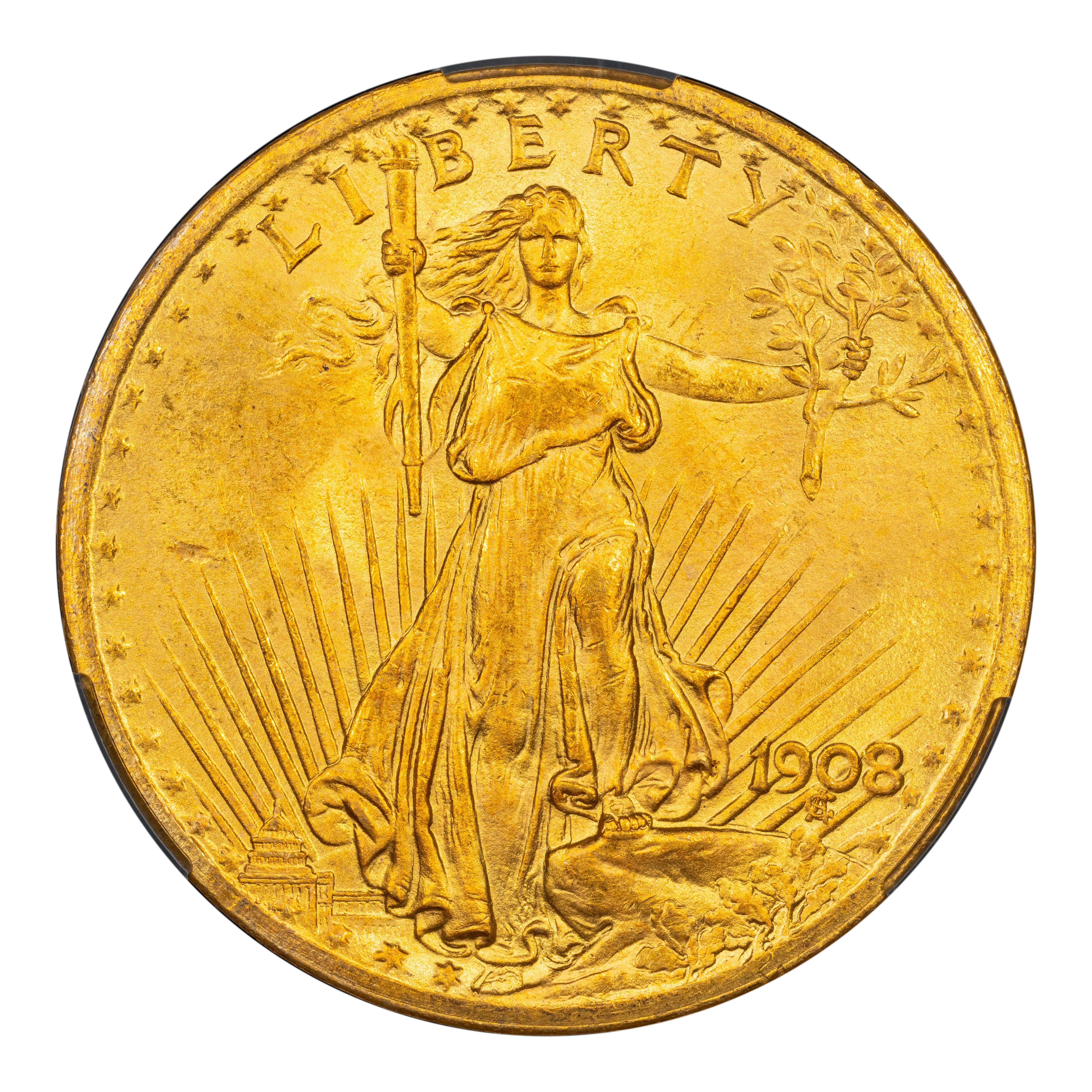 The 1908 No Motto is the last of the No motto Saint-Gaudens $20 which were retrofitted with the motto IN GOD WE TRUST later in 1908. The 1908 No Motto $20s are very common, certainly more so than even the 1907 No motto saints which are widely available. The 1908 No Motto double eagle is one of the most common of the entire series and thus are often sought by collectors who are building gold type collections. This piece is easily obtainable through the Gem Uncirculated grade range, with a handful known even in MS69.