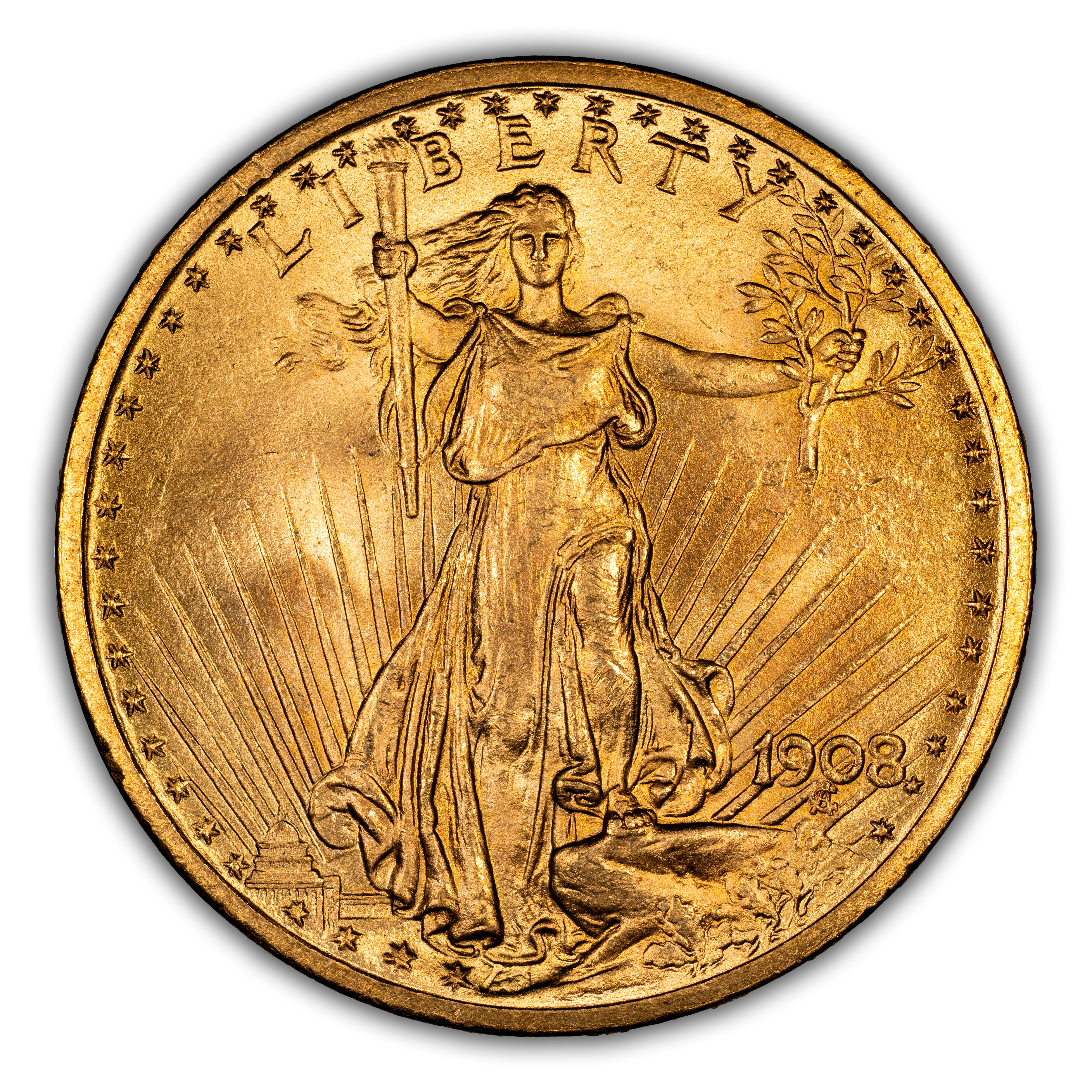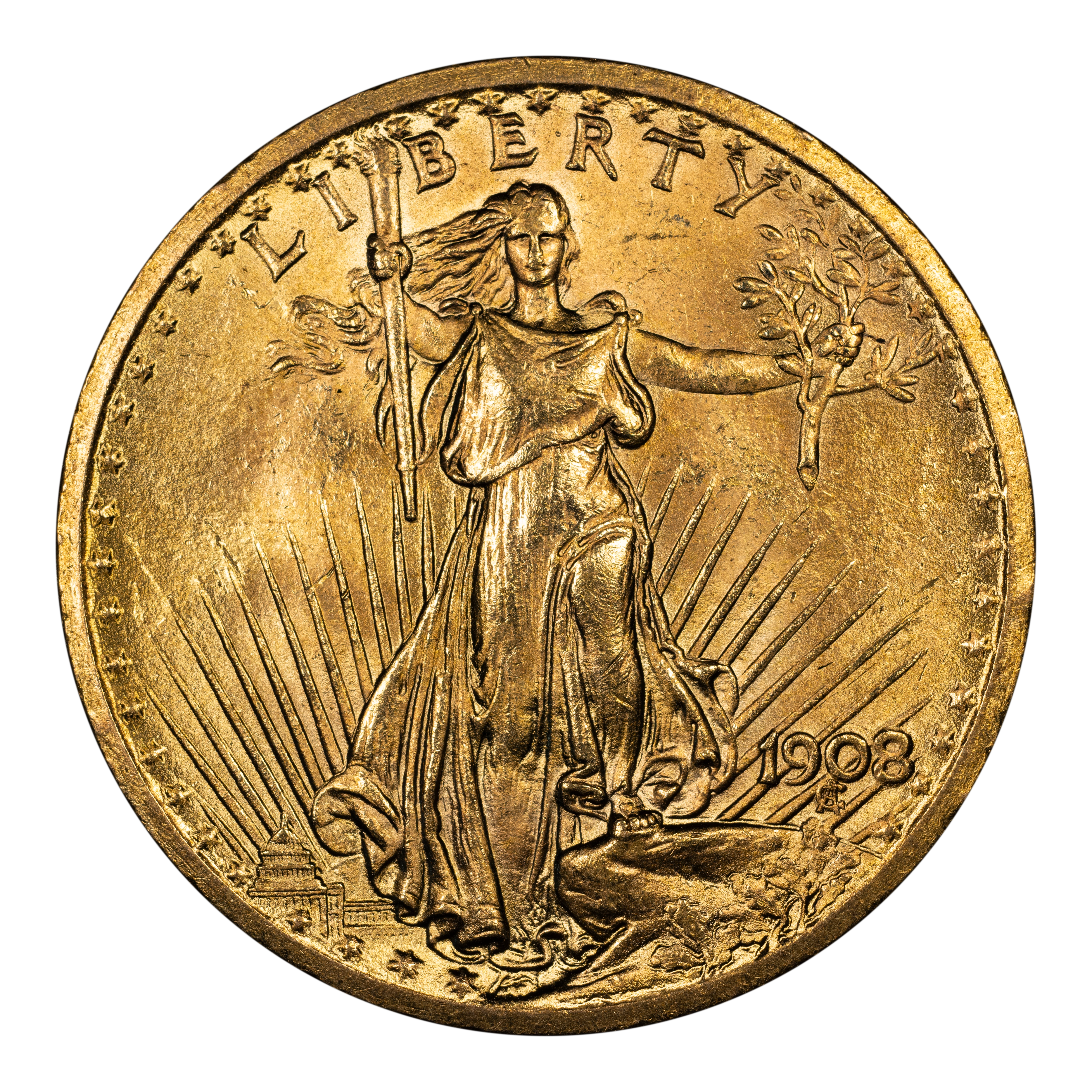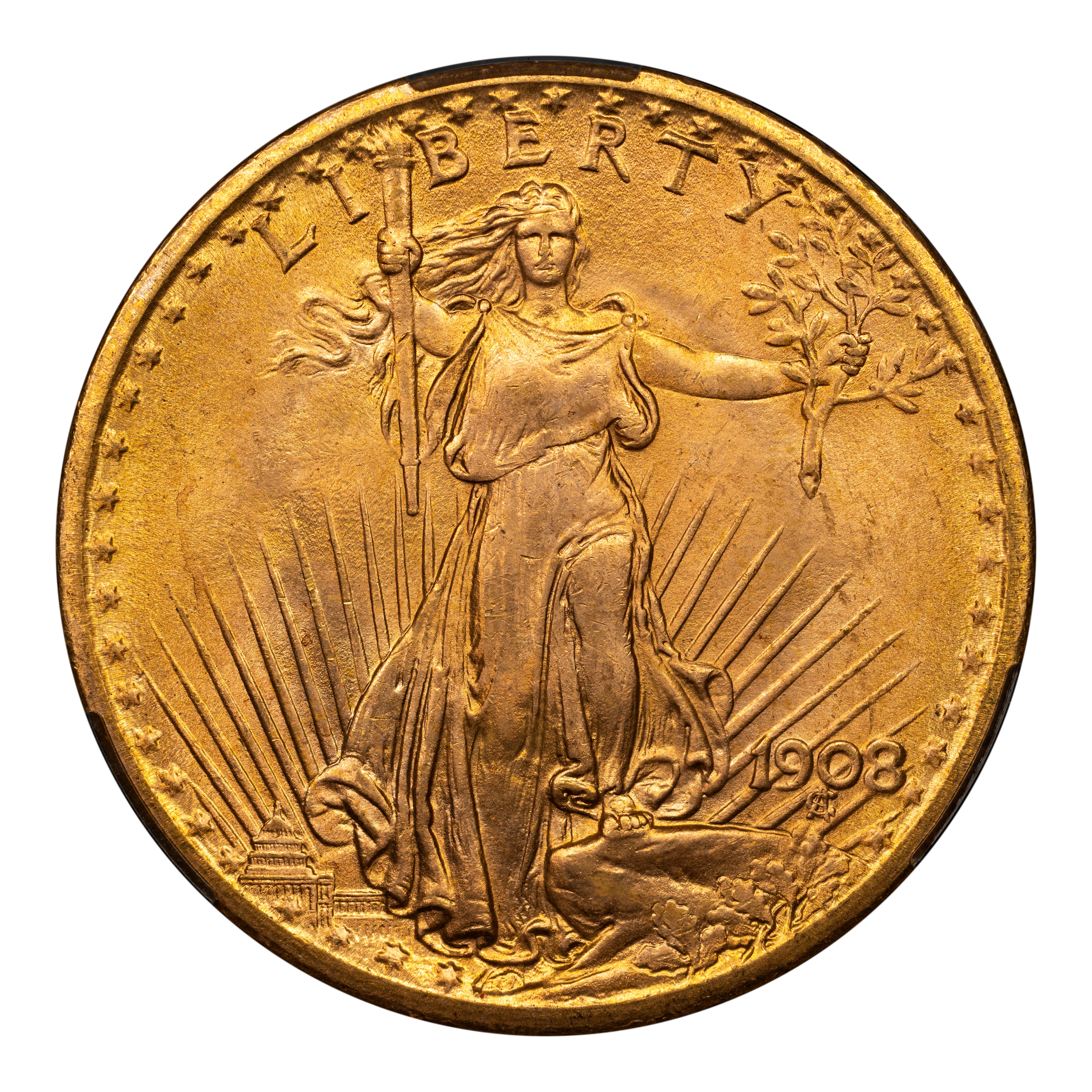 The 1908 No Motto is the last of the No motto Saint-Gaudens $20 which were retrofitted with the motto IN GOD WE TRUST later in 1908. The 1908 No Motto $20s are very common, certainly more so than even the 1907 No motto saints which are widely available. The 1908 No Motto double eagle is one of the most common of the entire series and thus are often sought by collectors who are building gold type collections. This piece is easily obtainable through the Gem Uncirculated grade range, with a handful known even in MS69.