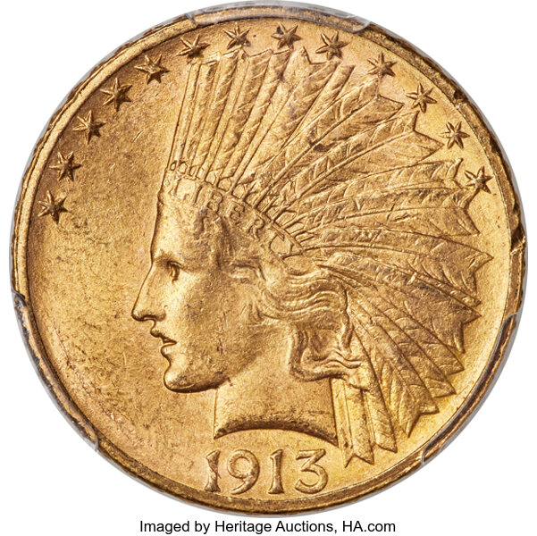 Reverse: The reverse features a majestic eagle perched atop a branch, holding an olive branch in its talons. The words UNITED STATES oF AMERICA, E PLURIBUS UNUM, and TEN DOLLARS appear at the top periphery, right of the eagle's neck, and the bottom periphery, respectively.