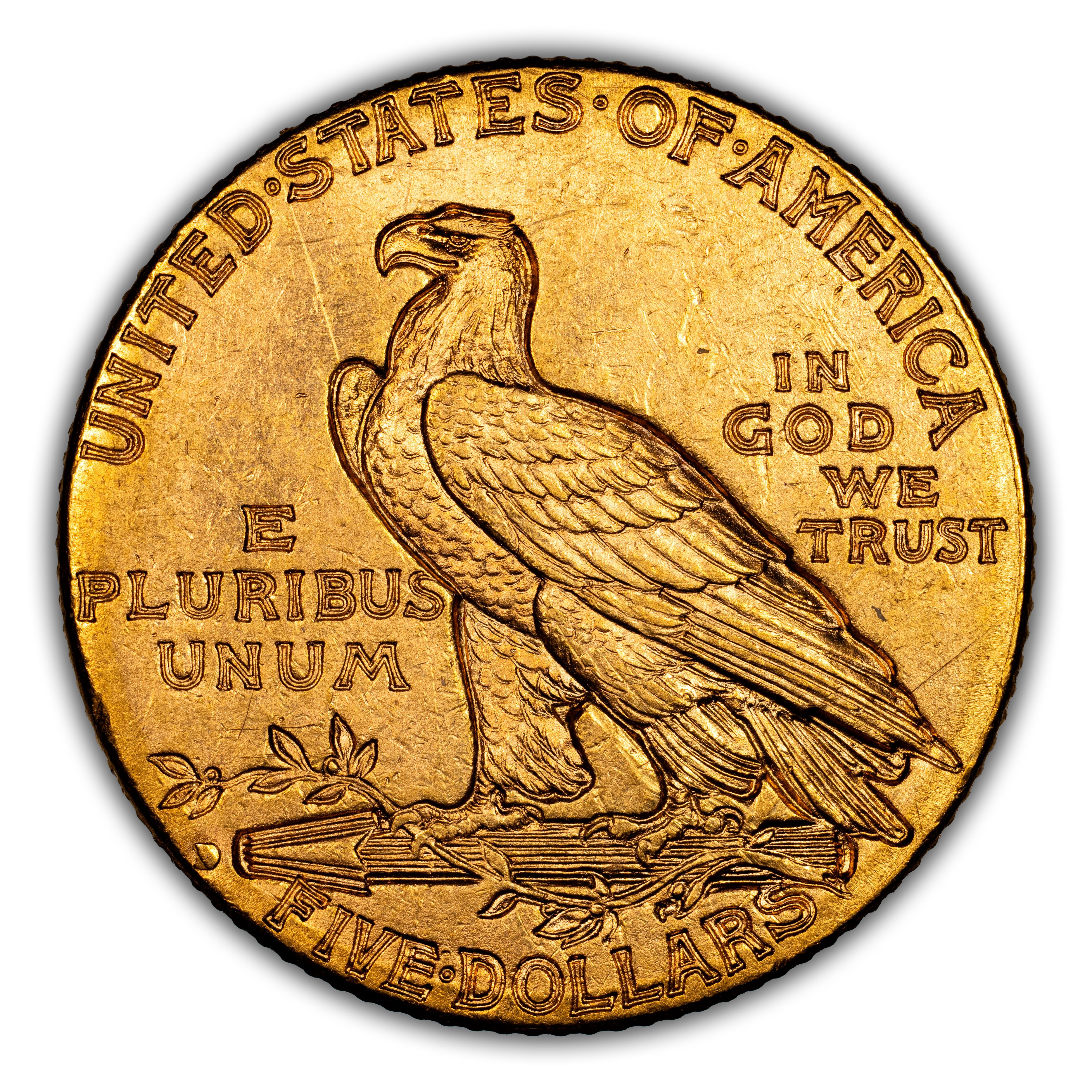 Reverse: The traditional American eagle struck incuse in the center with the words, UNITED STATES OF AMERICA at top, E PLURIBUS UNUM left of the eagle, and IN GOD WE TRUST to the right of the eagle. The denomination 5 DOLLARS struck below the eagle.