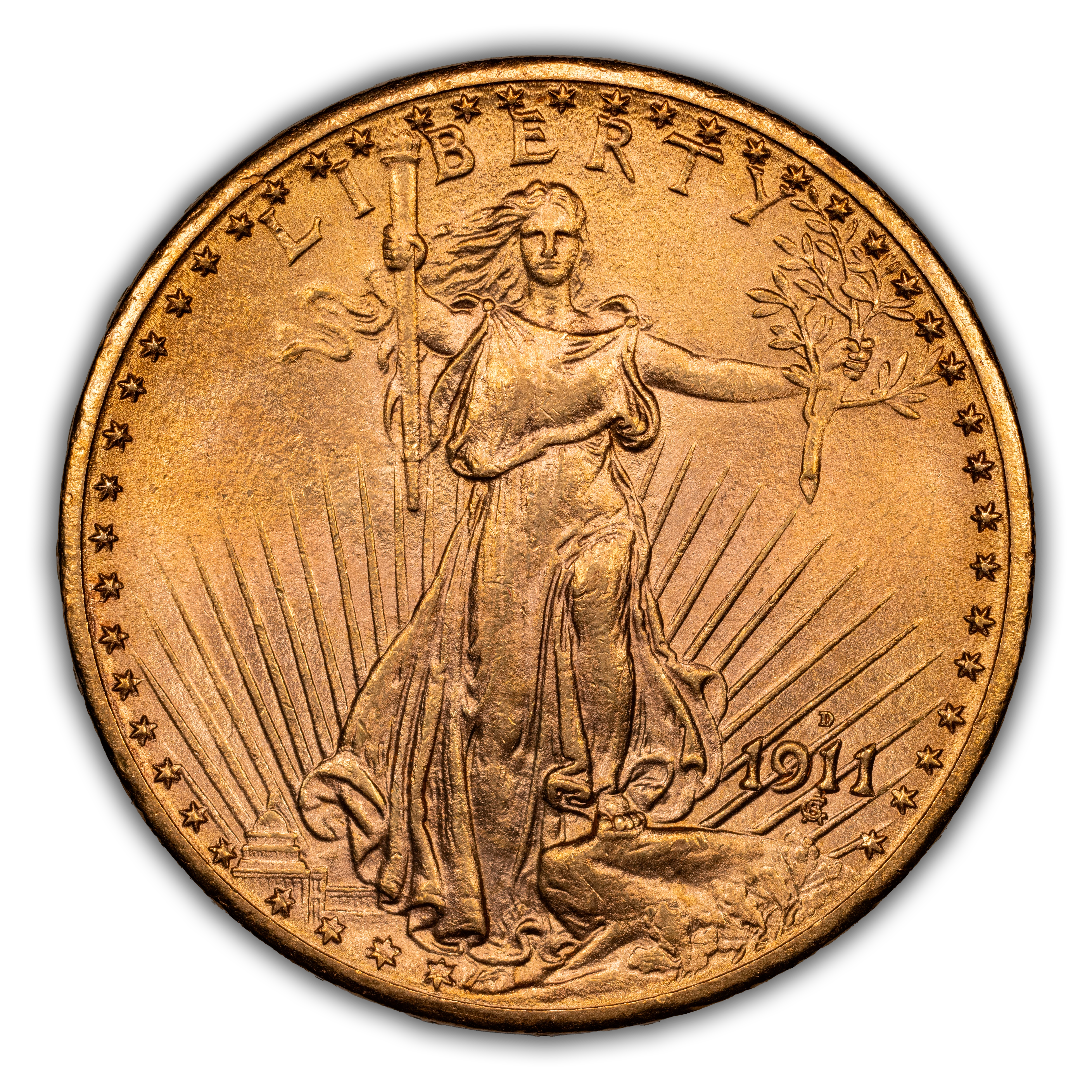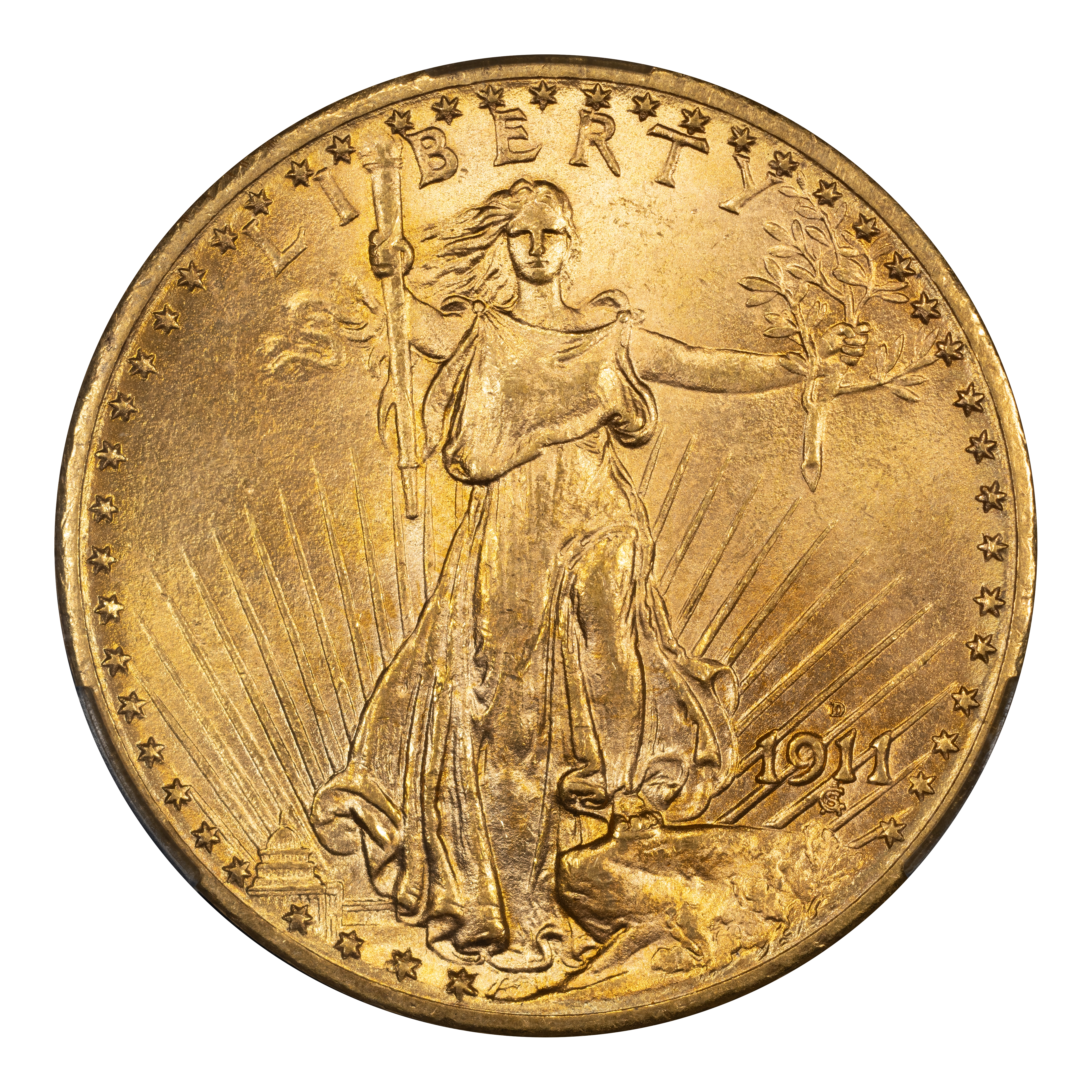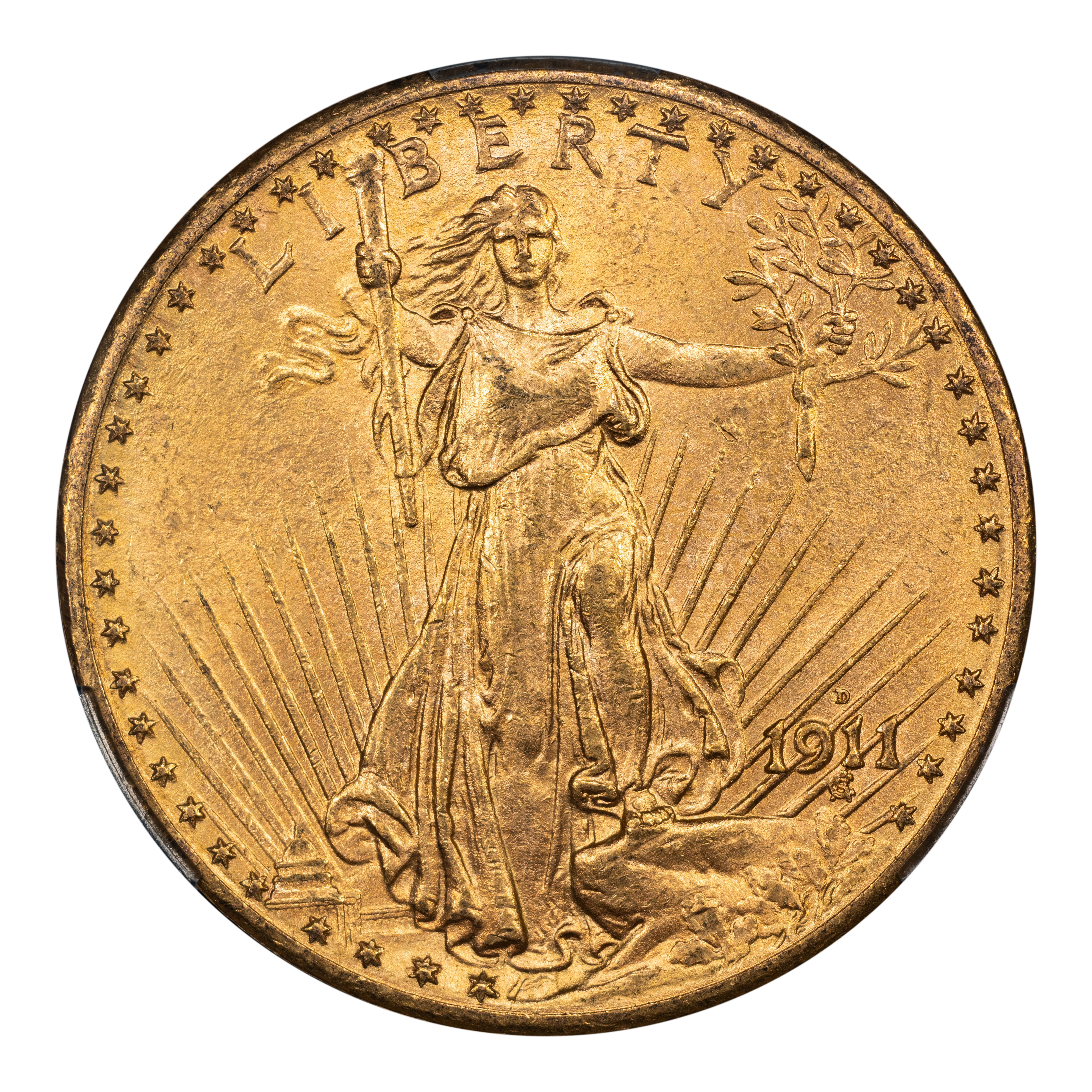 The 1911-D Saint-Gaudens $20 is one of the more common dates in the series, proving widely available in both circulated and uncirculated grades. Most examples show sharp strike, decent luster, and nice color, and there are many high-end examples known. Some 1911-D Saints showcase a double-punched mintmark, and these are popular with series enthusiasts.