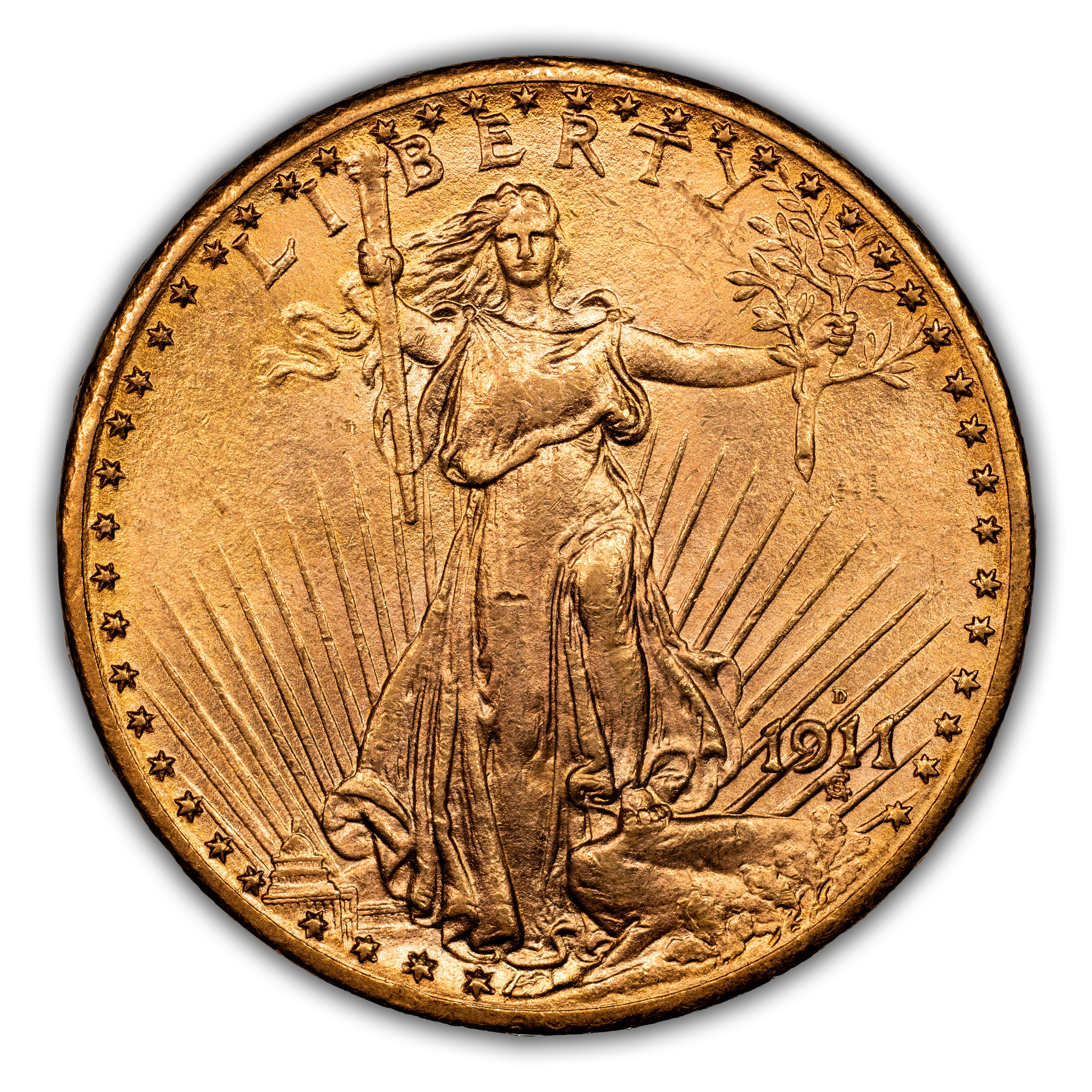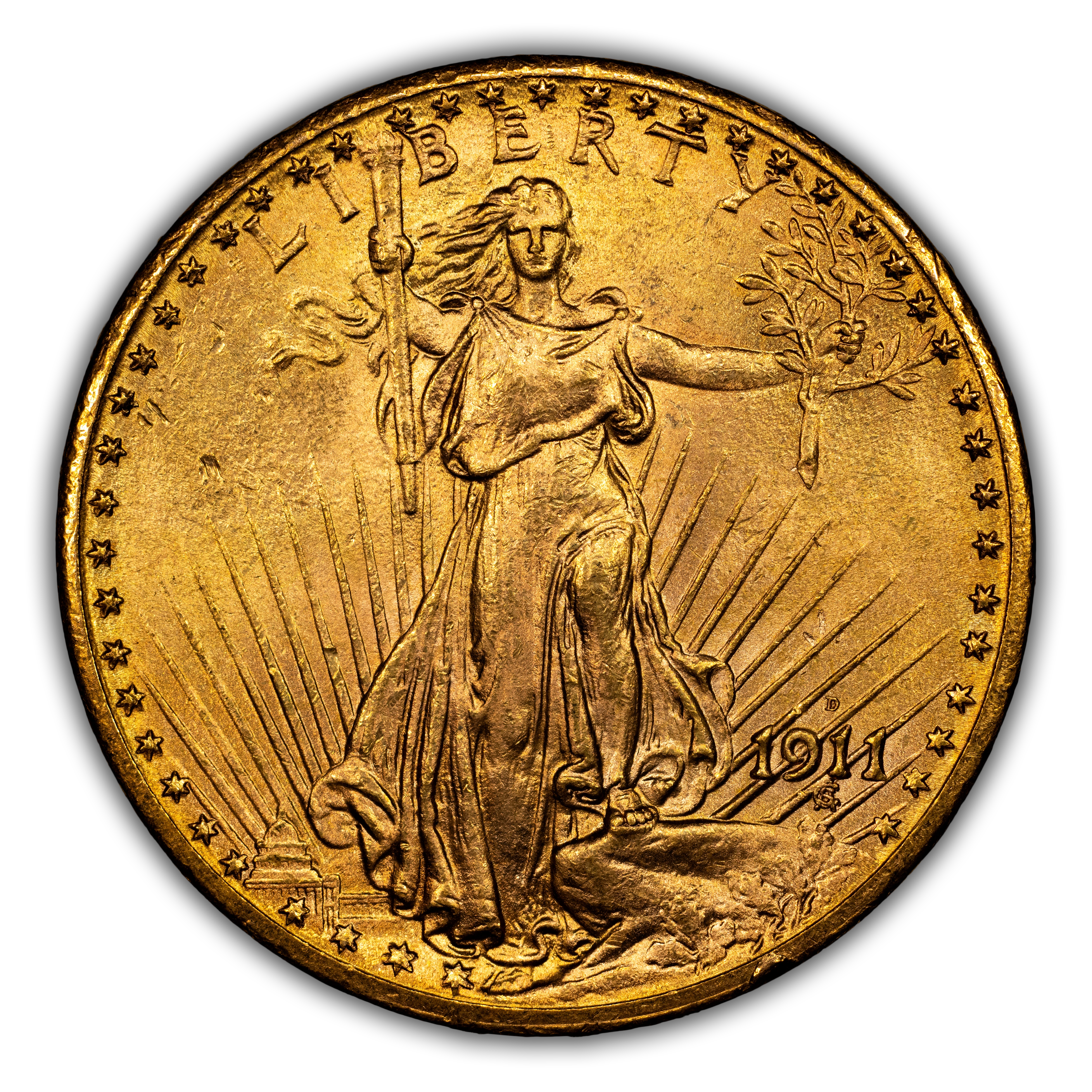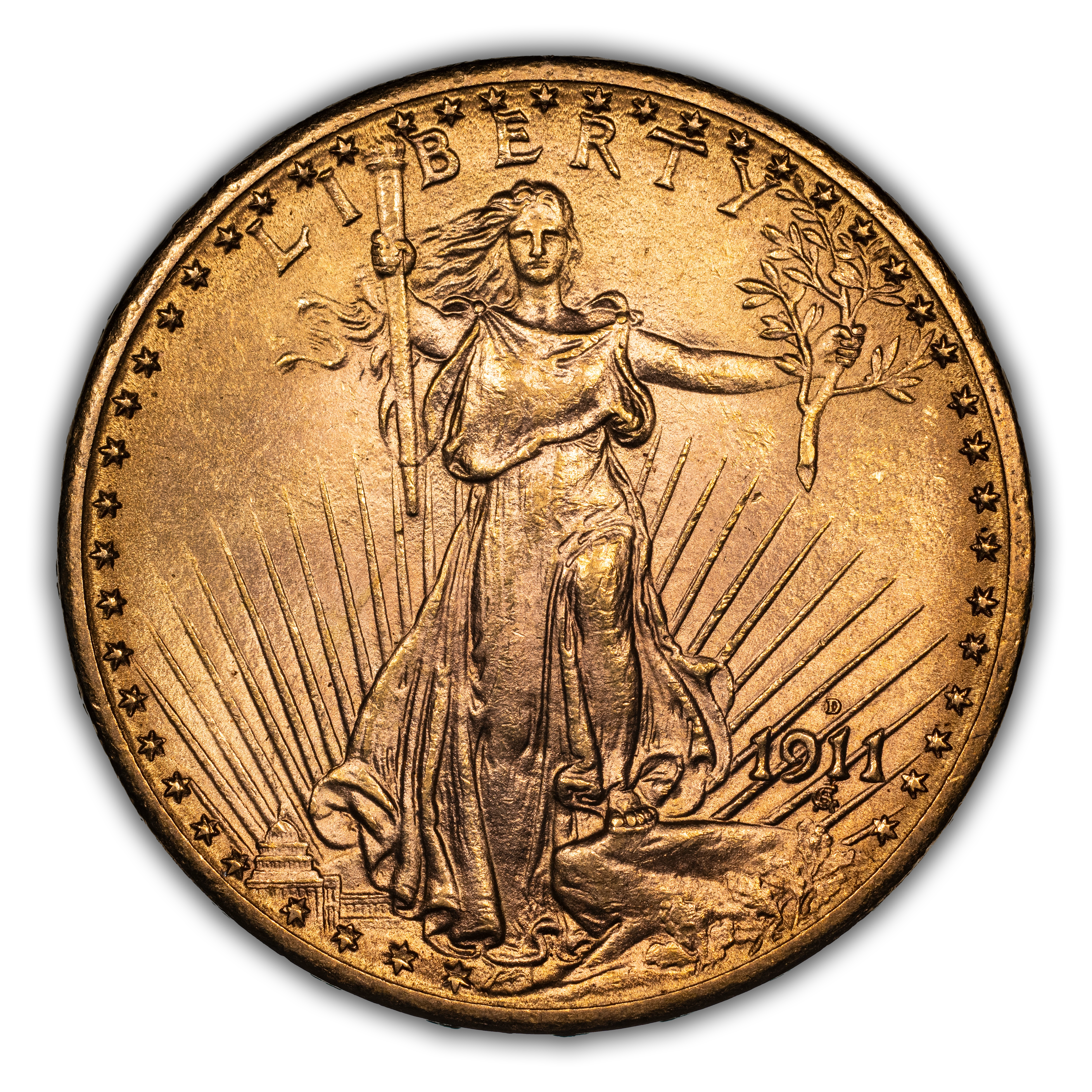 The 1911-D Saint-Gaudens $20 is one of the more common dates in the series, proving widely available in both circulated and uncirculated grades. Most examples show sharp strike, decent luster, and nice color, and there are many high-end examples known. Some 1911-D Saints showcase a double-punched mintmark, and these are popular with series enthusiasts.