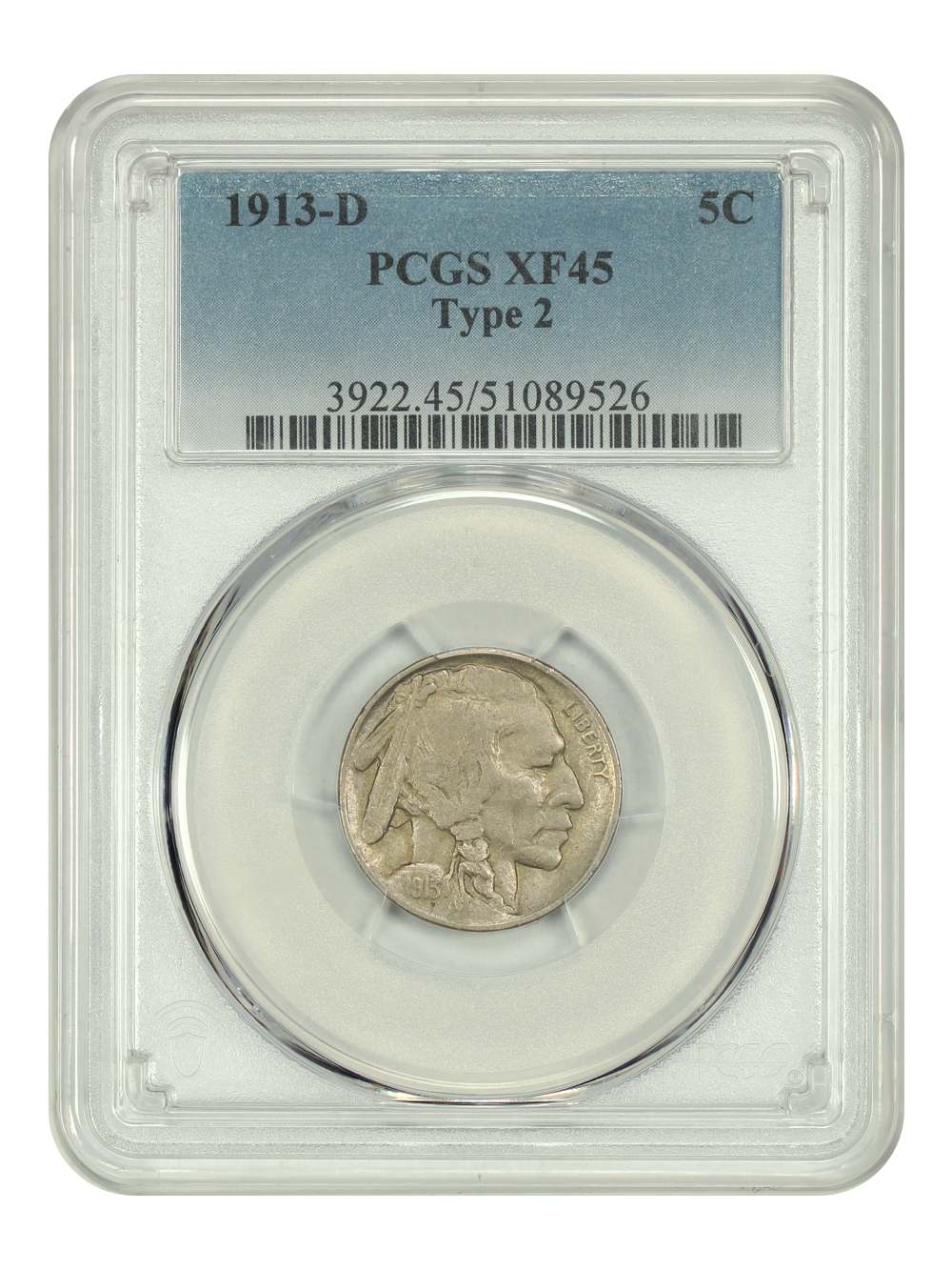 Reverse: A full portrait of the bison, Black Diamond, with the words UNITED STATES oF AMERICA at the top periphery with the motto E PLURIBUS UNUM just underneath. The denomination FIVE CENTS is spelled out at the bottom. For the Type 1, the denomination is embossed on a flat surface.