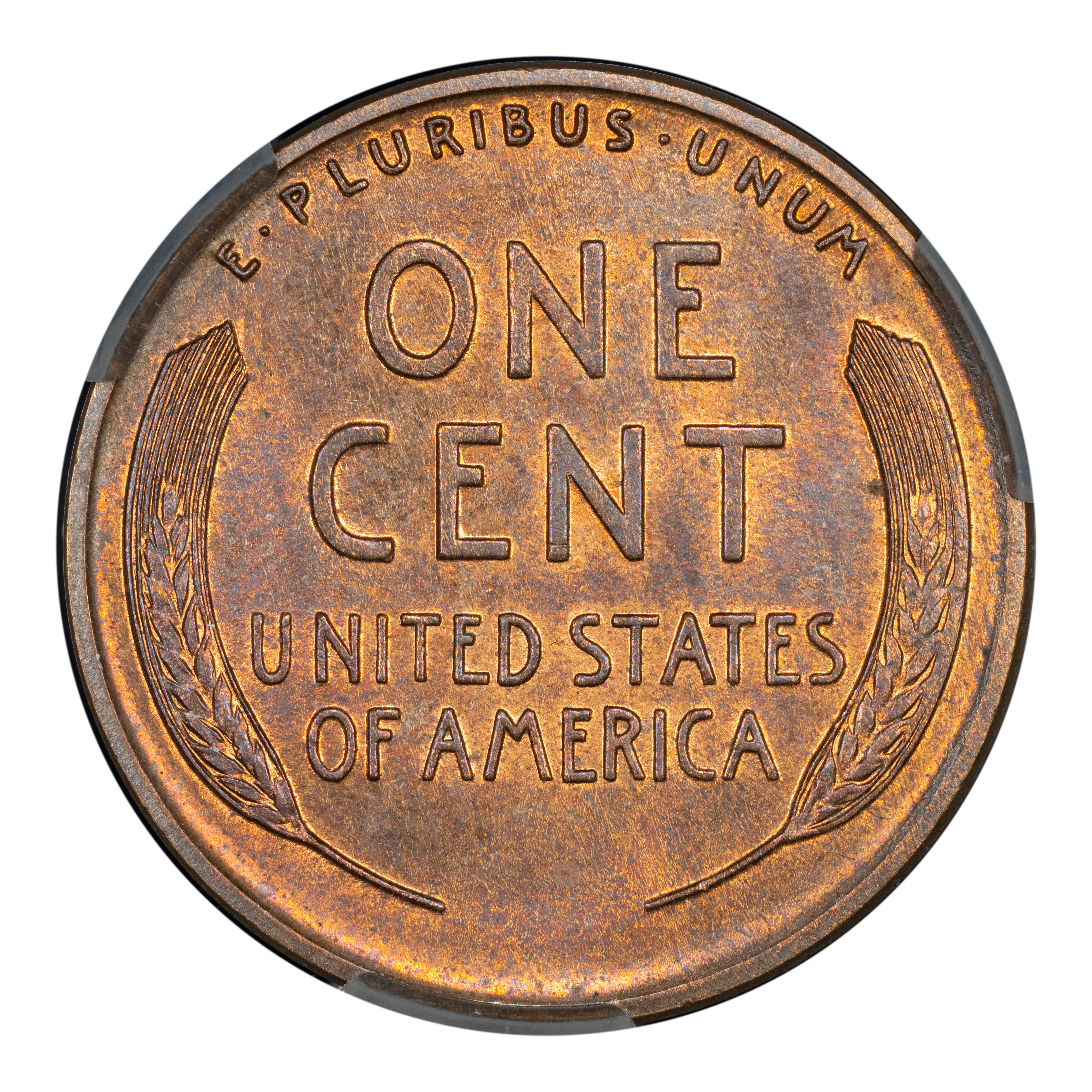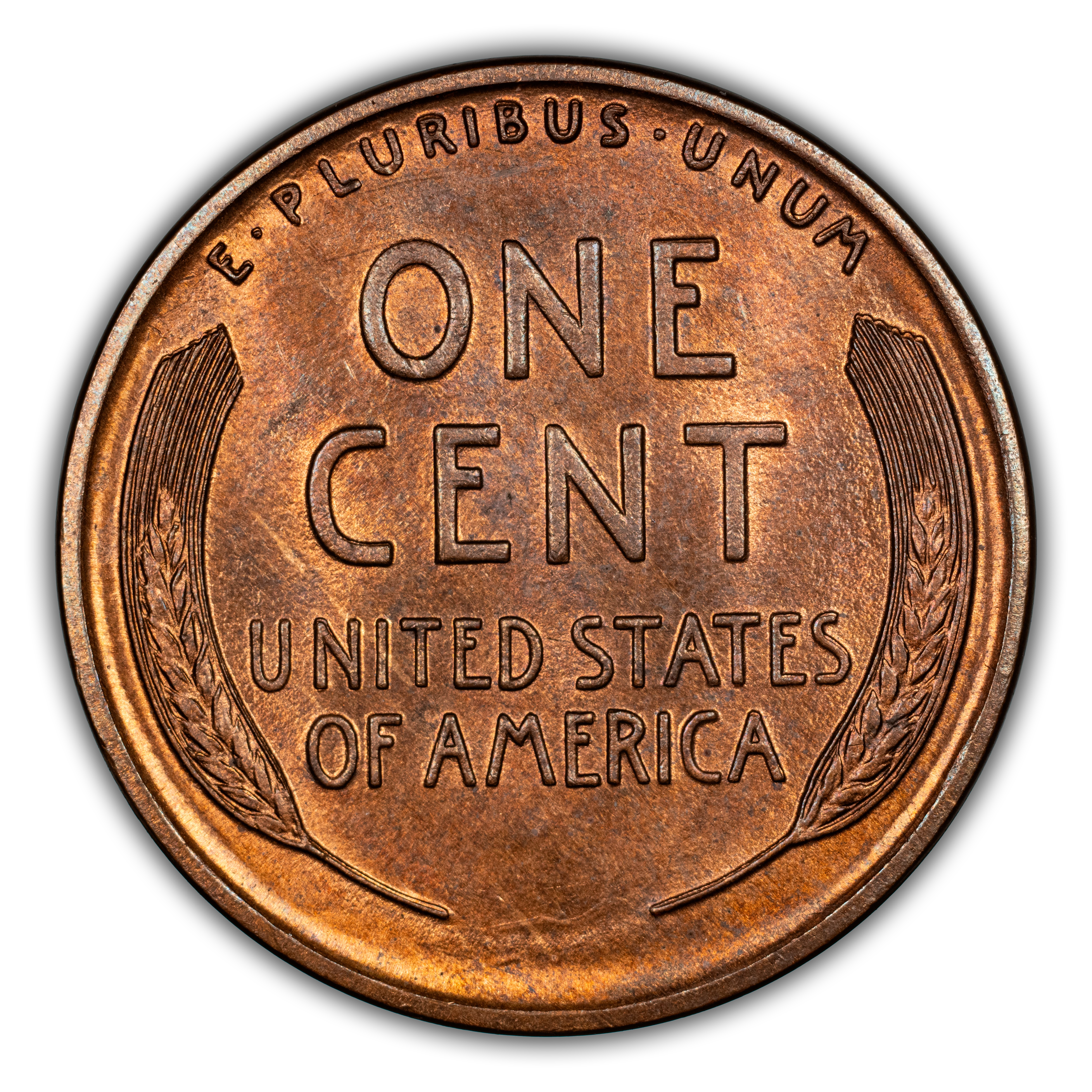 Reverse: Wheat ears flanking the words ONE CENT, UNITED STATES OF AMERICA. The motto E PLURIBUS UNUM on the top perimeter.