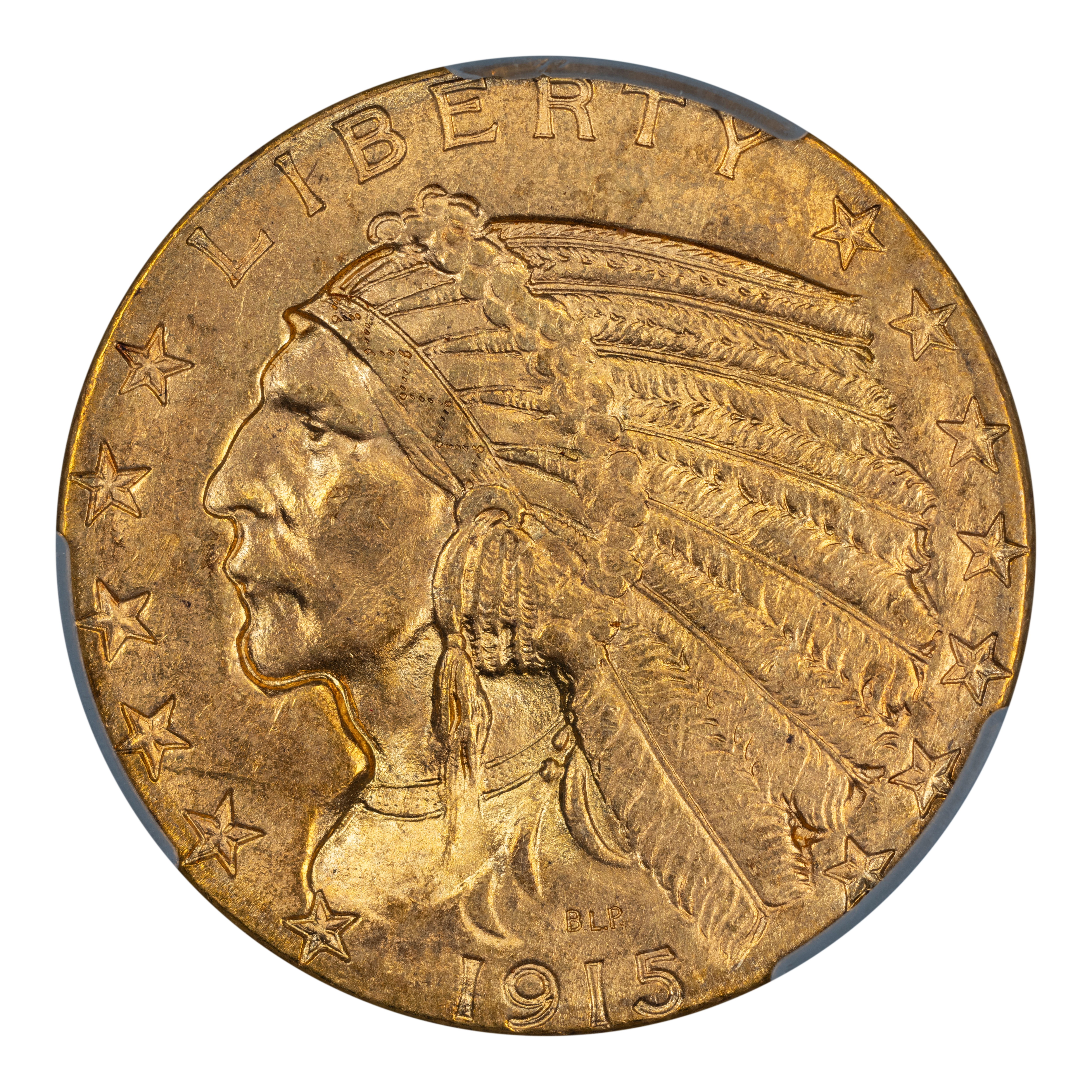 Reverse: The traditional American eagle struck incuse in the center with the words, UNITED STATES OF AMERICA at top, E PLURIBUS UNUM left of the eagle, and IN GOD WE TRUST to the right of the eagle. The denomination 5 DOLLARS struck below the eagle.