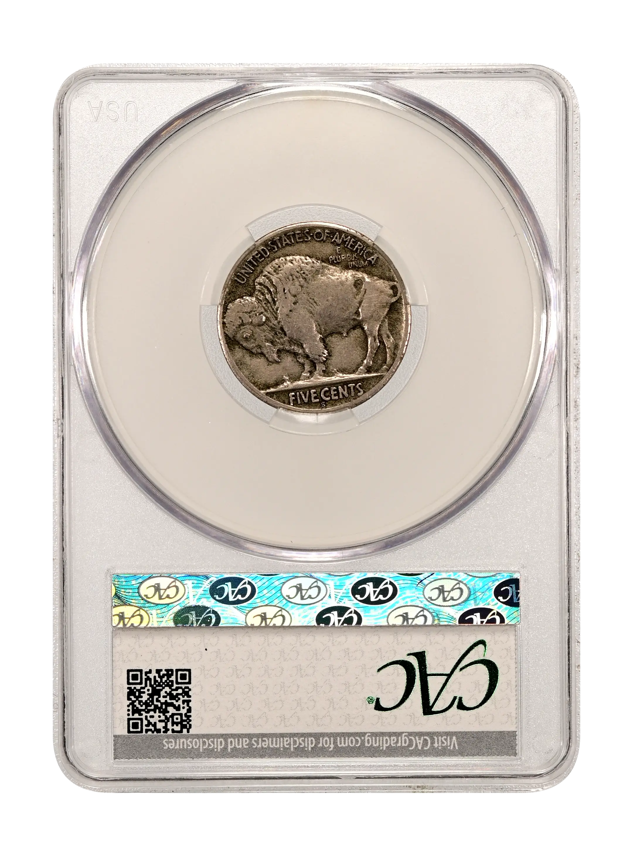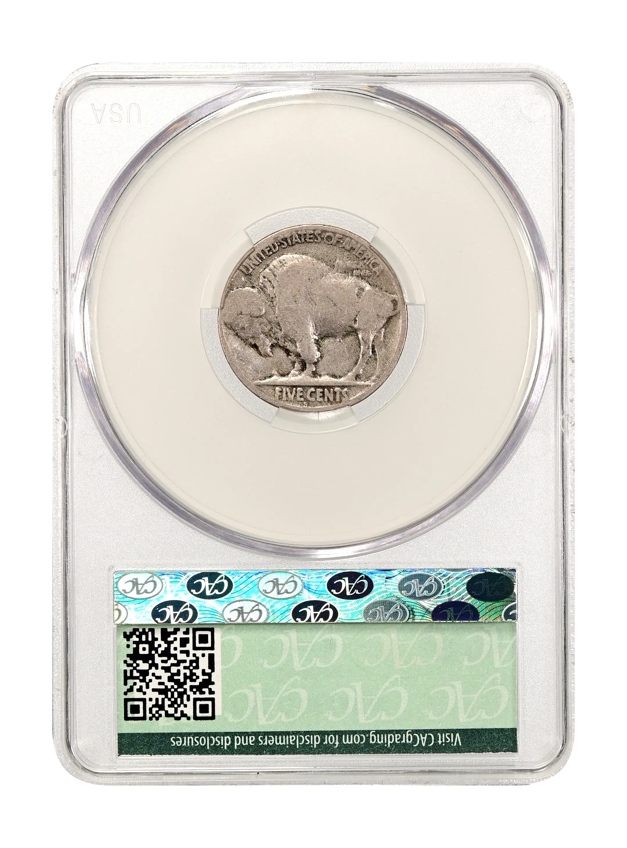 Reverse: A full portrait of the bison, Black Diamond, with the words UNITED STATES oF AMERICA at the top periphery with the motto E PLURIBUS UNUM just underneath. The denomination FIVE CENTS is spelled out at the bottom. For the Type 1, the denomination is embossed on a flat surface.