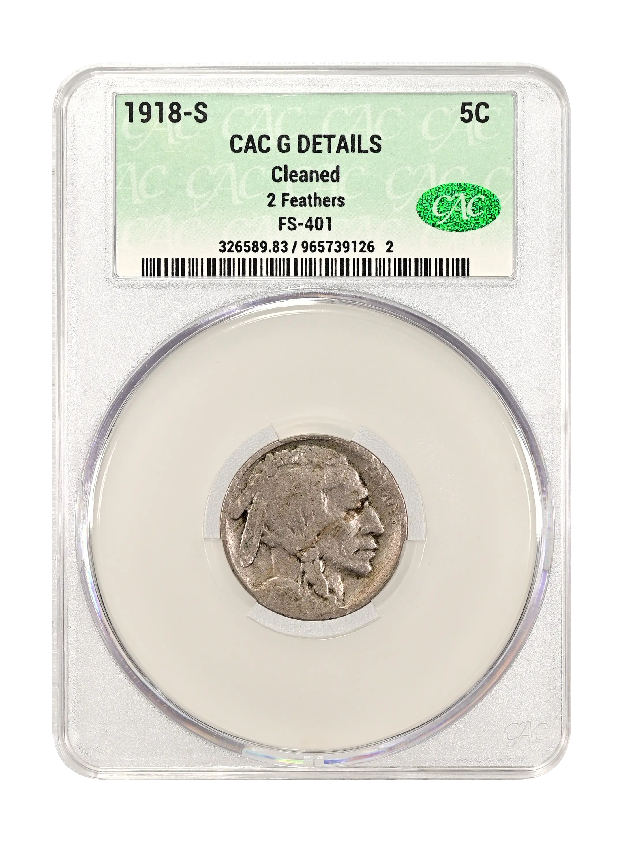 1918-S 2 Feathers 5c FS-401 CAC G DETAILS