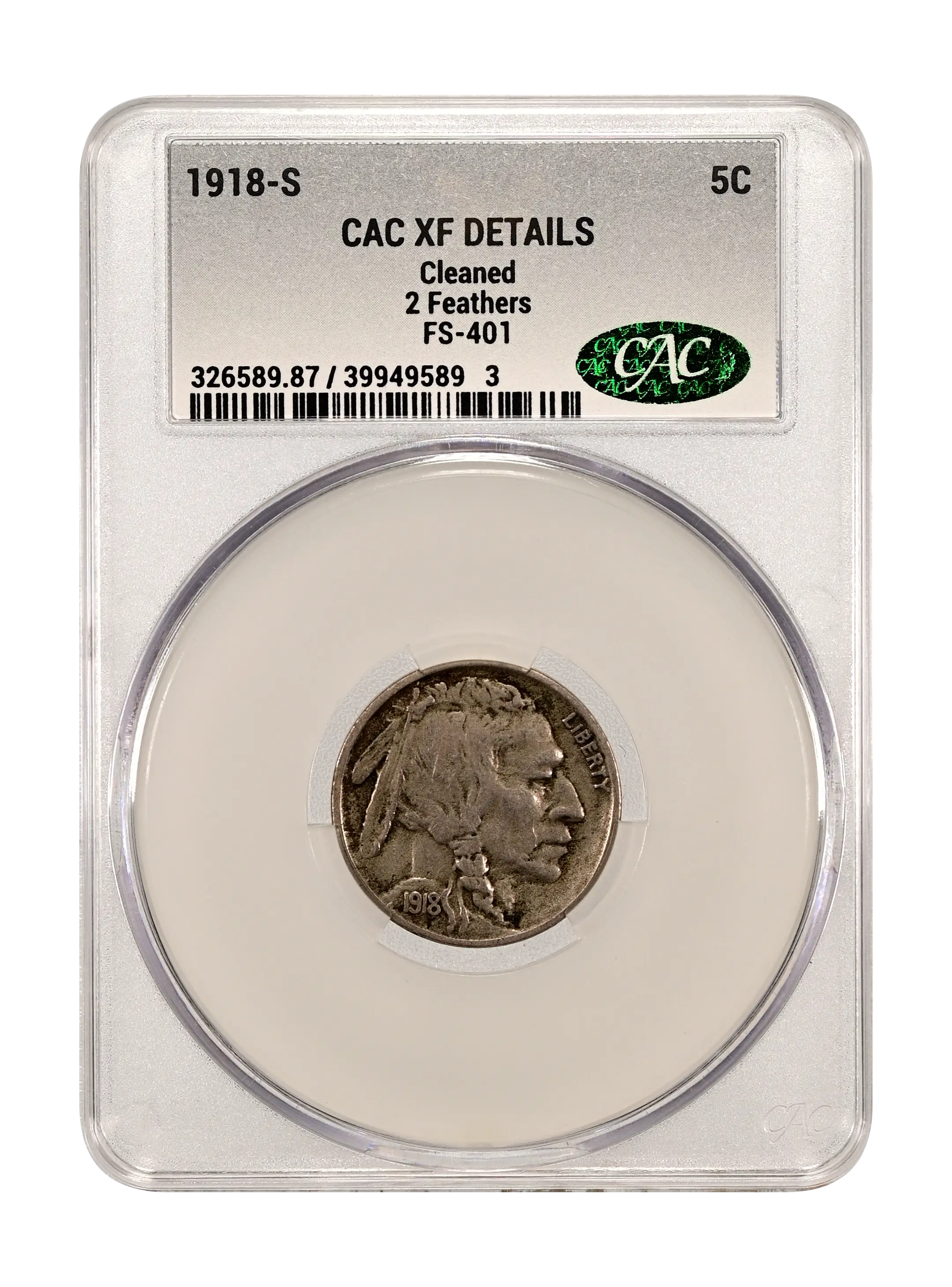 1918-S 2 Feathers 5c FS-401 CAC XF DETAILS