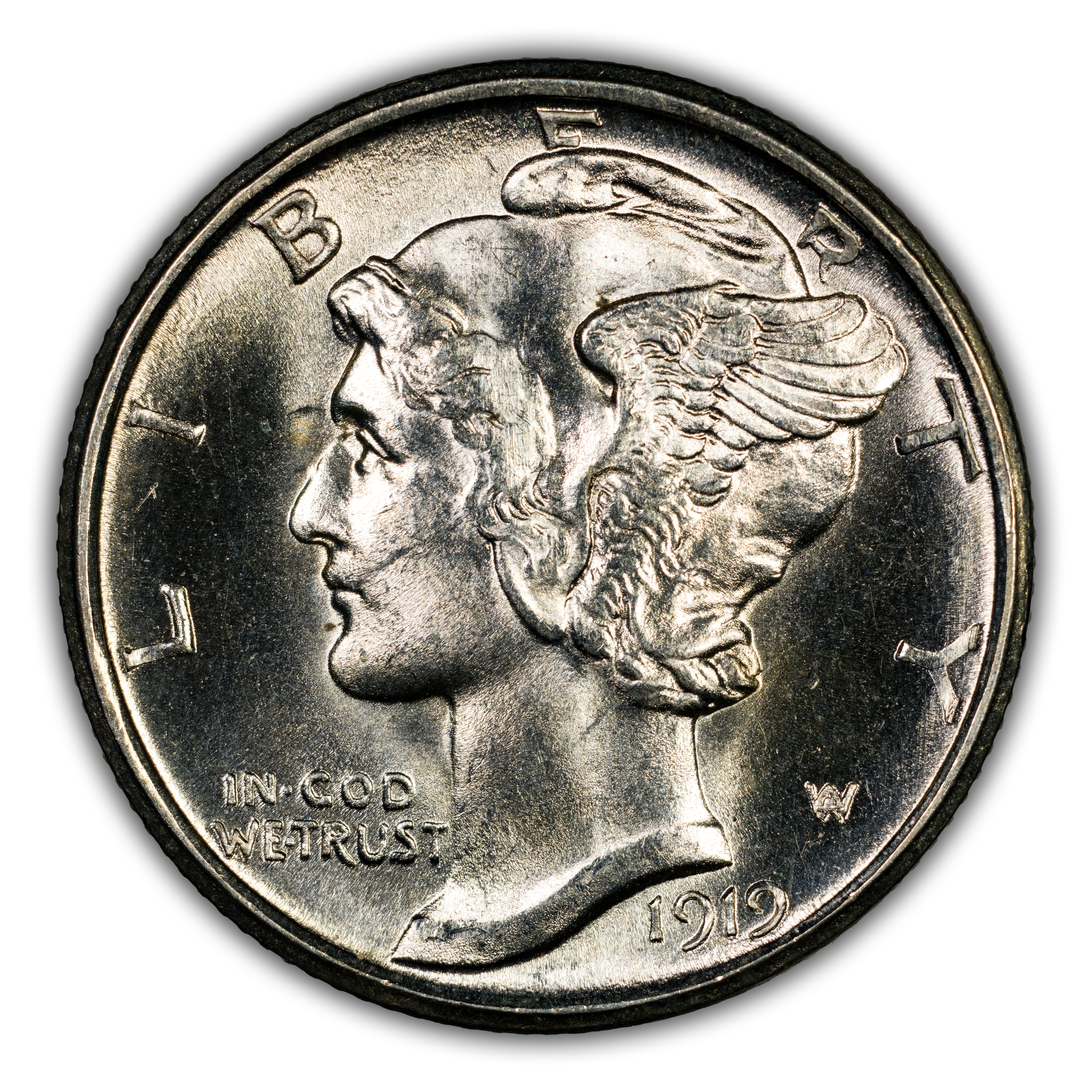 Obverse: Winged Liberty, or Mercury (the Roman god of commerce), is depicted facing left with LIBERTY spelled around the periphery. IN GOD WE TRUST appears left of the neck and the date is positioned just below the bust around 5 o'clock. The designer's initials "AW" appear to the right of the neck.