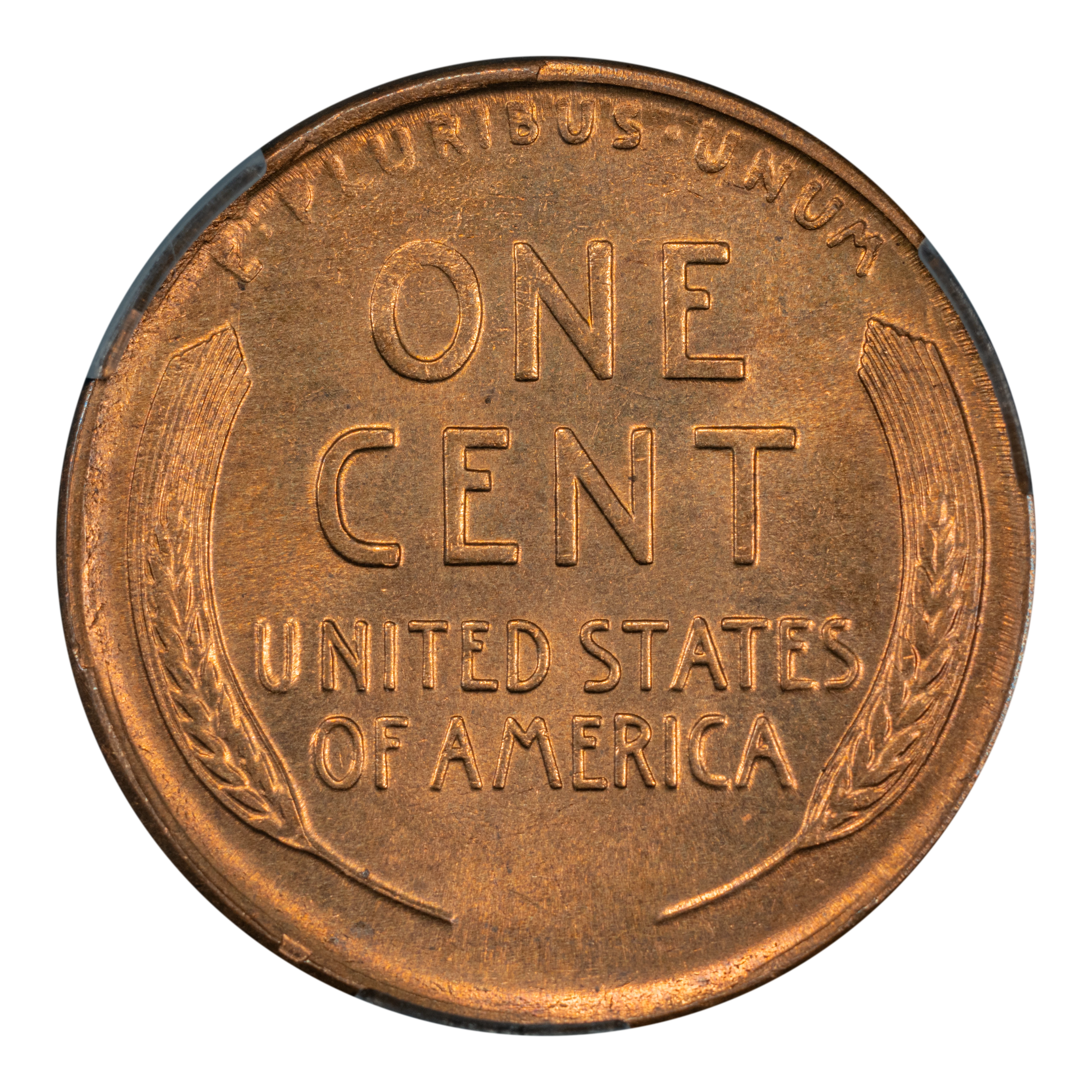 Reverse: Wheat ears flanking the words ONE CENT, UNITED STATES OF AMERICA. The motto E PLURIBUS UNUM on the top perimeter.