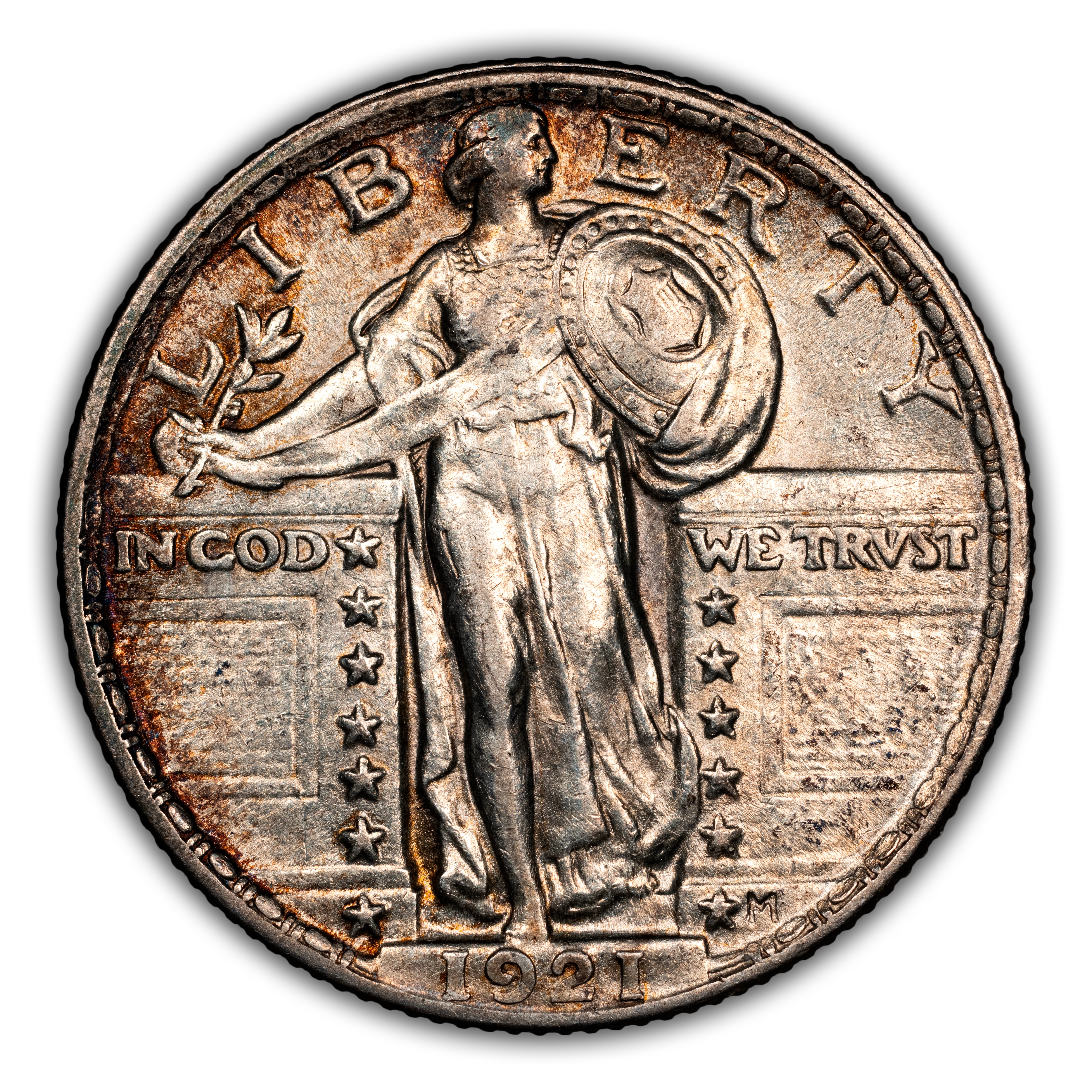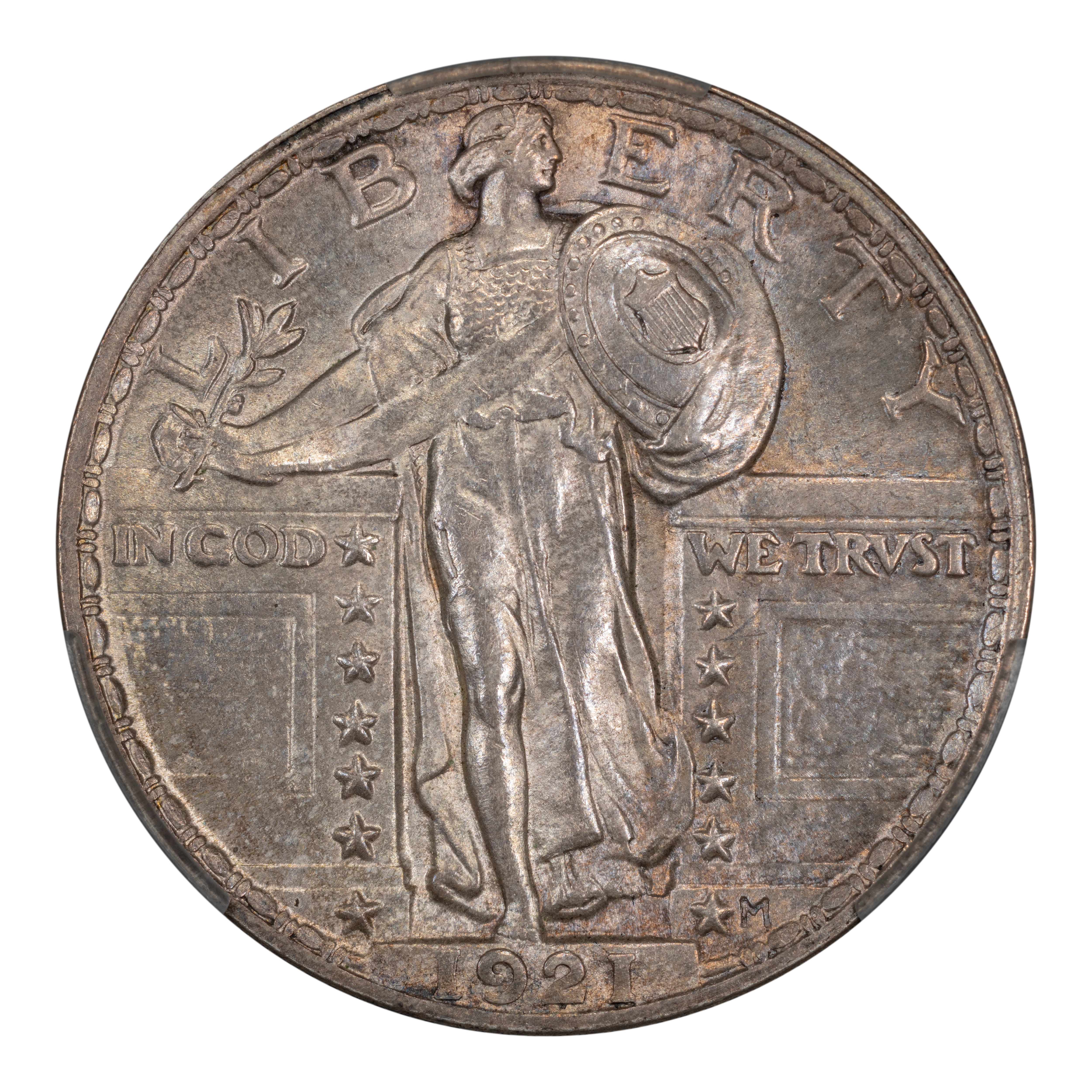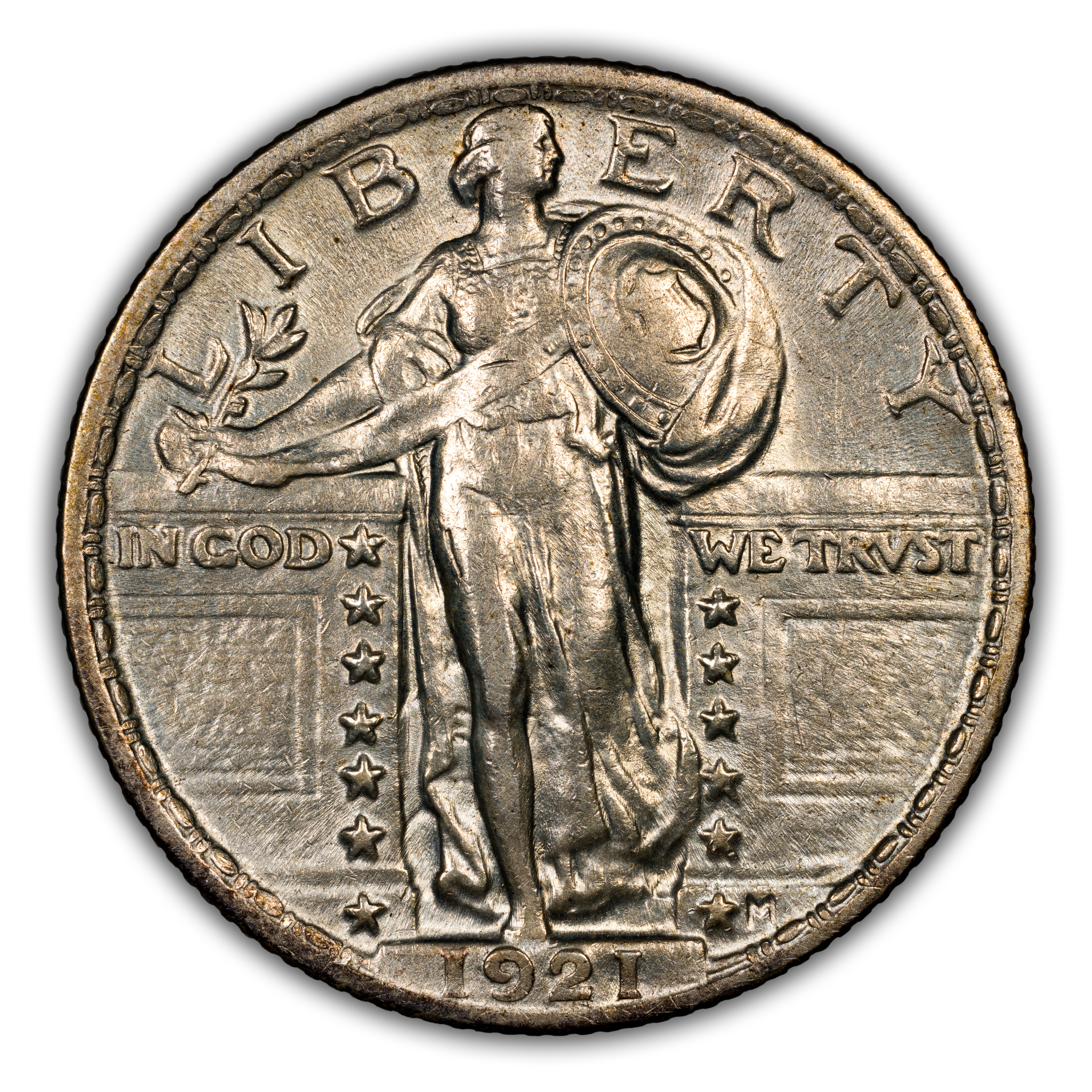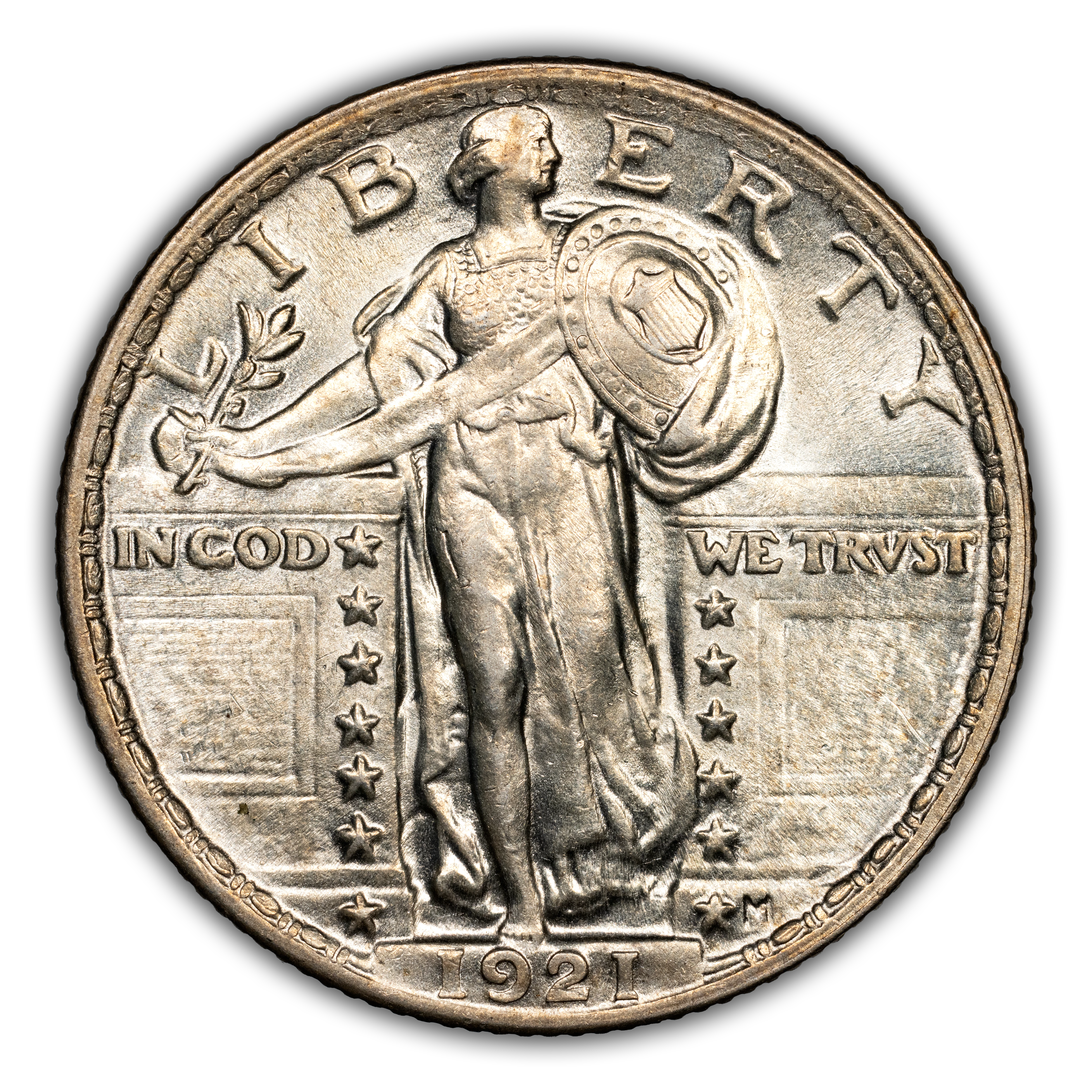 The 1921 Standing Liberty Quarter is a popular key date in the series and possibly the best Philadelphia date of all the Type 2’s. Collectible in all grades with a gradual increase in value from circulated to uncirculated where it becomes truly scarce. Very scarce as a gem in MS65 and MS66, then it takes a jump into MS67 in which that grade or finer is considered rare.