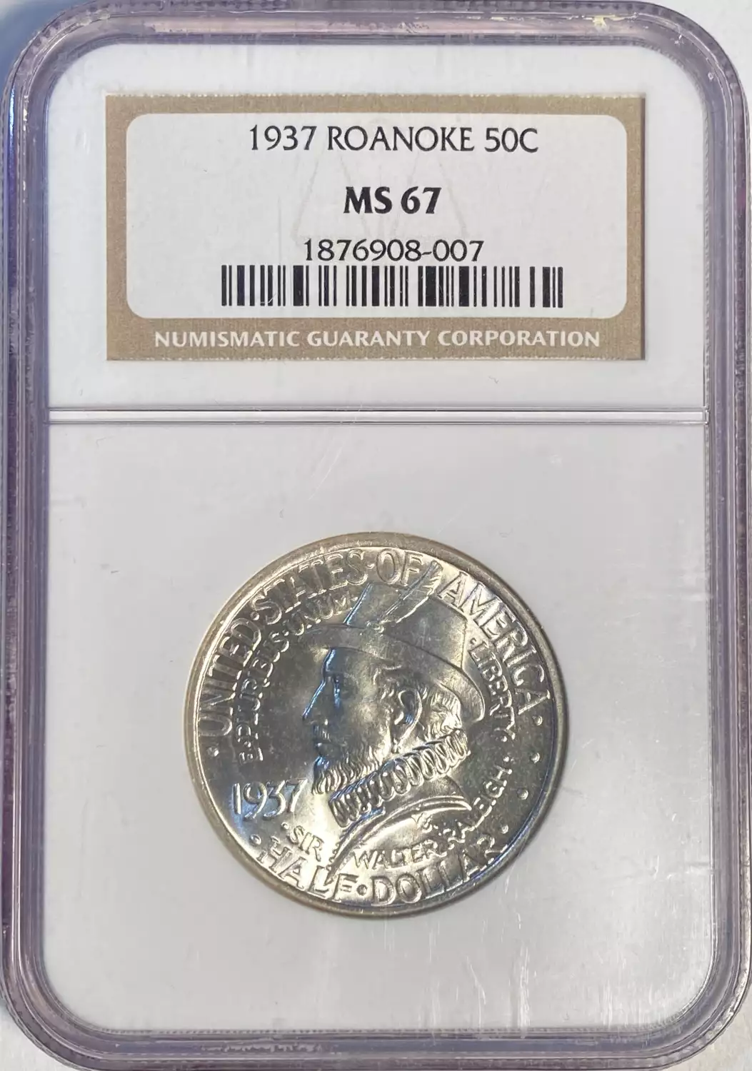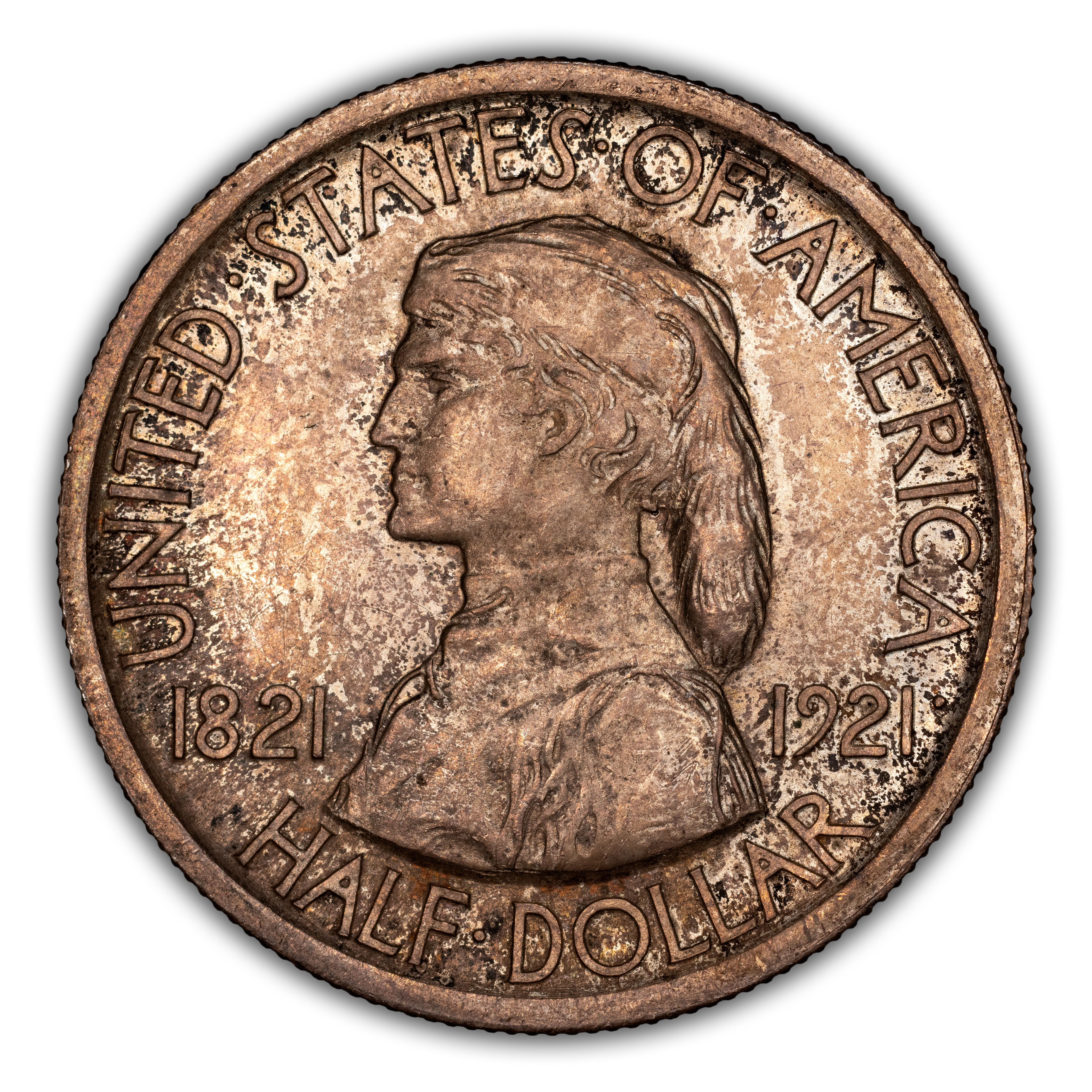 Marking the centennial of Missouri's admission to the Union as the 24th state in 1821, the Missouri commemorative half dollar. Two types were made, including one with the inscription 2*4, a scarcer variety proclaiming Missouri's place as the 24th state. The other type does not have this numerical feature and are referred to simply as plain Missouri halves.