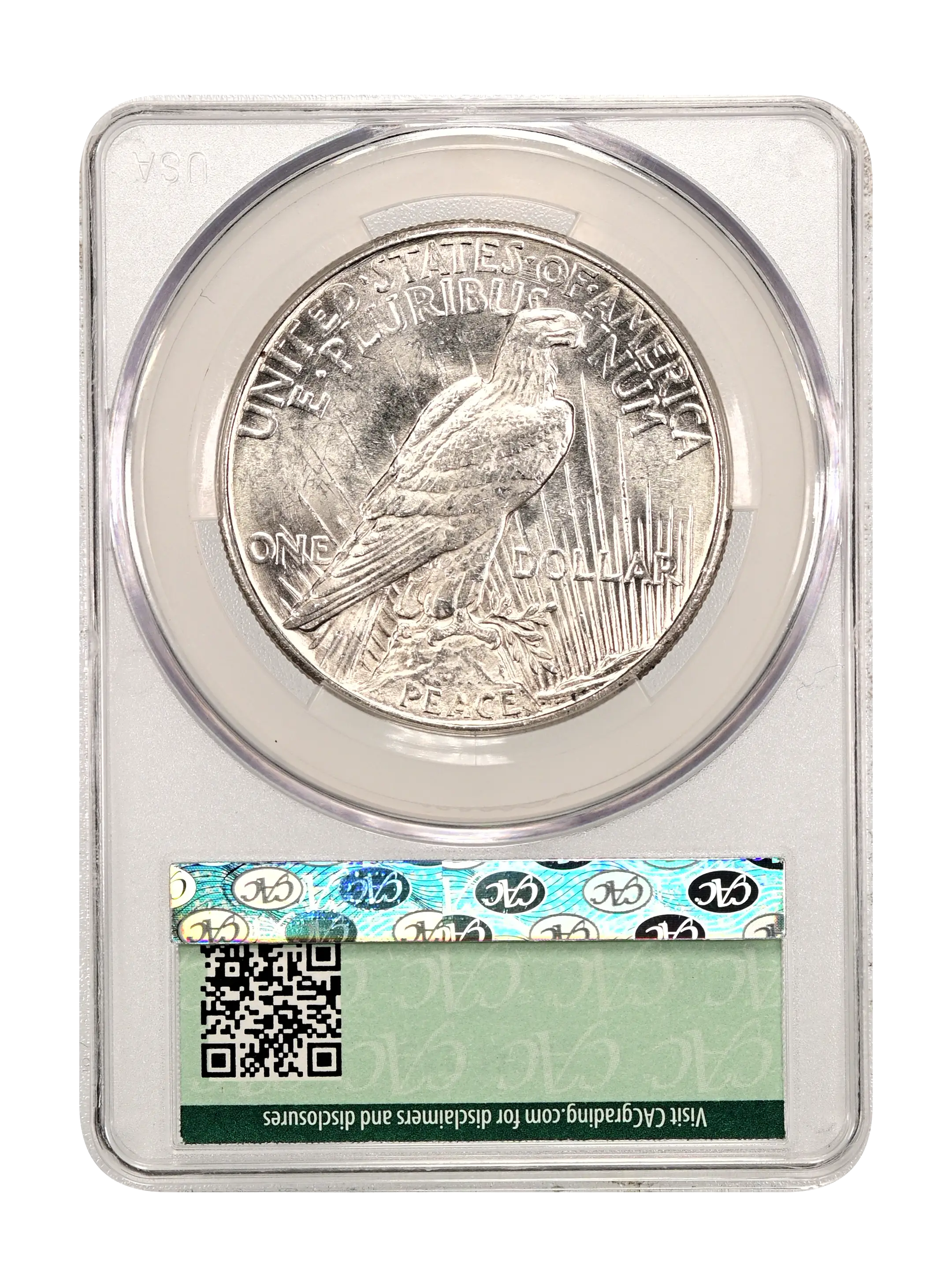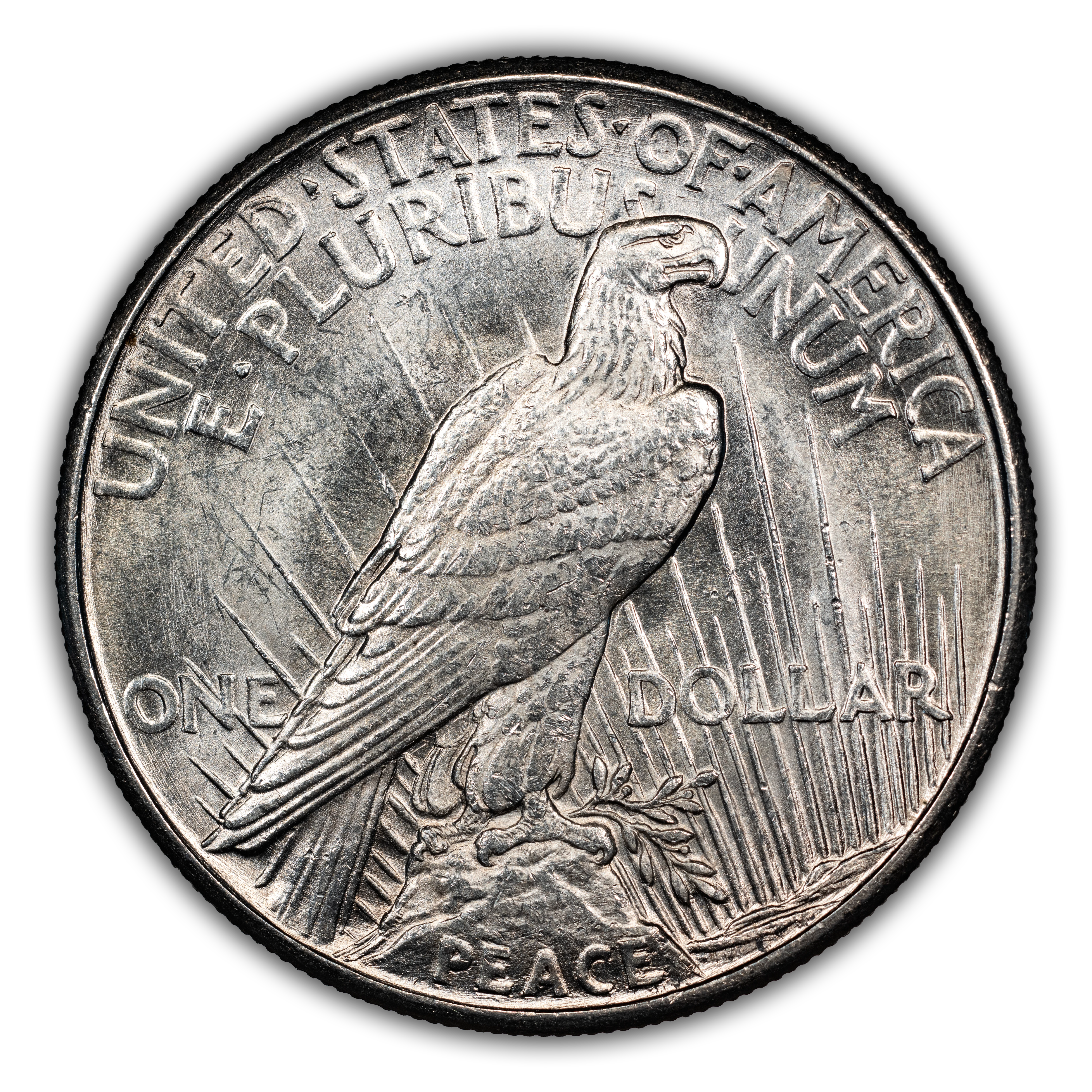 Reverse: Perched eagle standing on a rock facing the right with UNITED STATES oF AMERICA and E PLURIBUS UNUM at the top periphery. The denomination of ONE DOLLAR left and right of the eagle's tail and the word PEACE at the bottom. Mintmark, if any, appears below the word ONE on the left side.