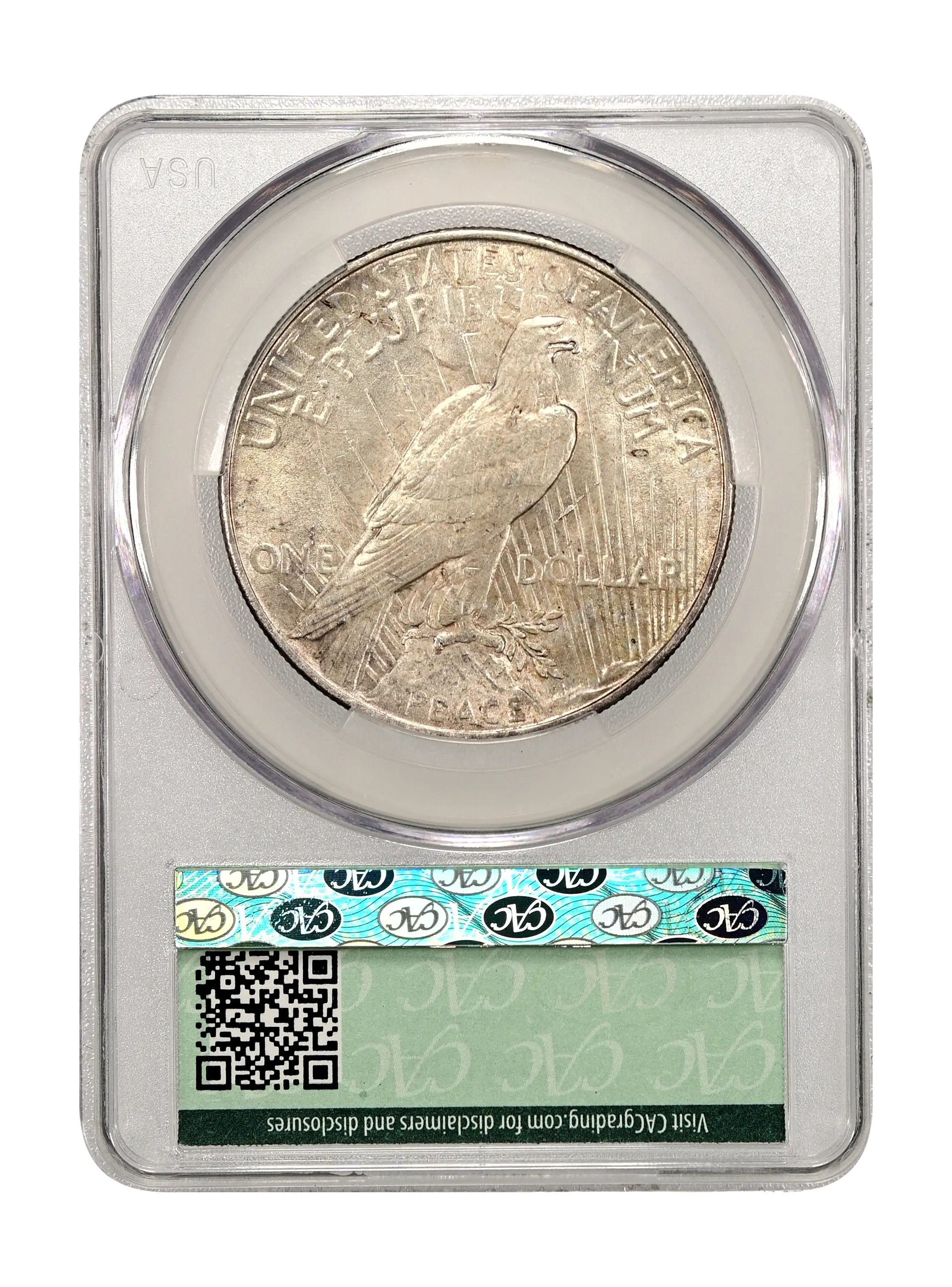 Reverse: Perched eagle standing on a rock facing the right with UNITED STATES oF AMERICA and E PLURIBUS UNUM at the top periphery. The denomination of ONE DOLLAR left and right of the eagle's tail and the word PEACE at the bottom. Mintmark, if any, appears below the word ONE on the left side.