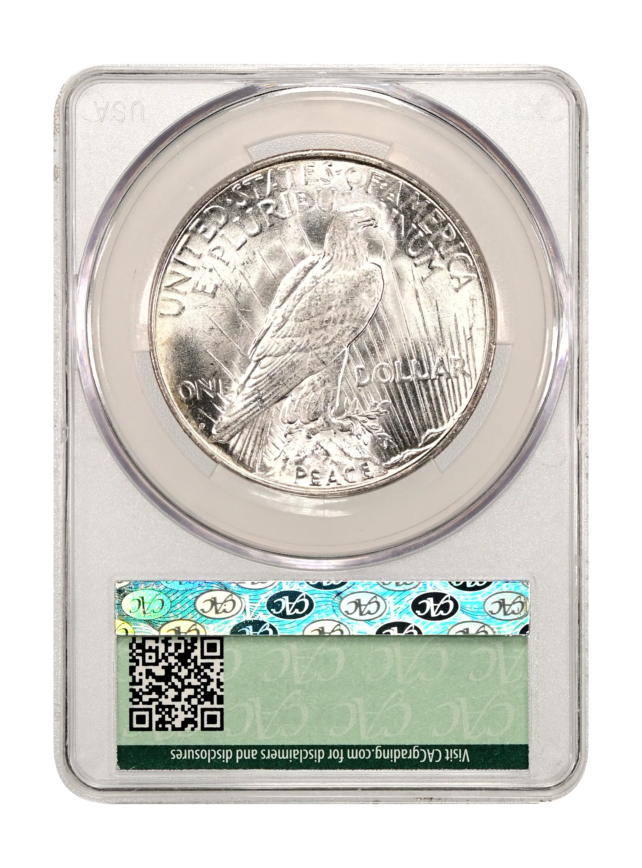 Reverse: Perched eagle standing on a rock facing the right with UNITED STATES oF AMERICA and E PLURIBUS UNUM at the top periphery. The denomination of ONE DOLLAR left and right of the eagle's tail and the word PEACE at the bottom. Mintmark, if any, appears below the word ONE on the left side.