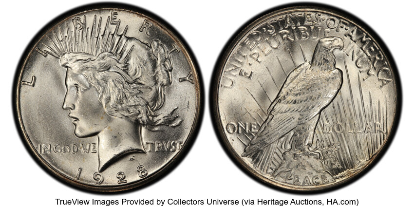Reverse: Perched eagle standing on a rock facing the right with UNITED STATES oF AMERICA and E PLURIBUS UNUM at the top periphery. The denomination of ONE DOLLAR left and right of the eagle's tail and the word PEACE at the bottom. Mintmark, if any, appears below the word ONE on the left side.