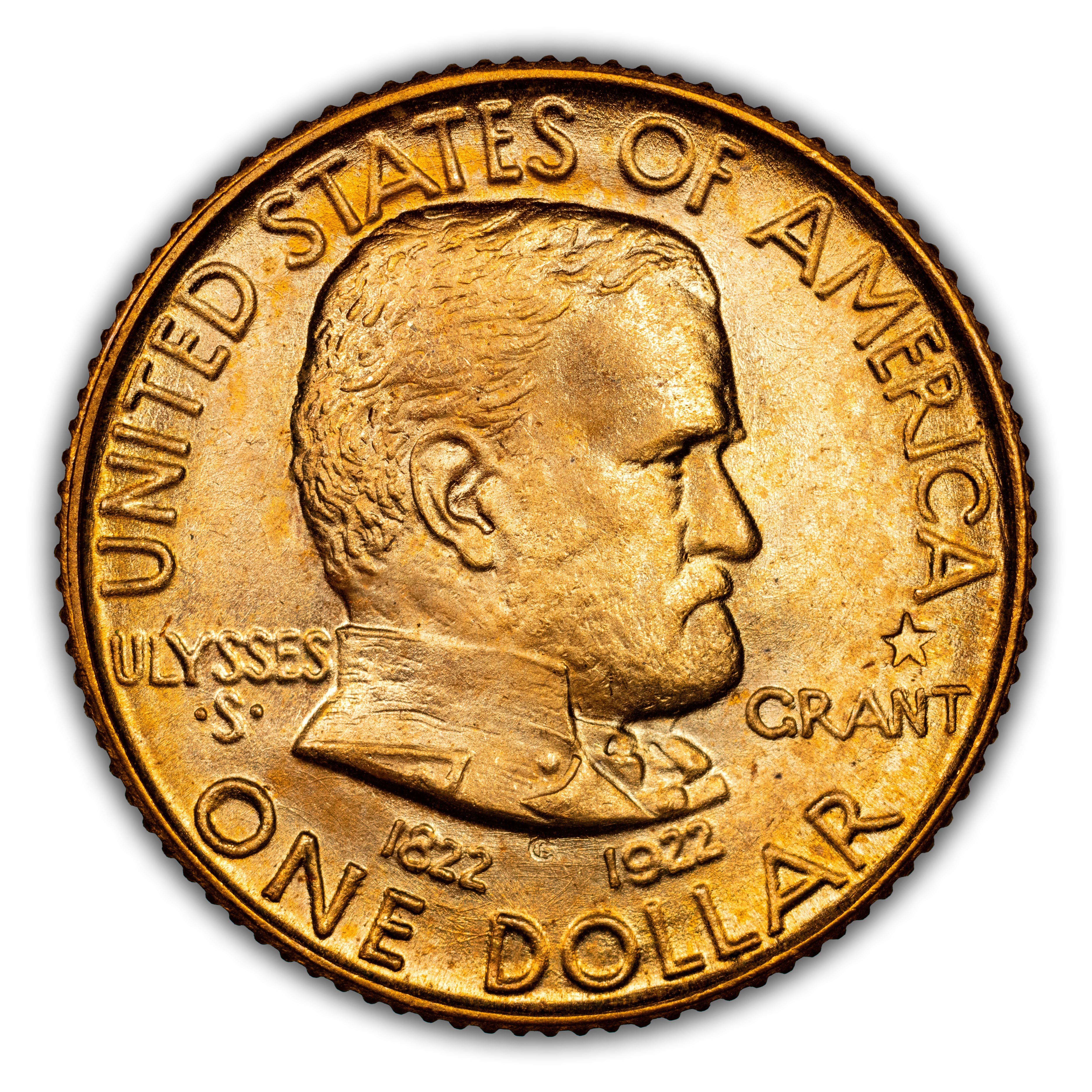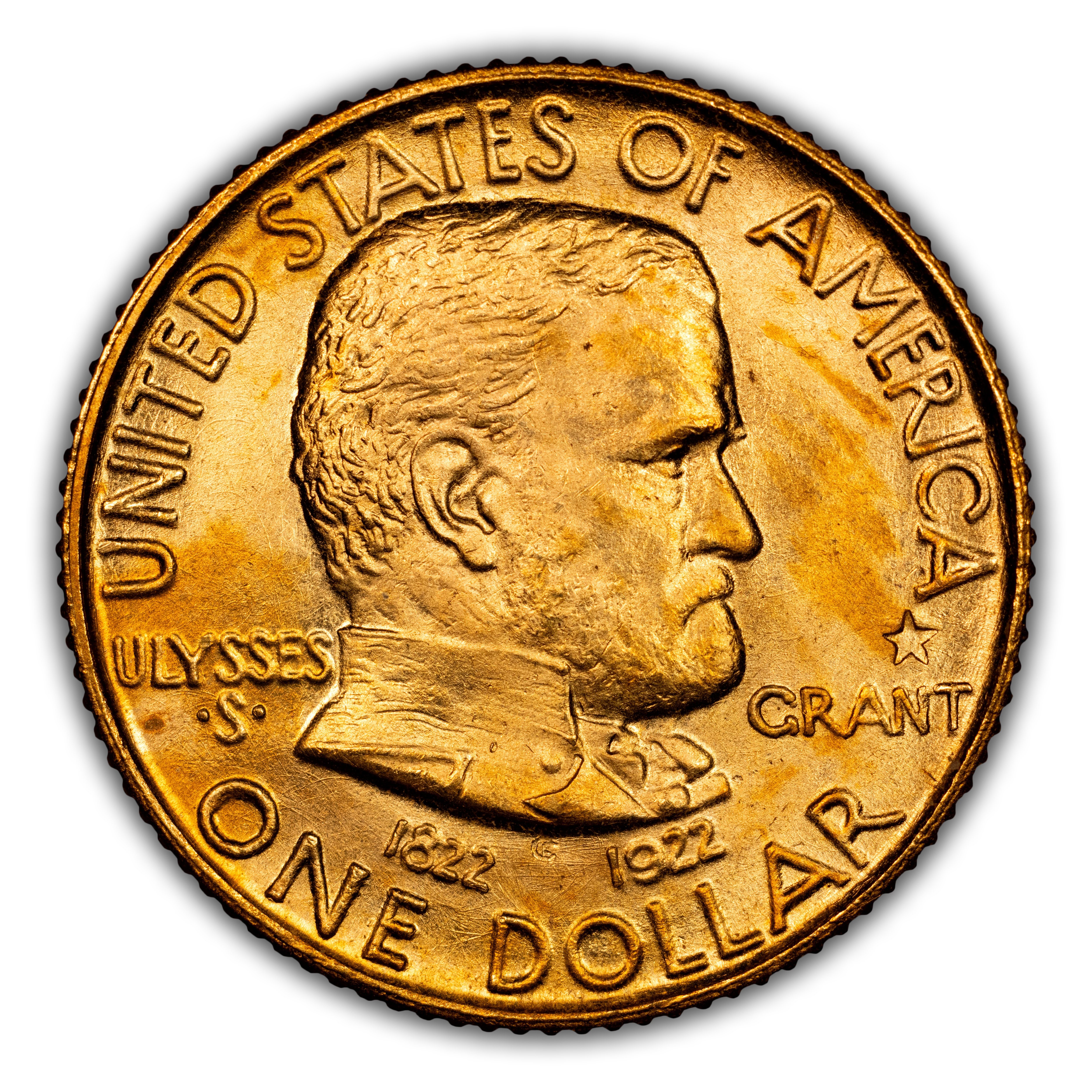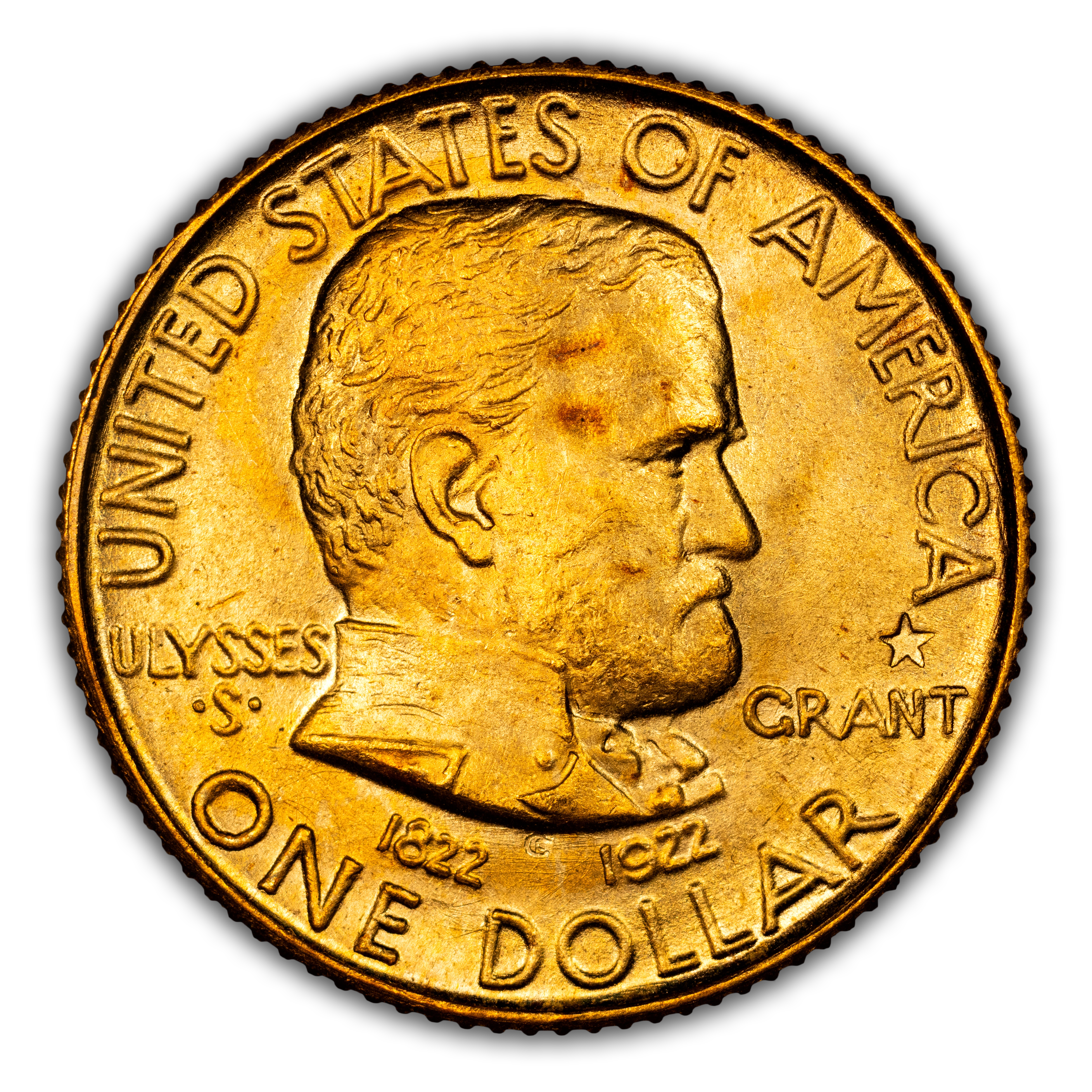 The 1922 Grant With Star gold commemorative dollar honors the 100th anniversary of Ulysses S. Grant's birth. The former Civil War general and president is honored on this coin with an obverse portrait, designed by Laura Gardin Fraser.