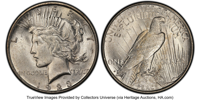 Reverse: Perched eagle standing on a rock facing the right with UNITED STATES oF AMERICA and E PLURIBUS UNUM at the top periphery. The denomination of ONE DOLLAR left and right of the eagle's tail and the word PEACE at the bottom. Mintmark, if any, appears below the word ONE on the left side.