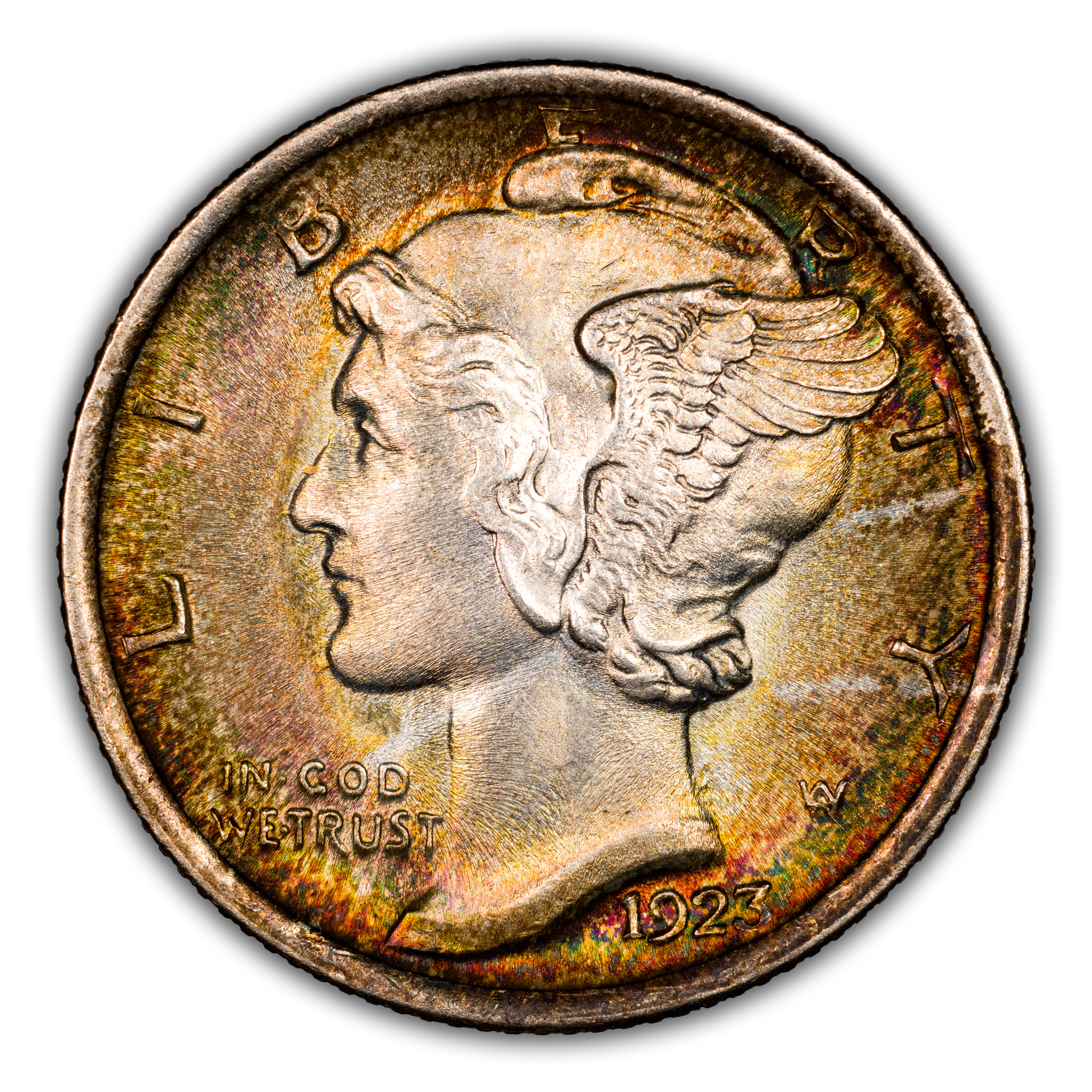 The 1923 Philadelphia Mercury dime marks the first year of production for this series since 1921, with a break in 1922 in part brought on by a mild recession. 1923 Mercury dimes are common in circulated grades and scarce in uncirculated grades. Among Mint State pieces, many exhibit strong strike and brilliant luster.