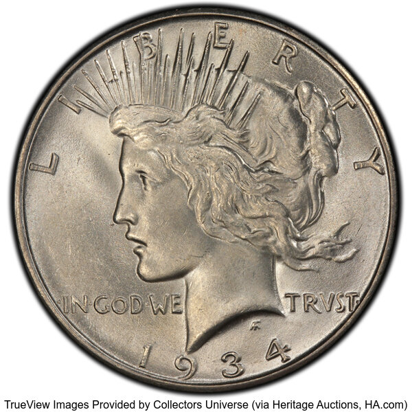 Reverse: Perched eagle standing on a rock facing the right with UNITED STATES oF AMERICA and E PLURIBUS UNUM at the top periphery. The denomination of ONE DOLLAR left and right of the eagle's tail and the word PEACE at the bottom. Mintmark, if any, appears below the word ONE on the left side.