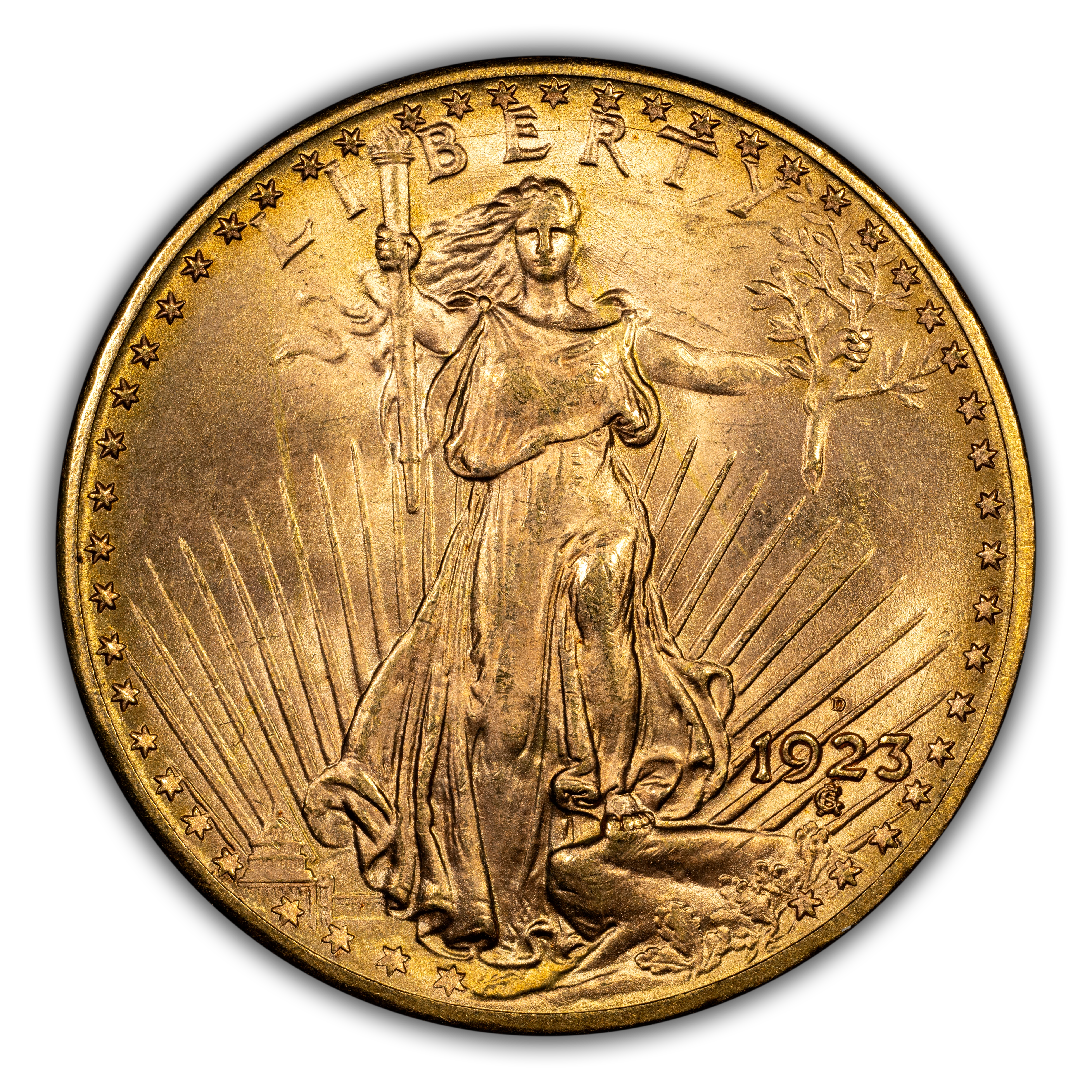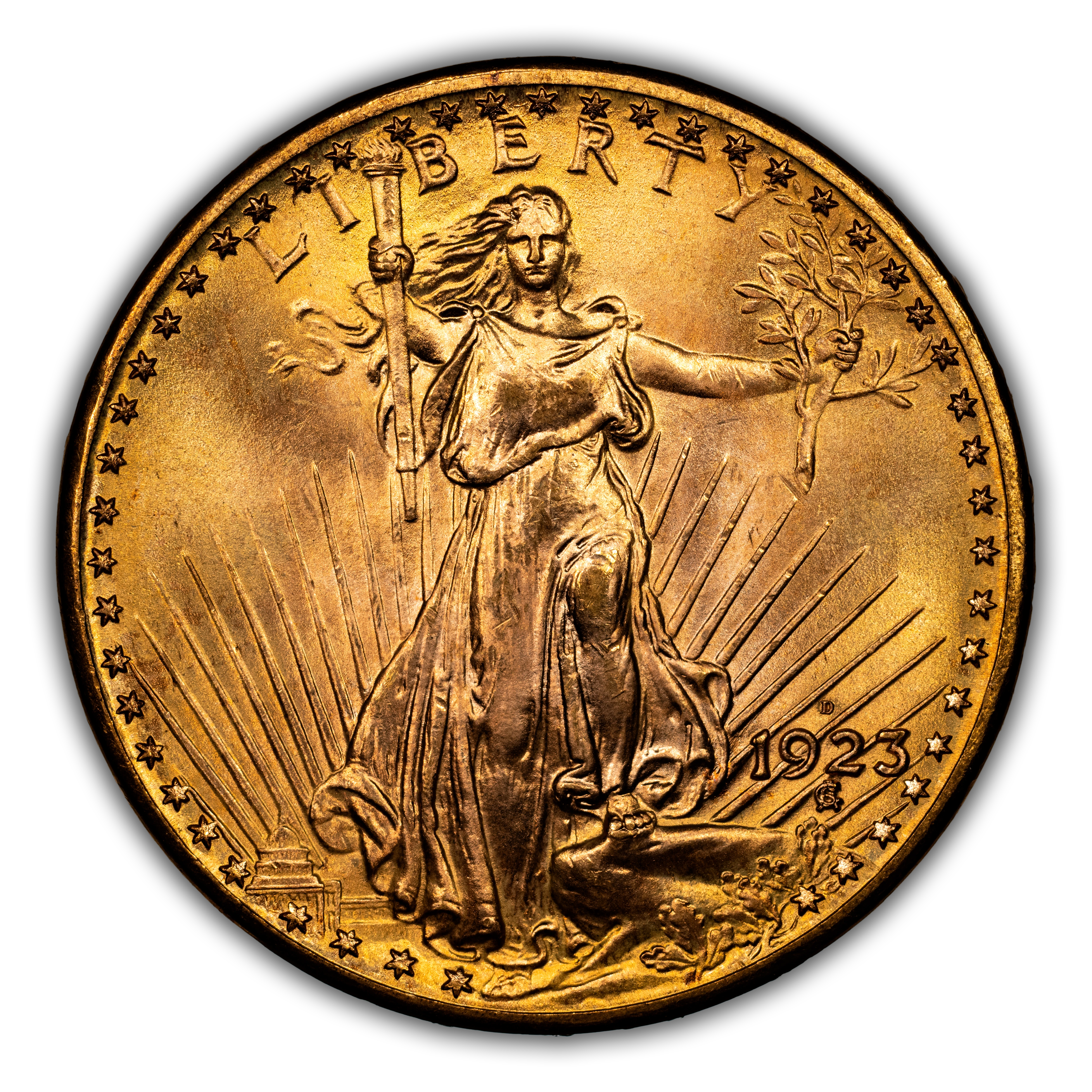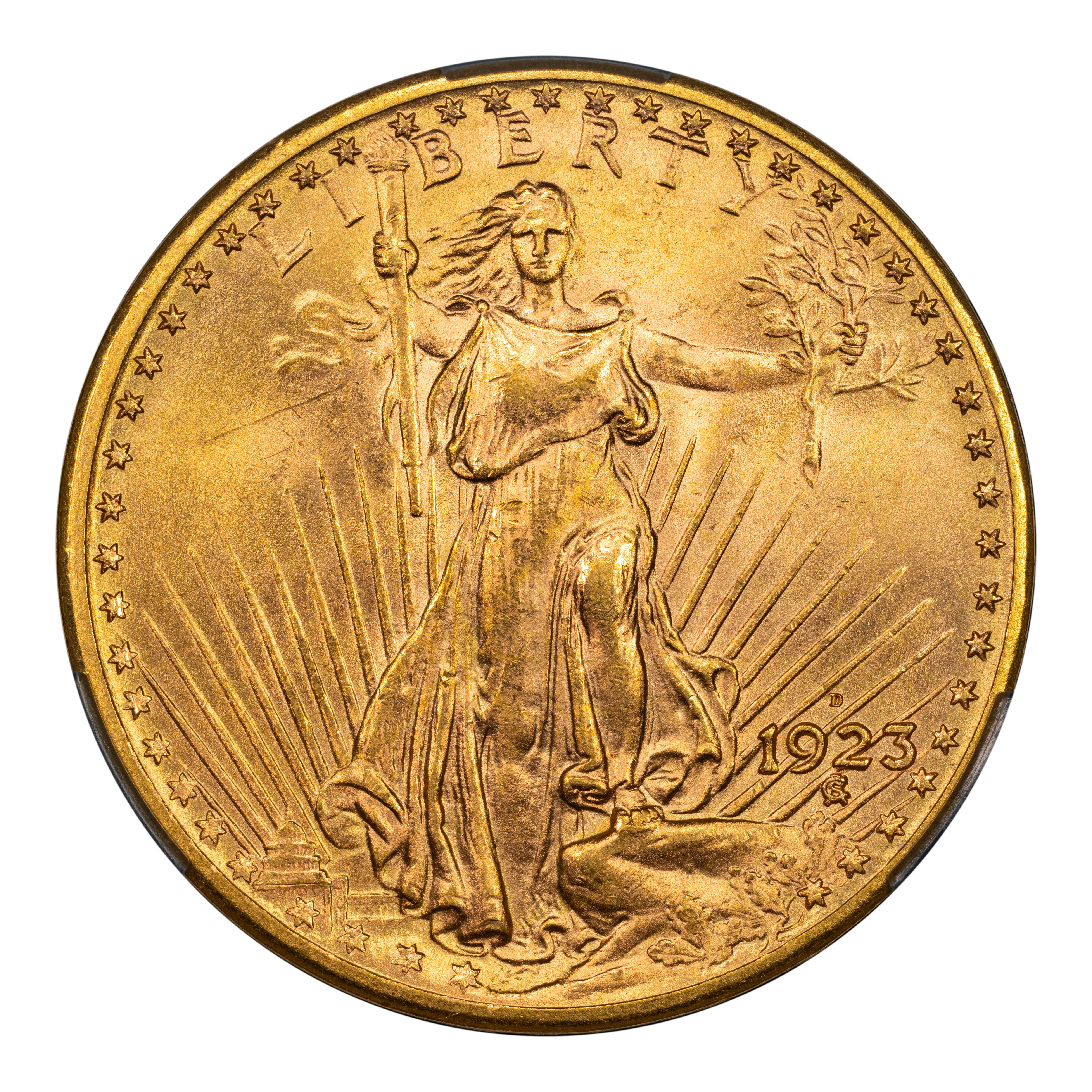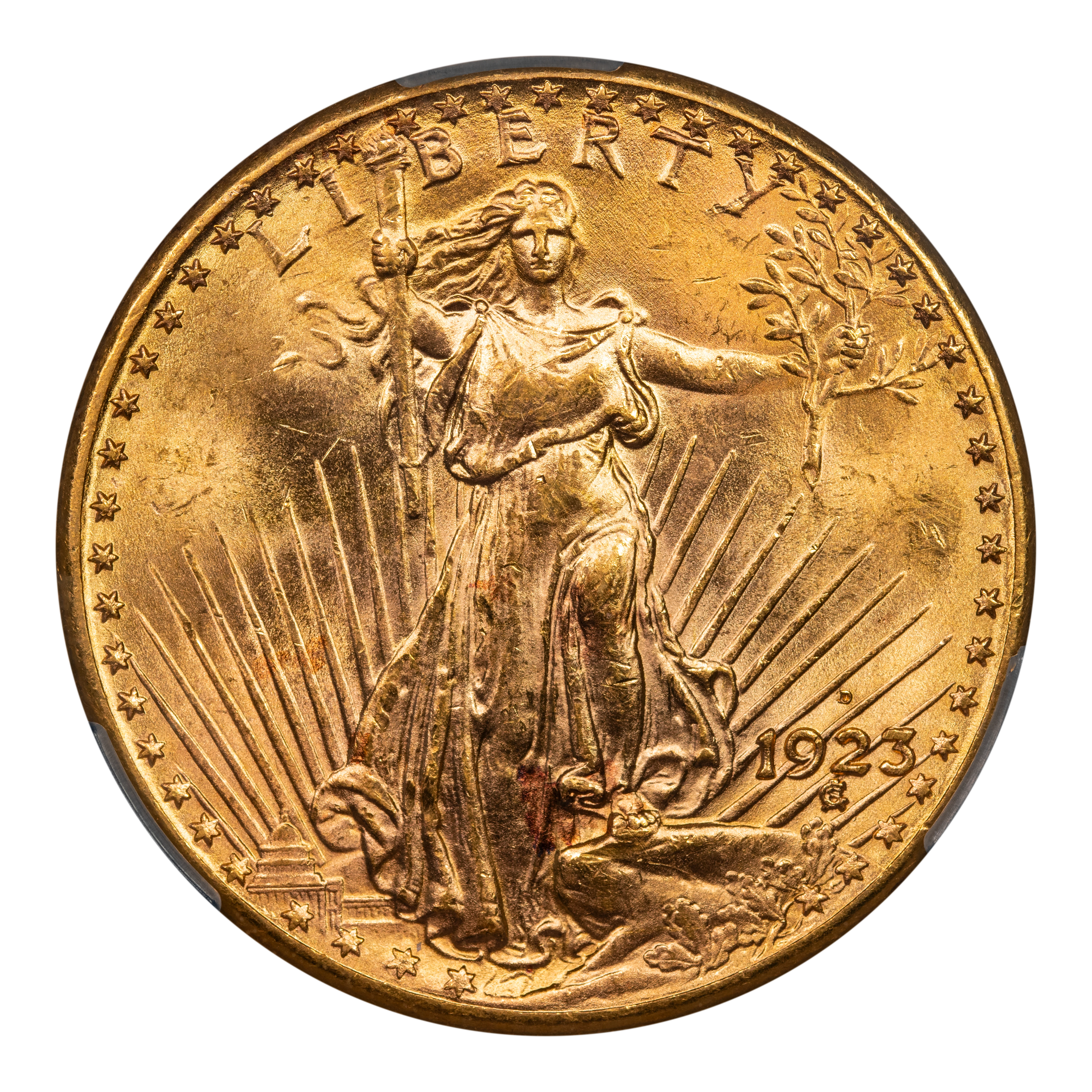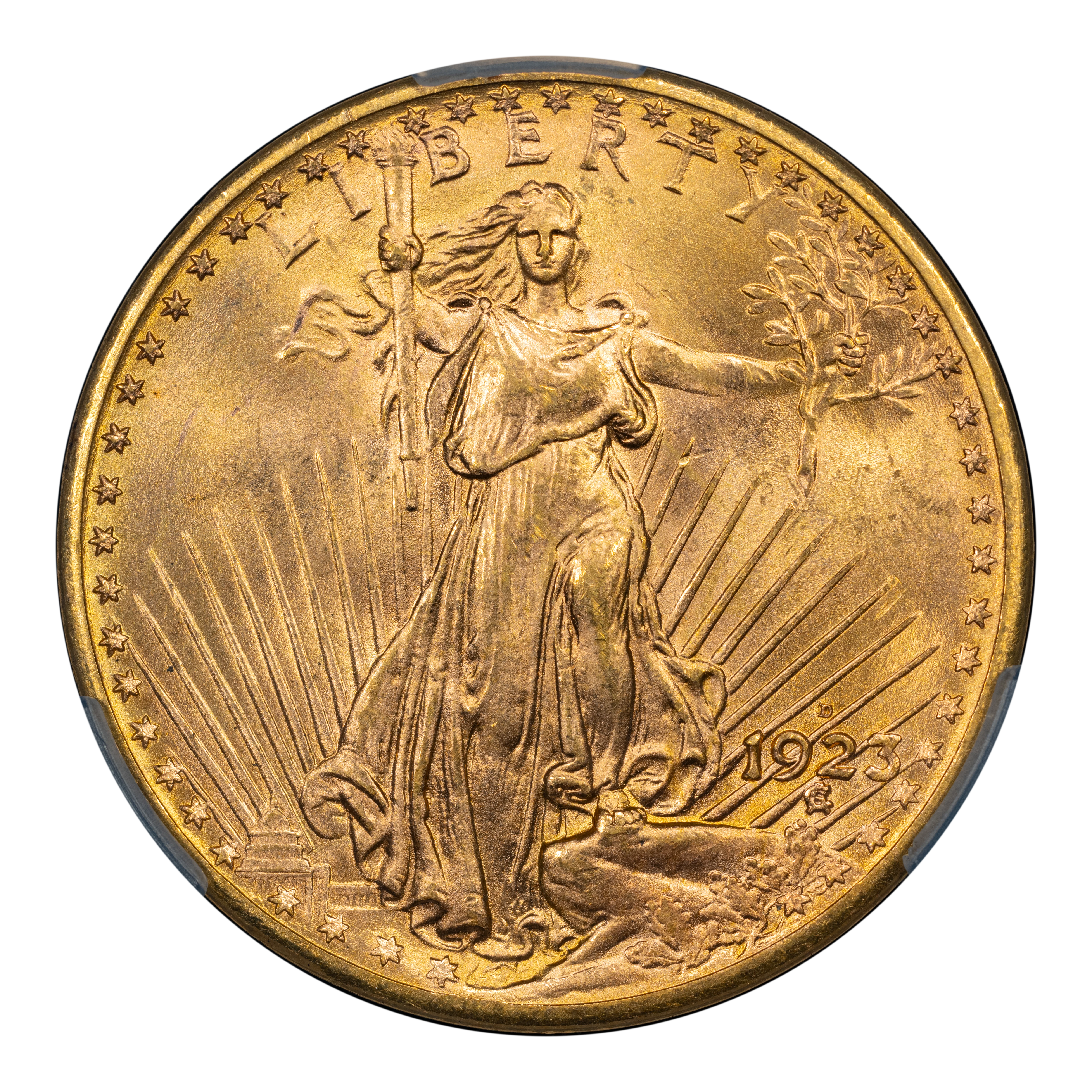 The 1923-D Saint-Gaudens double eagle ranks as one of the most common issues in the series and certainly one of the most frequently encountered branch-mint pieces. Even Gems are easy to locate, with MS66s proving plentiful and even a few dozen or so MS67s appearing on the market from time to time. Most uncirculated examples showcase great luster and strike, making for excellent eye appeal.