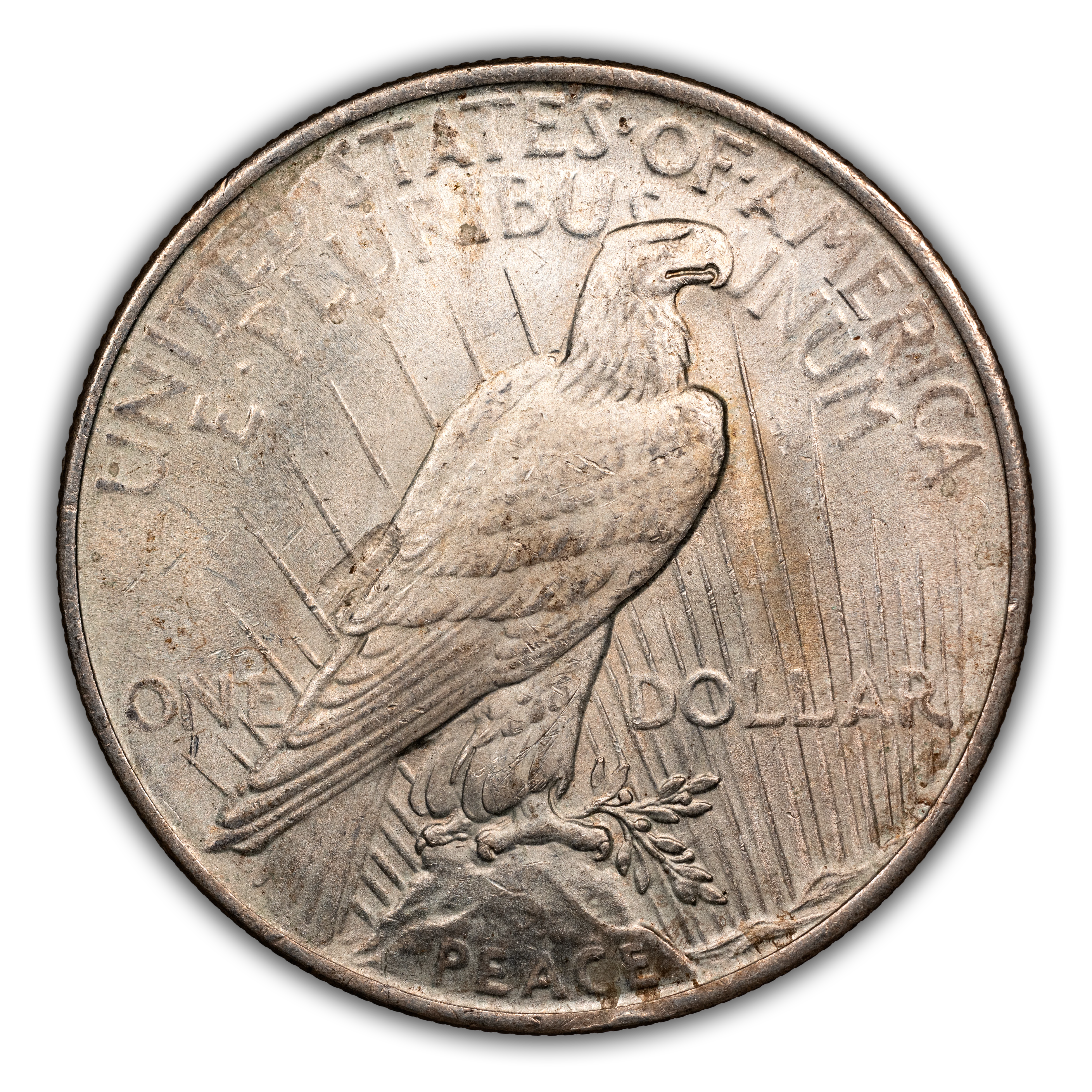 Reverse: Perched eagle standing on a rock facing the right with UNITED STATES oF AMERICA and E PLURIBUS UNUM at the top periphery. The denomination of ONE DOLLAR left and right of the eagle's tail and the word PEACE at the bottom. Mintmark, if any, appears below the word ONE on the left side.