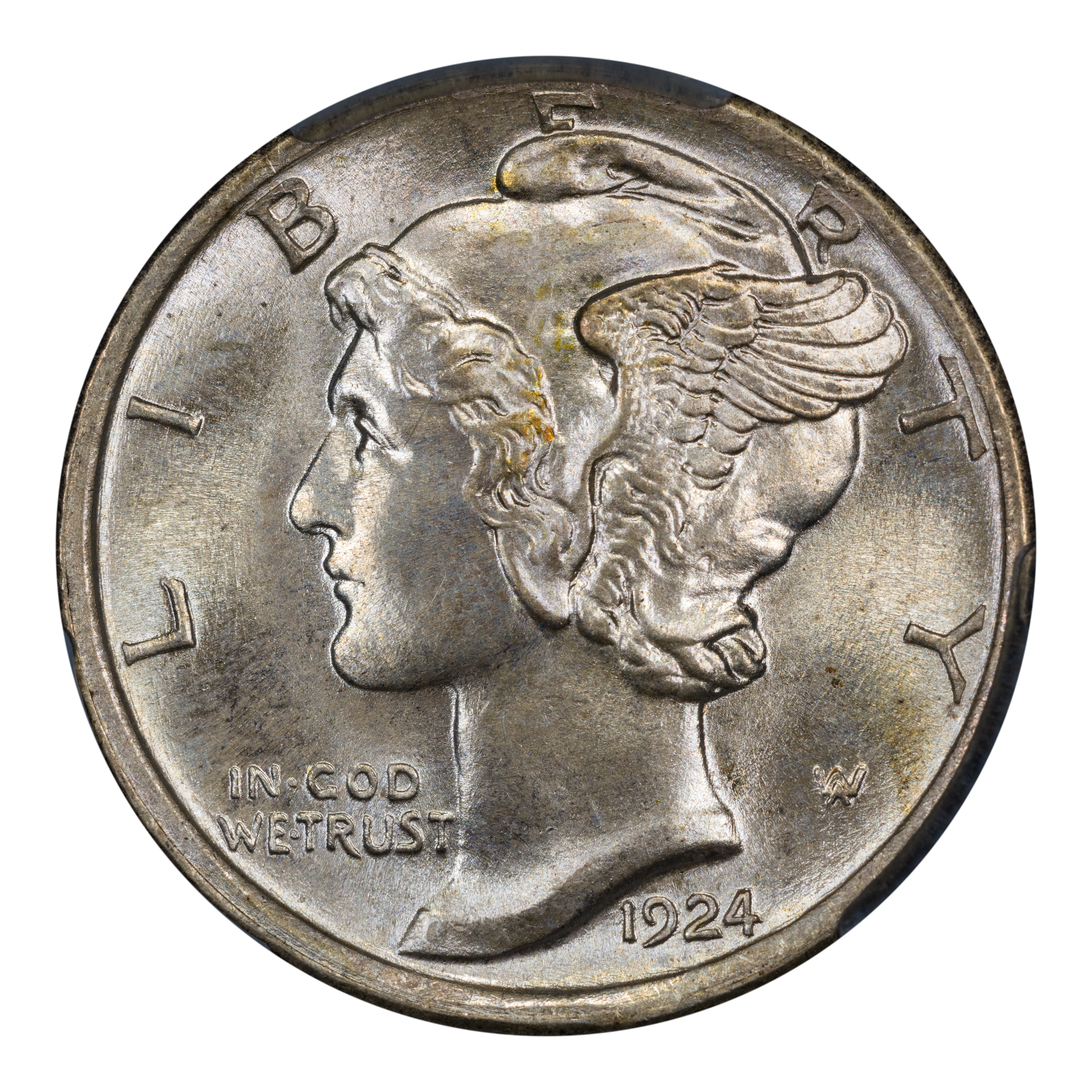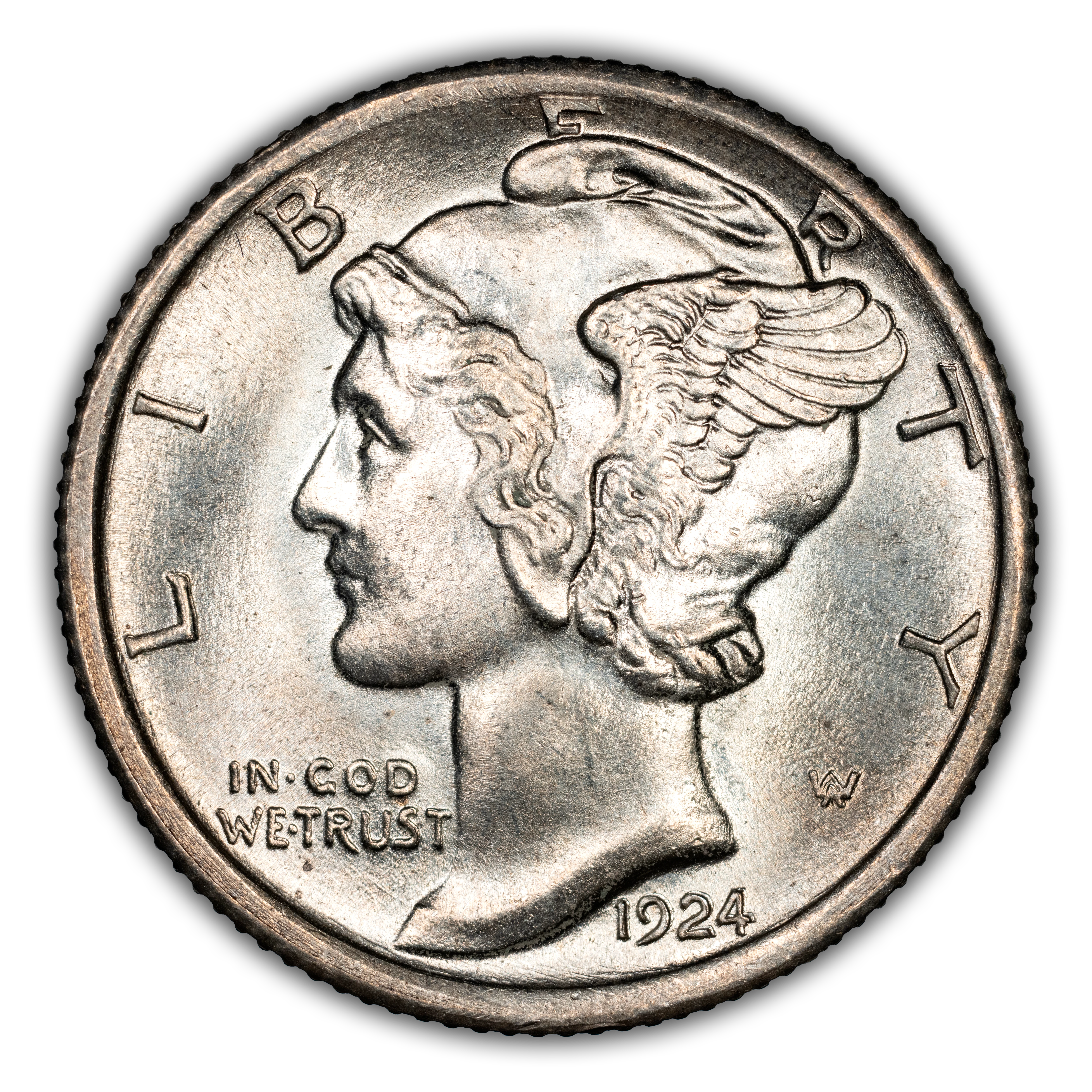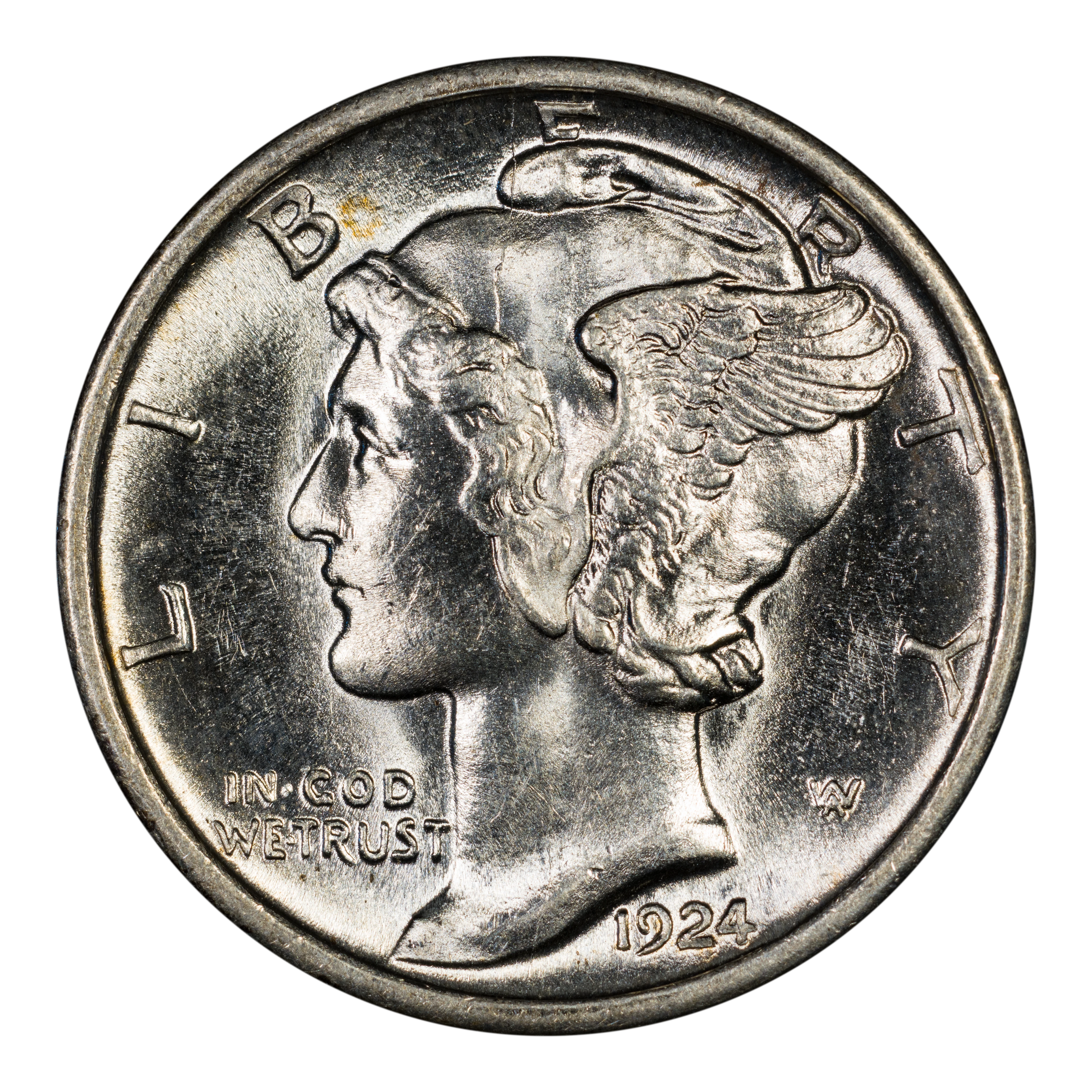 Obverse: Winged Liberty, or Mercury (the Roman god of commerce), is depicted facing left with LIBERTY spelled around the periphery. IN GOD WE TRUST appears left of the neck and the date is positioned just below the bust around 5 o'clock. The designer's initials "AW" appear to the right of the neck.