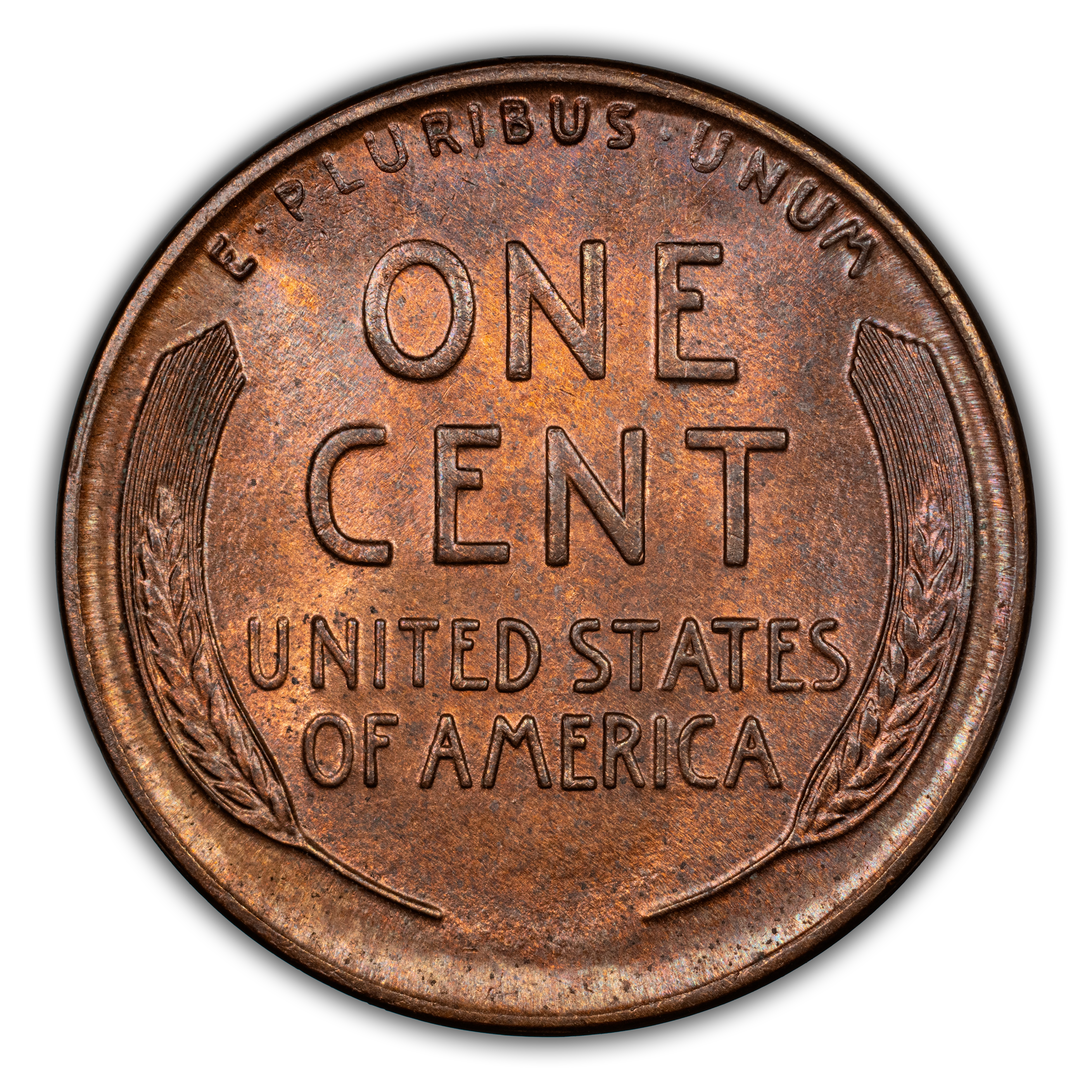 Reverse: Wheat ears flanking the words ONE CENT, UNITED STATES OF AMERICA. The motto E PLURIBUS UNUM on the top perimeter.