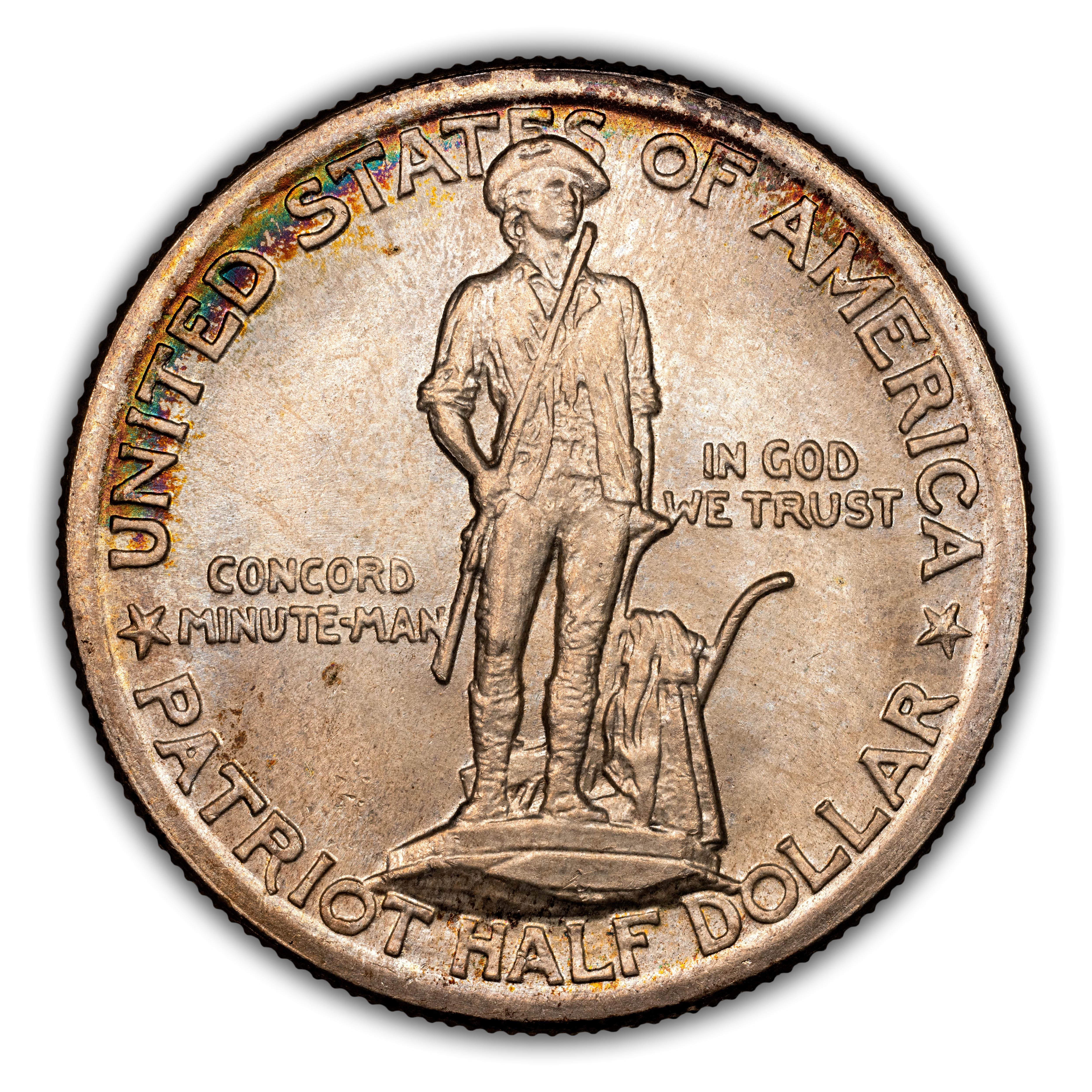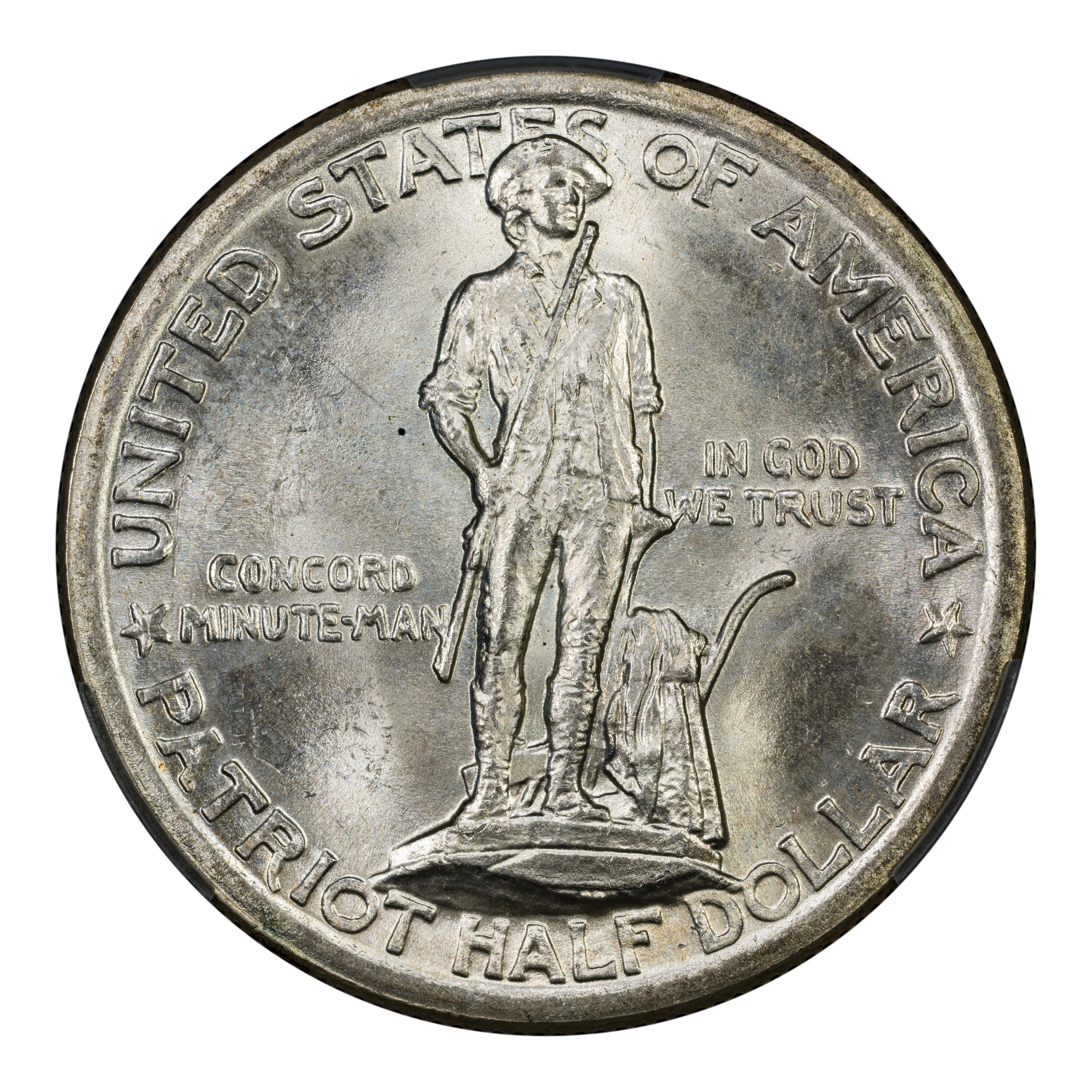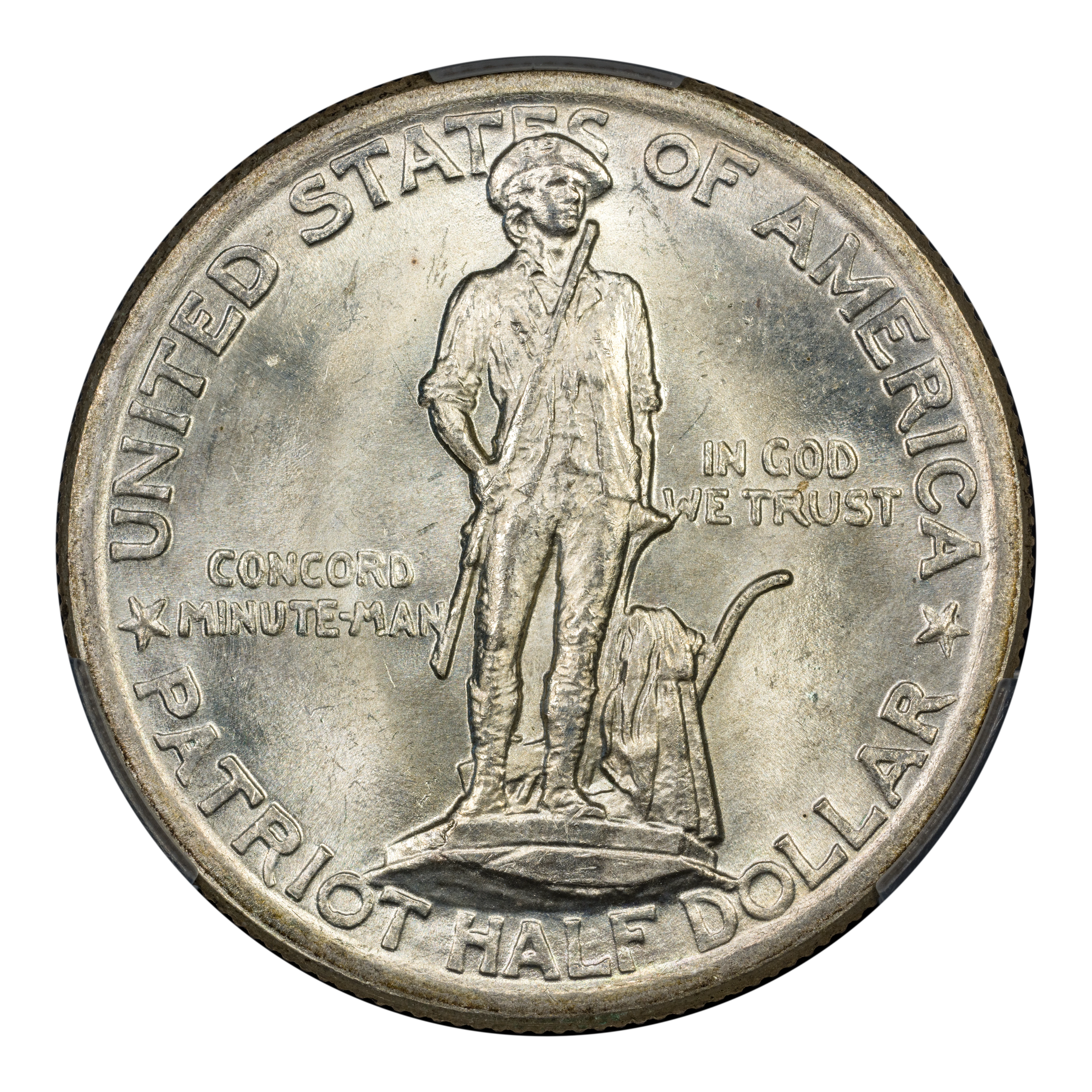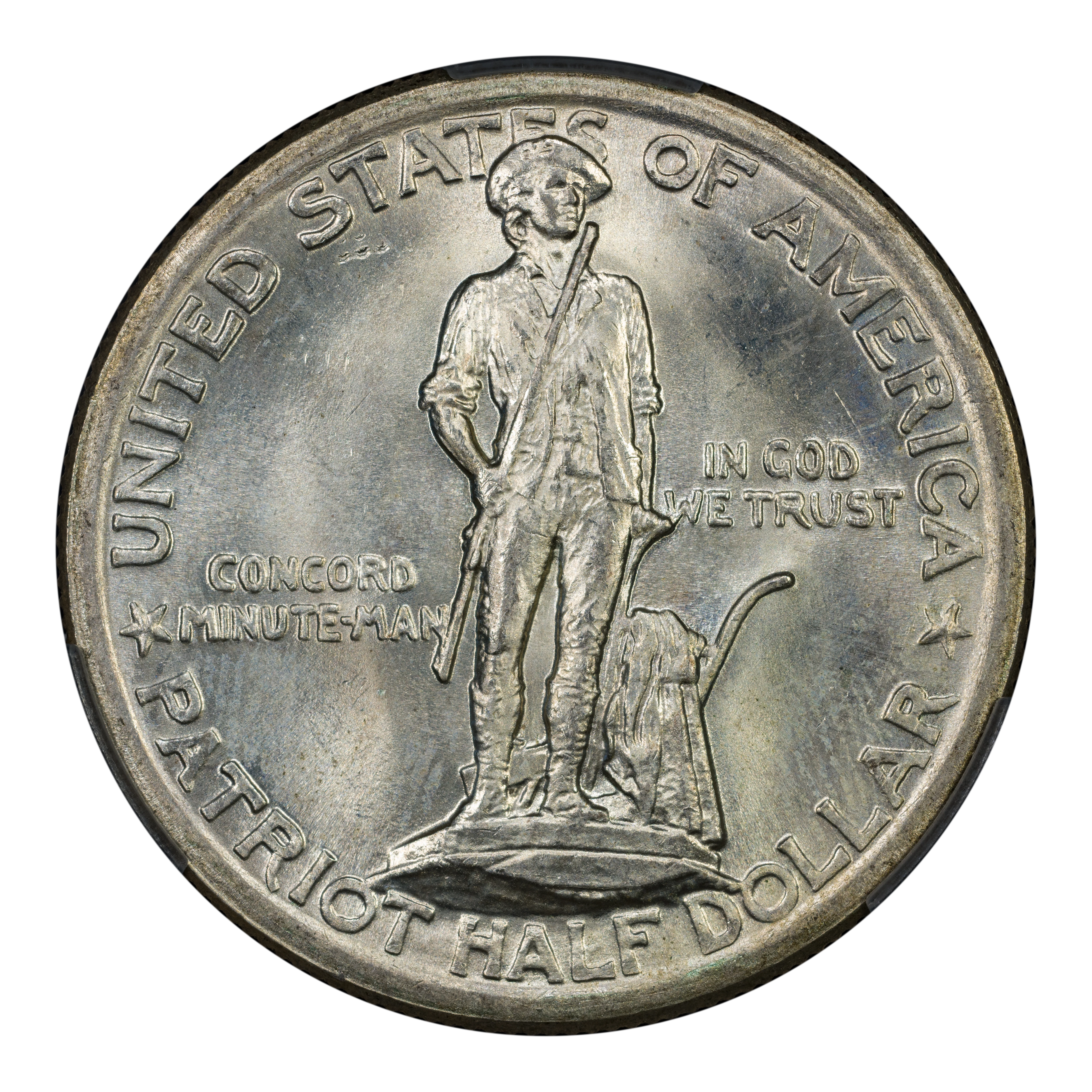 Lexington half dollars, designed by Chester Beach, are often found in the grades of MS63-65, and MS66s are scarce but available on the marketplace, while examples in higher grades are quite rare. Most uncirculated specimens carry lustrous surfaces and offer excellent eye appeal. One nuance of this coin is that some pieces show rub on the knee on the soldier as seen on the obverse, a detraction that can be avoided with some searching.