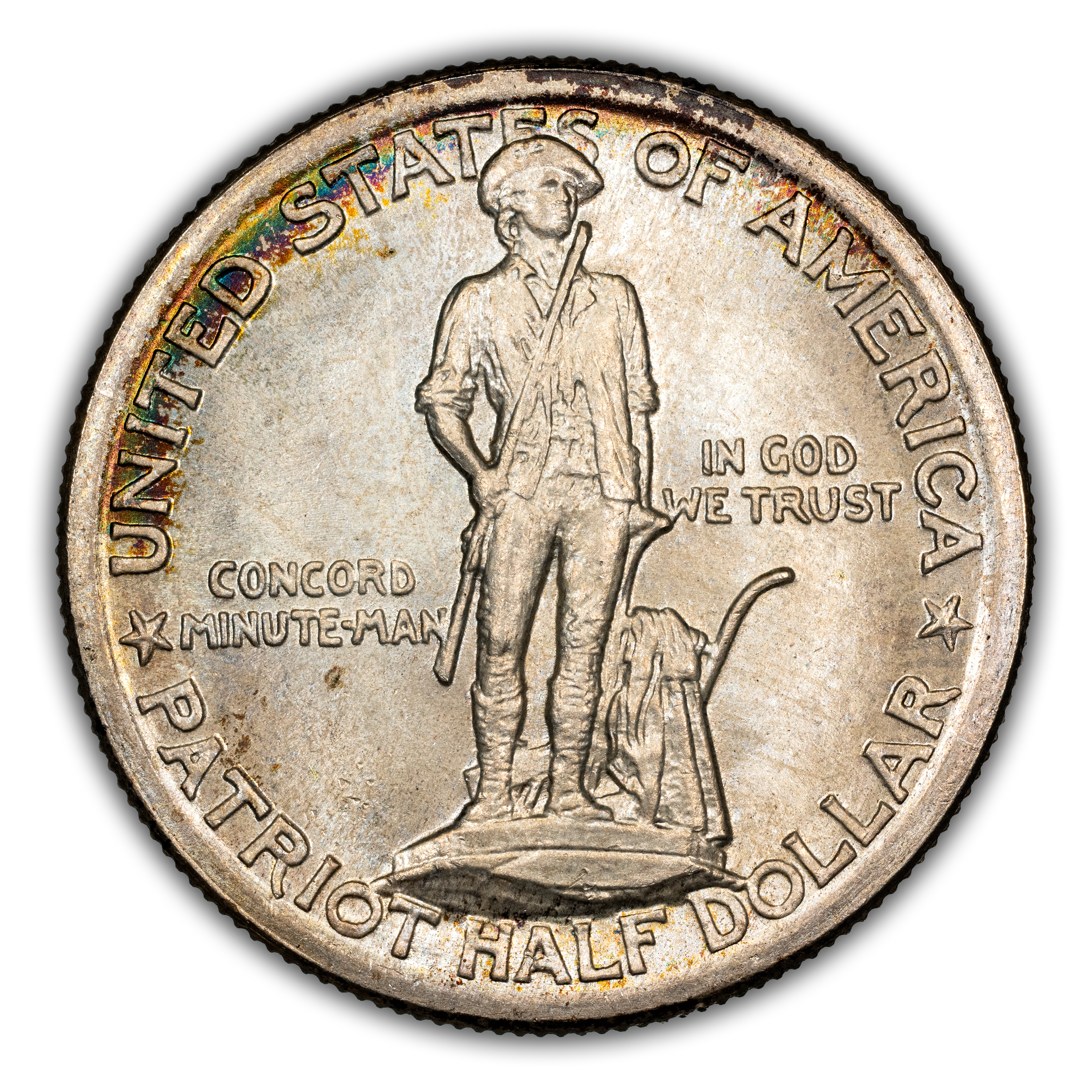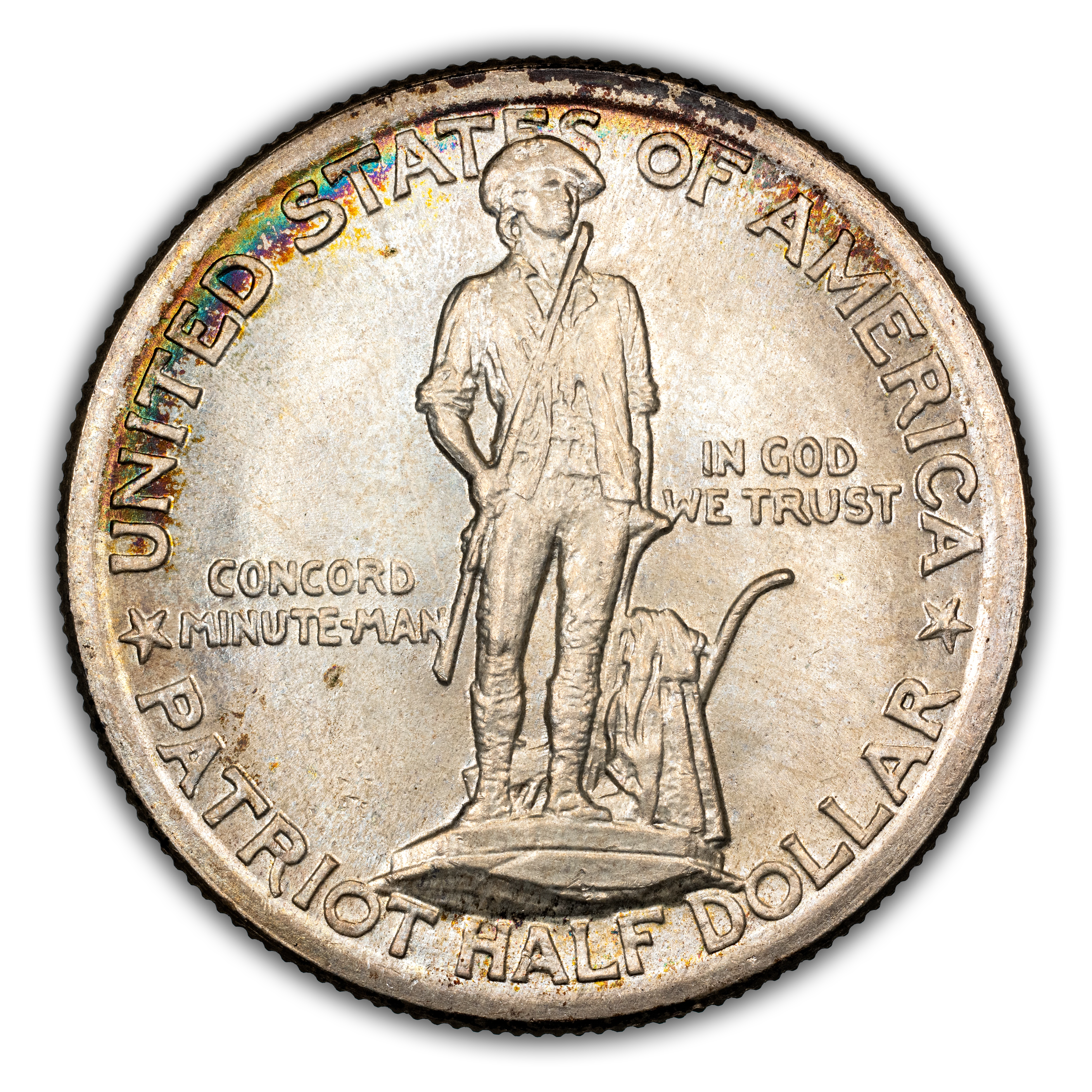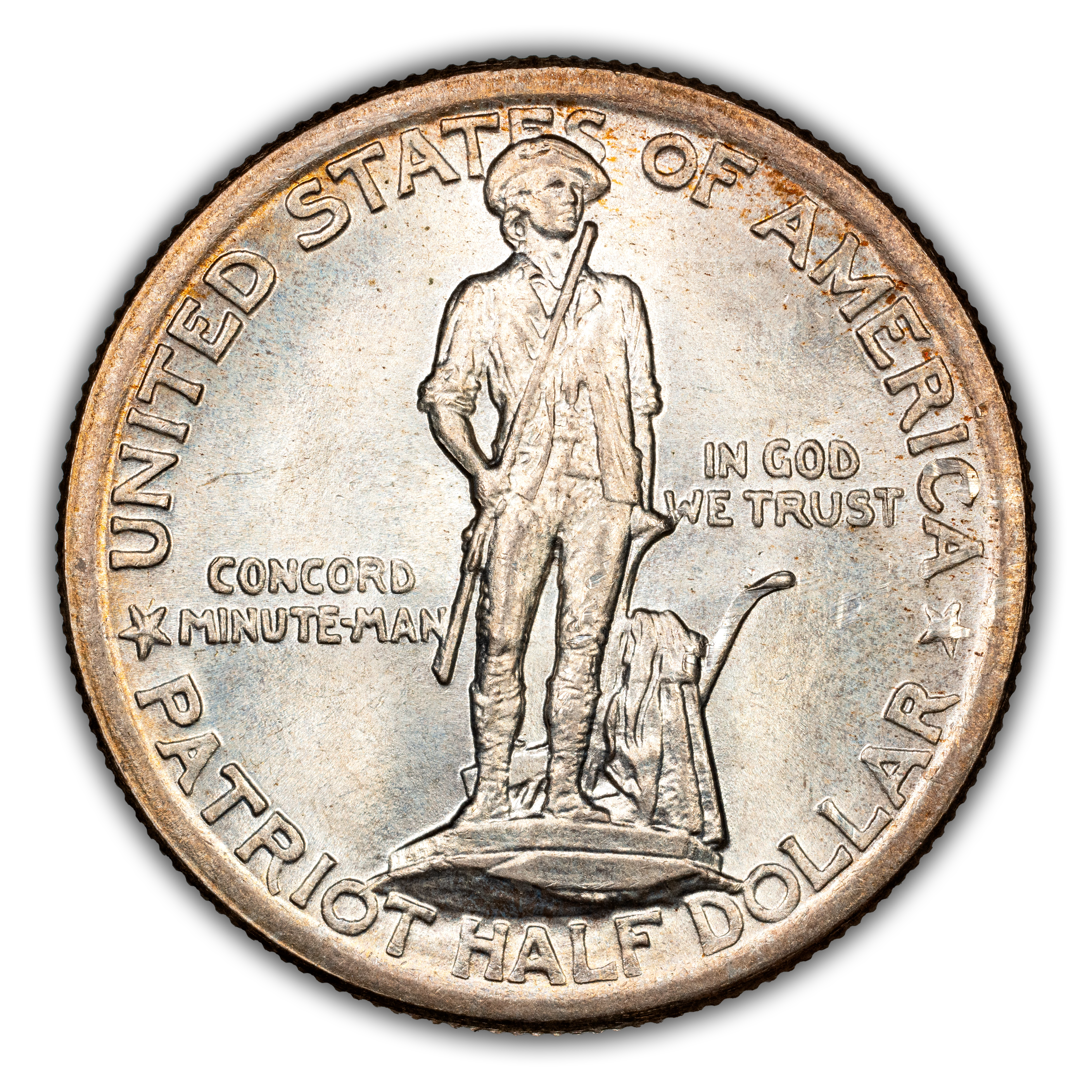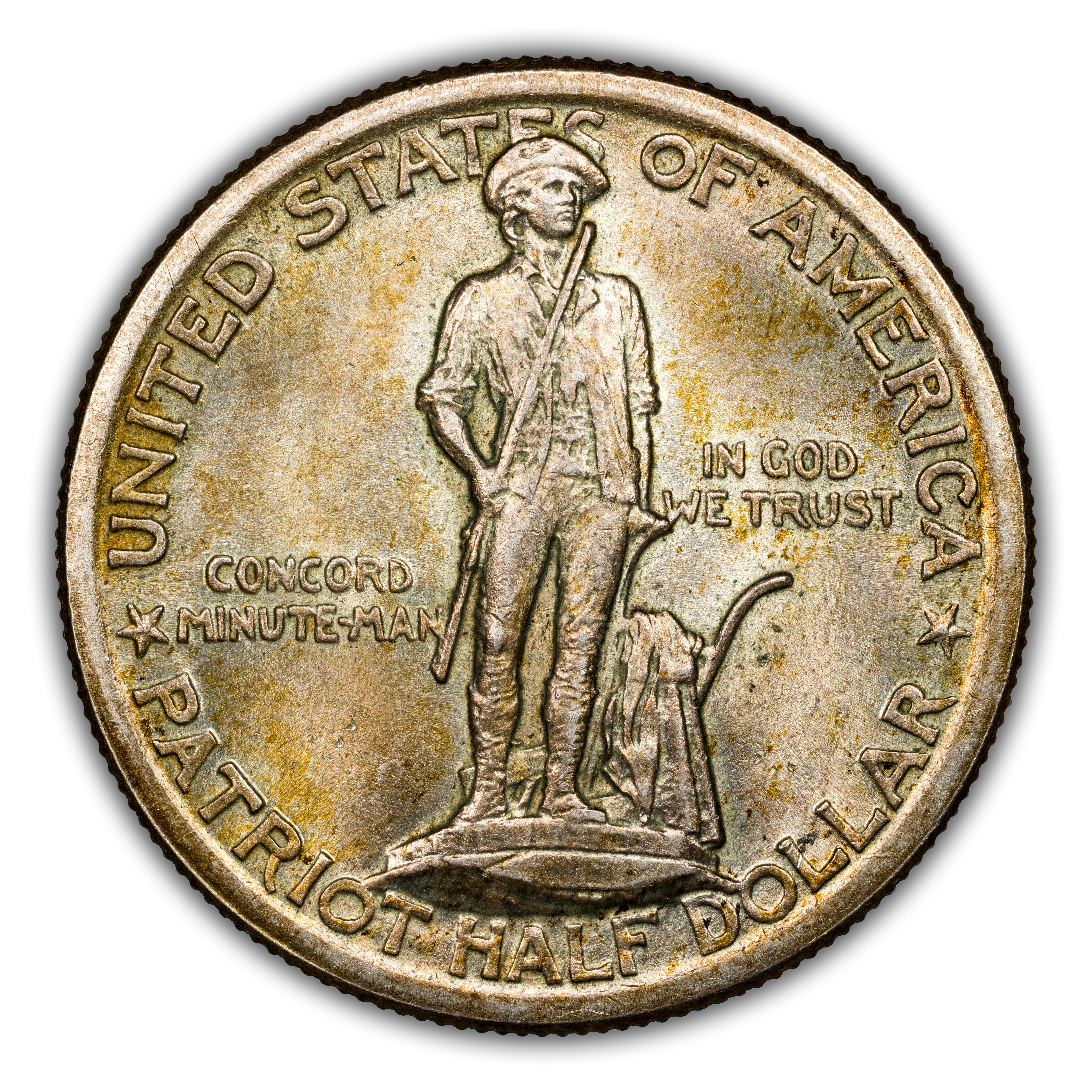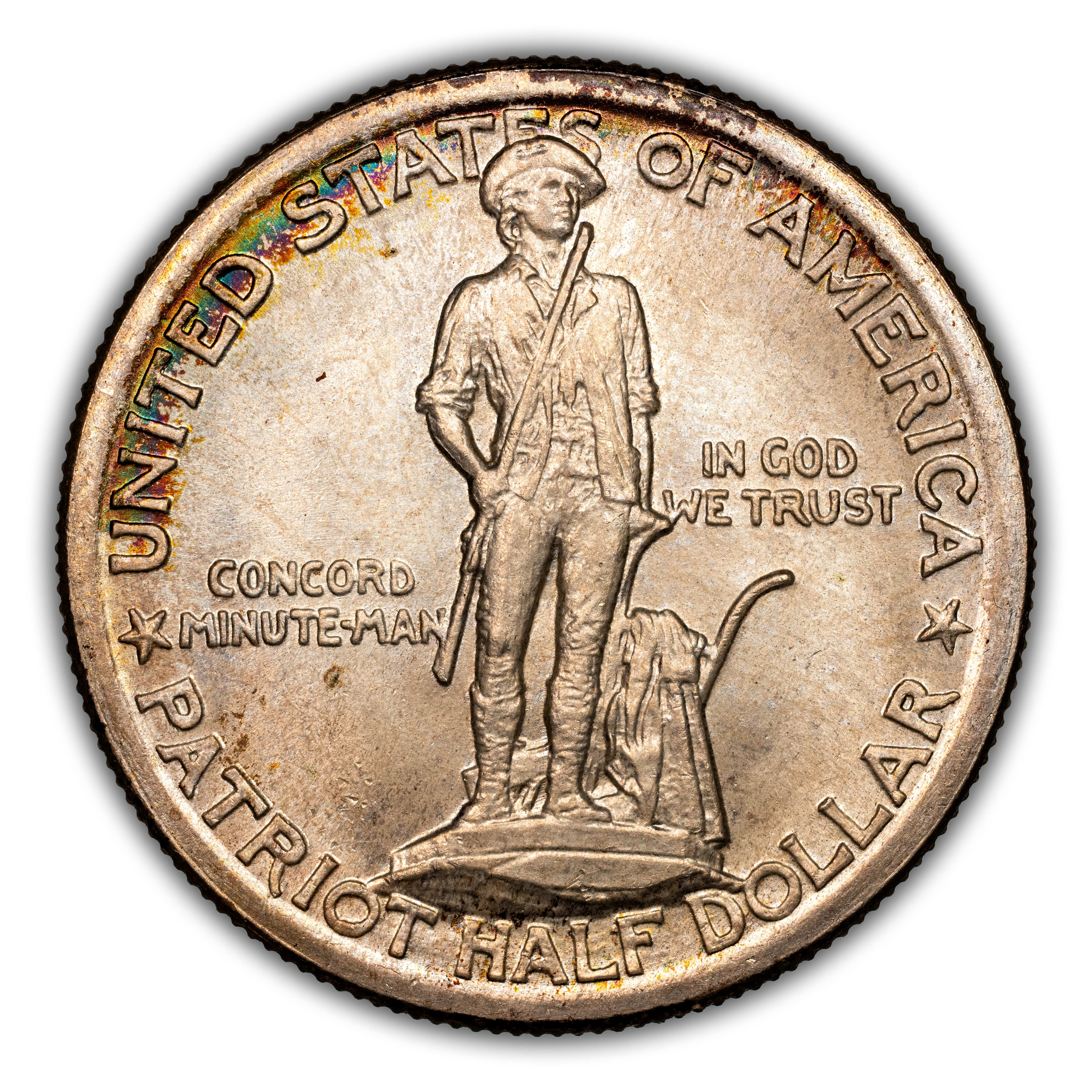 Lexington half dollars, designed by Chester Beach, are often found in the grades of MS63-65, and MS66s are scarce but available on the marketplace, while examples in higher grades are quite rare. Most uncirculated specimens carry lustrous surfaces and offer excellent eye appeal. One nuance of this coin is that some pieces show rub on the knee on the soldier as seen on the obverse, a detraction that can be avoided with some searching.
