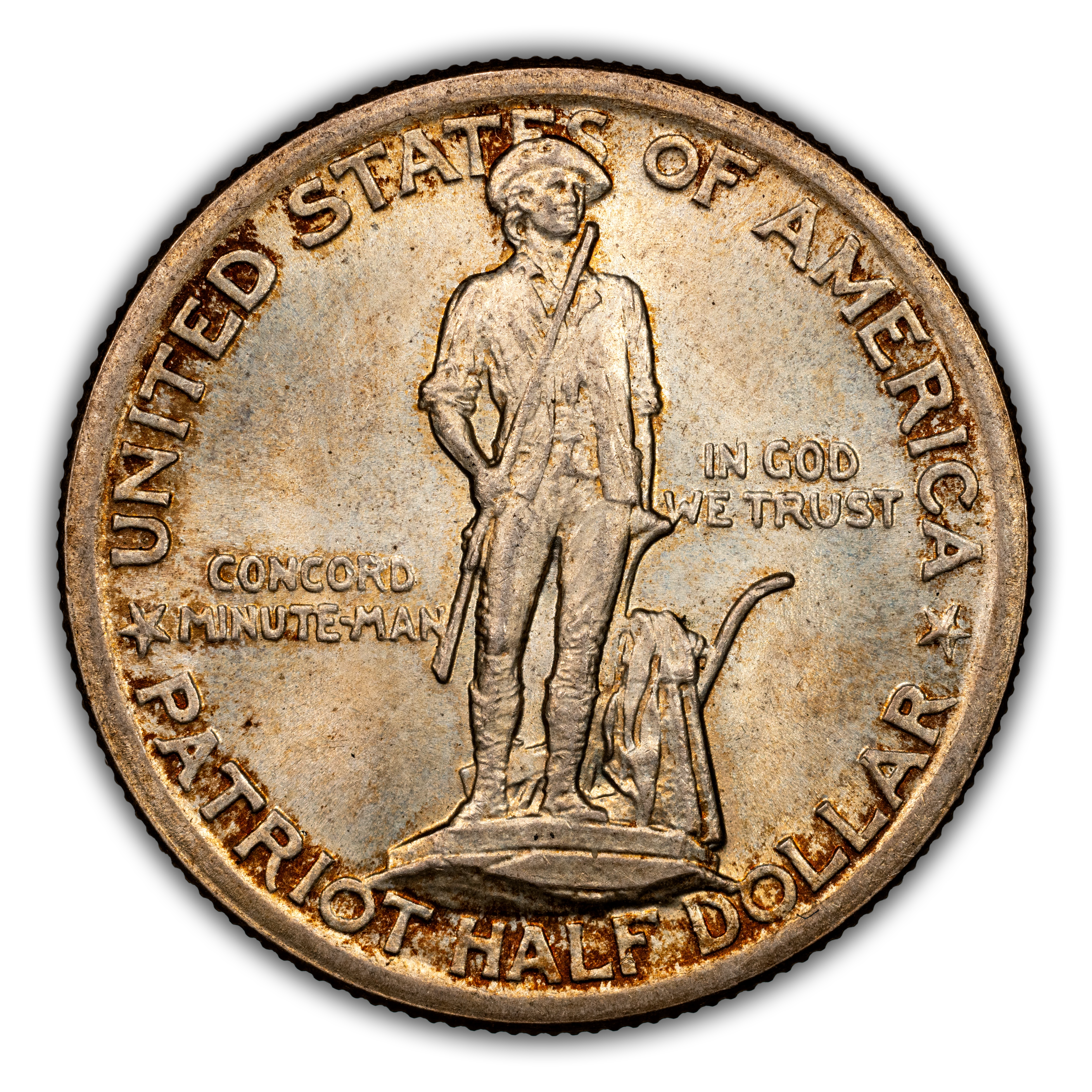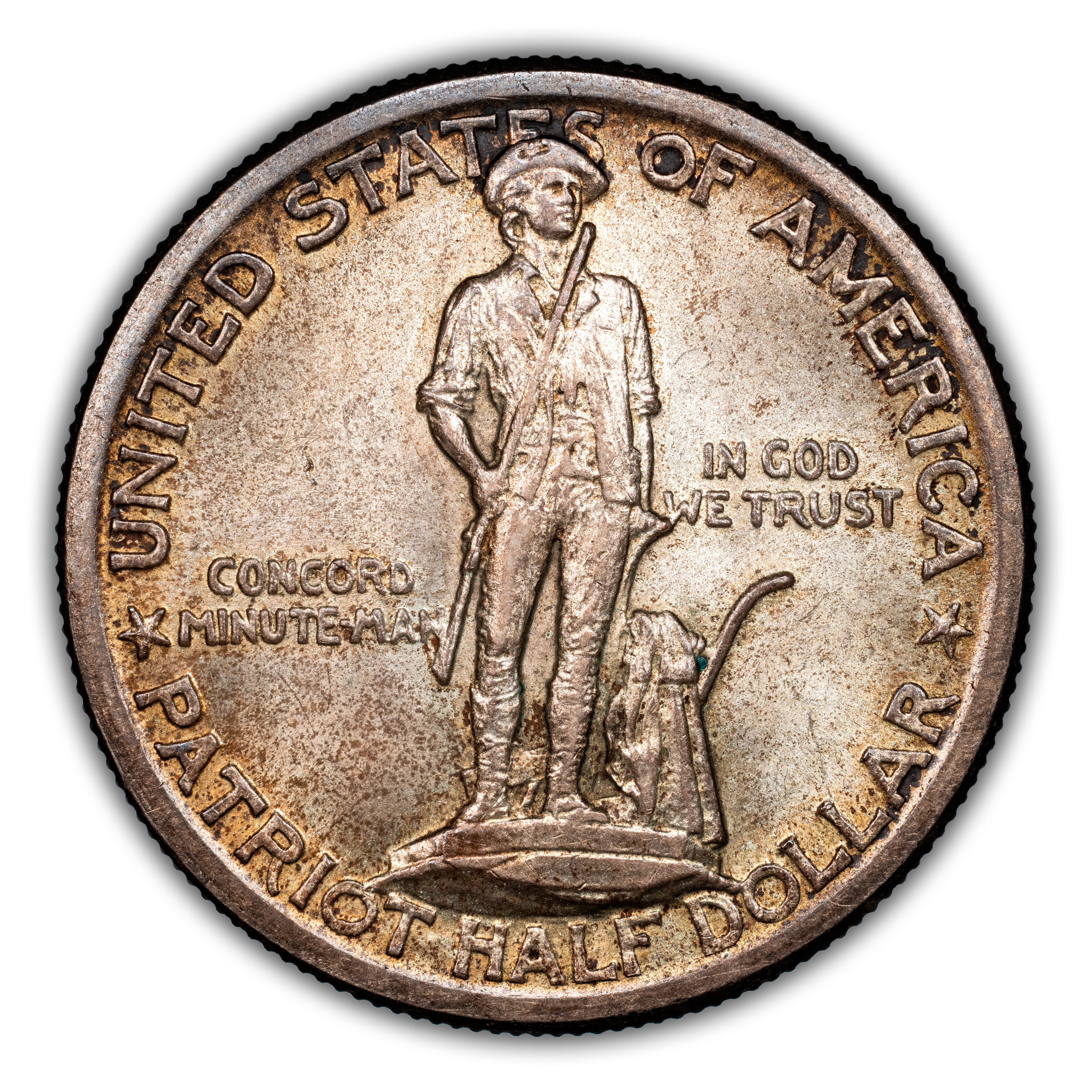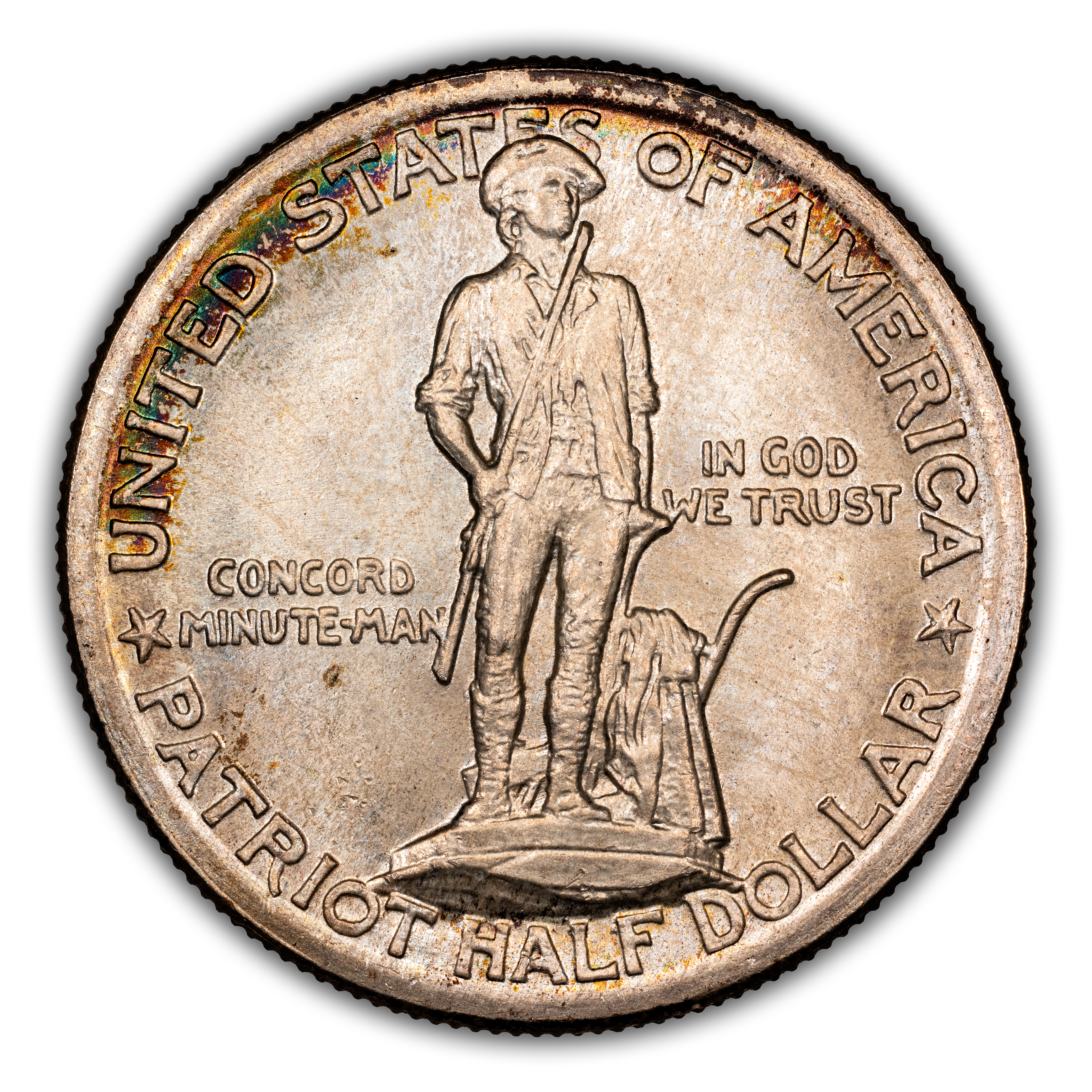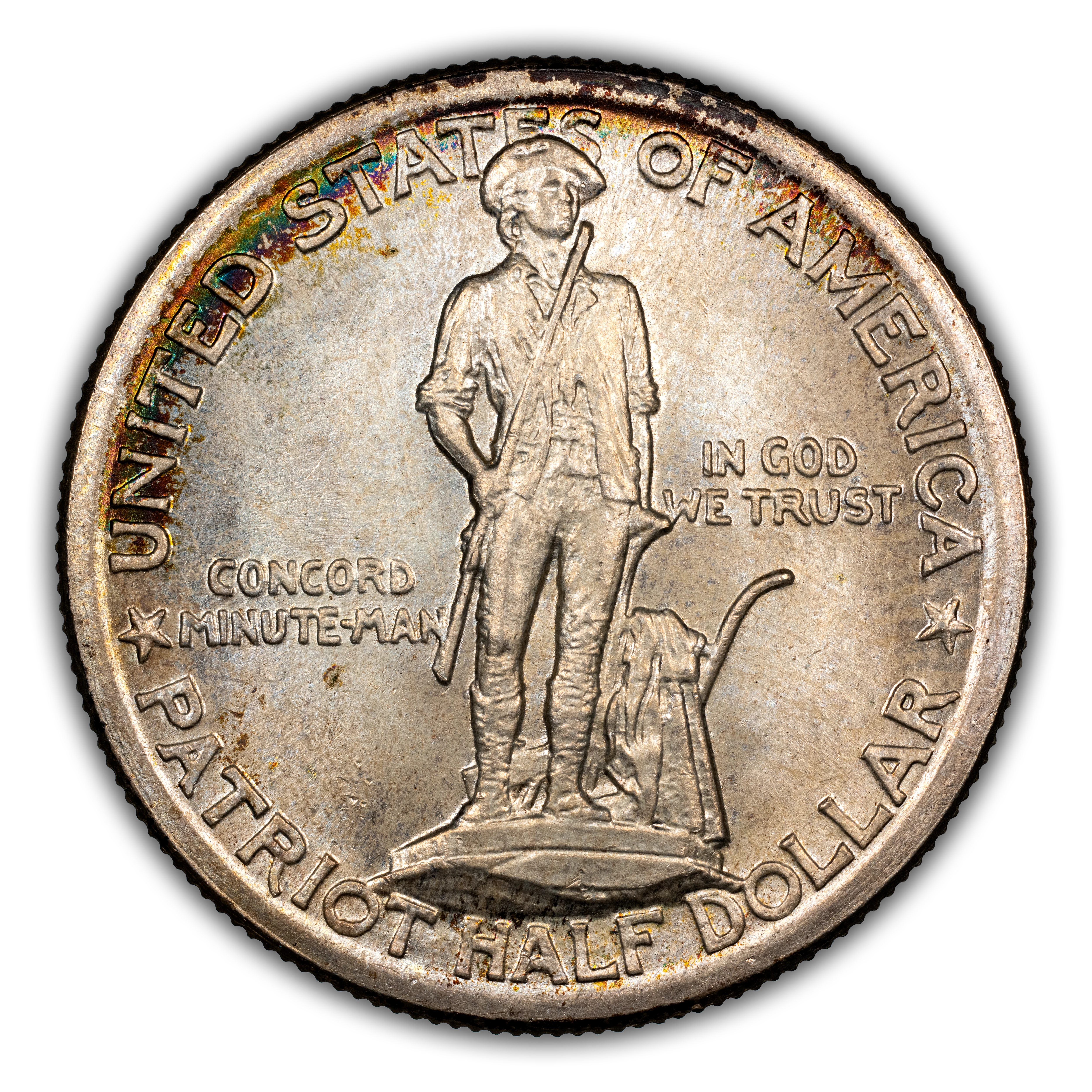 Lexington half dollars, designed by Chester Beach, are often found in the grades of MS63-65, and MS66s are scarce but available on the marketplace, while examples in higher grades are quite rare. Most uncirculated specimens carry lustrous surfaces and offer excellent eye appeal. One nuance of this coin is that some pieces show rub on the knee on the soldier as seen on the obverse, a detraction that can be avoided with some searching.