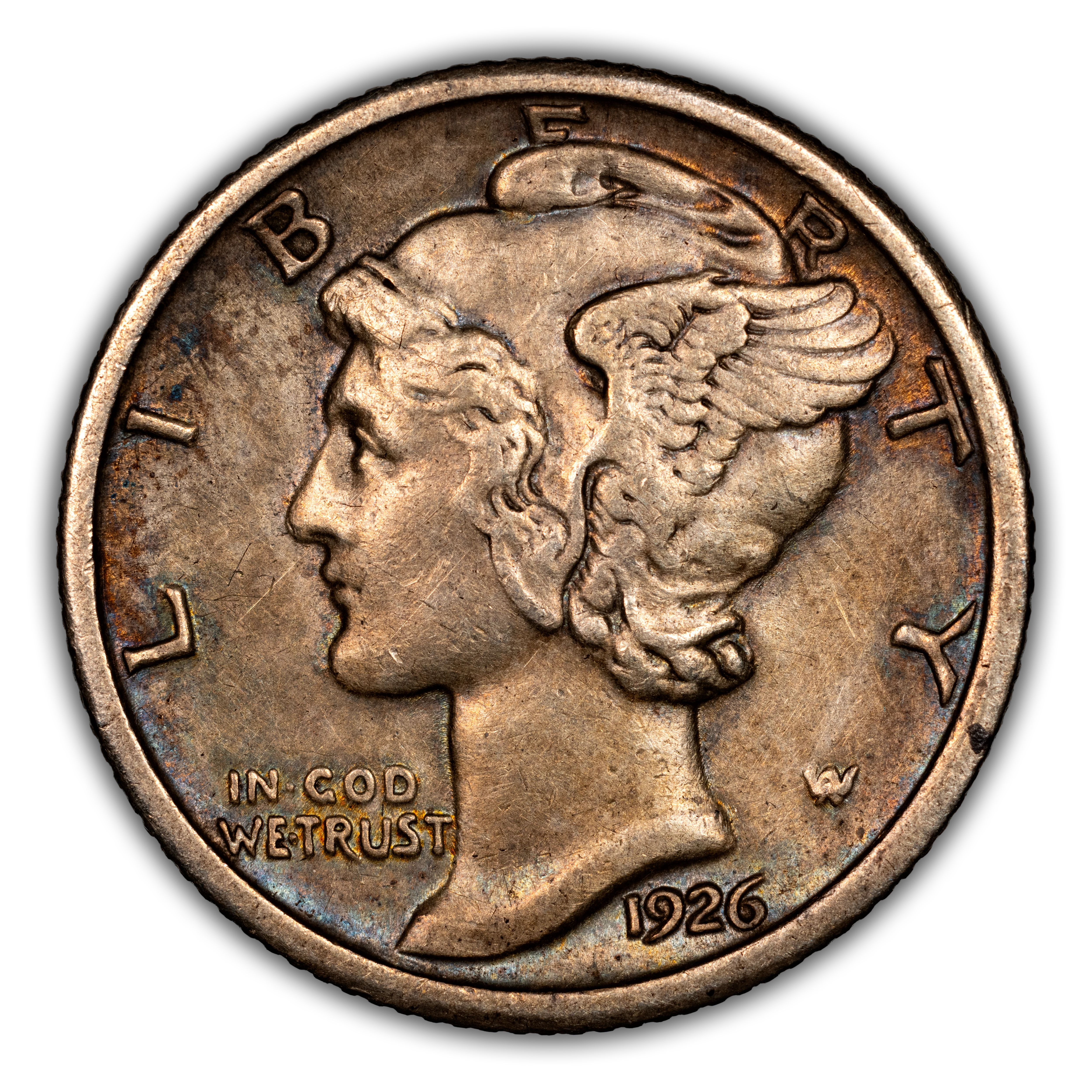 Obverse: Winged Liberty, or Mercury (the Roman god of commerce), is depicted facing left with LIBERTY spelled around the periphery. IN GOD WE TRUST appears left of the neck and the date is positioned just below the bust around 5 o'clock. The designer's initials "AW" appear to the right of the neck.