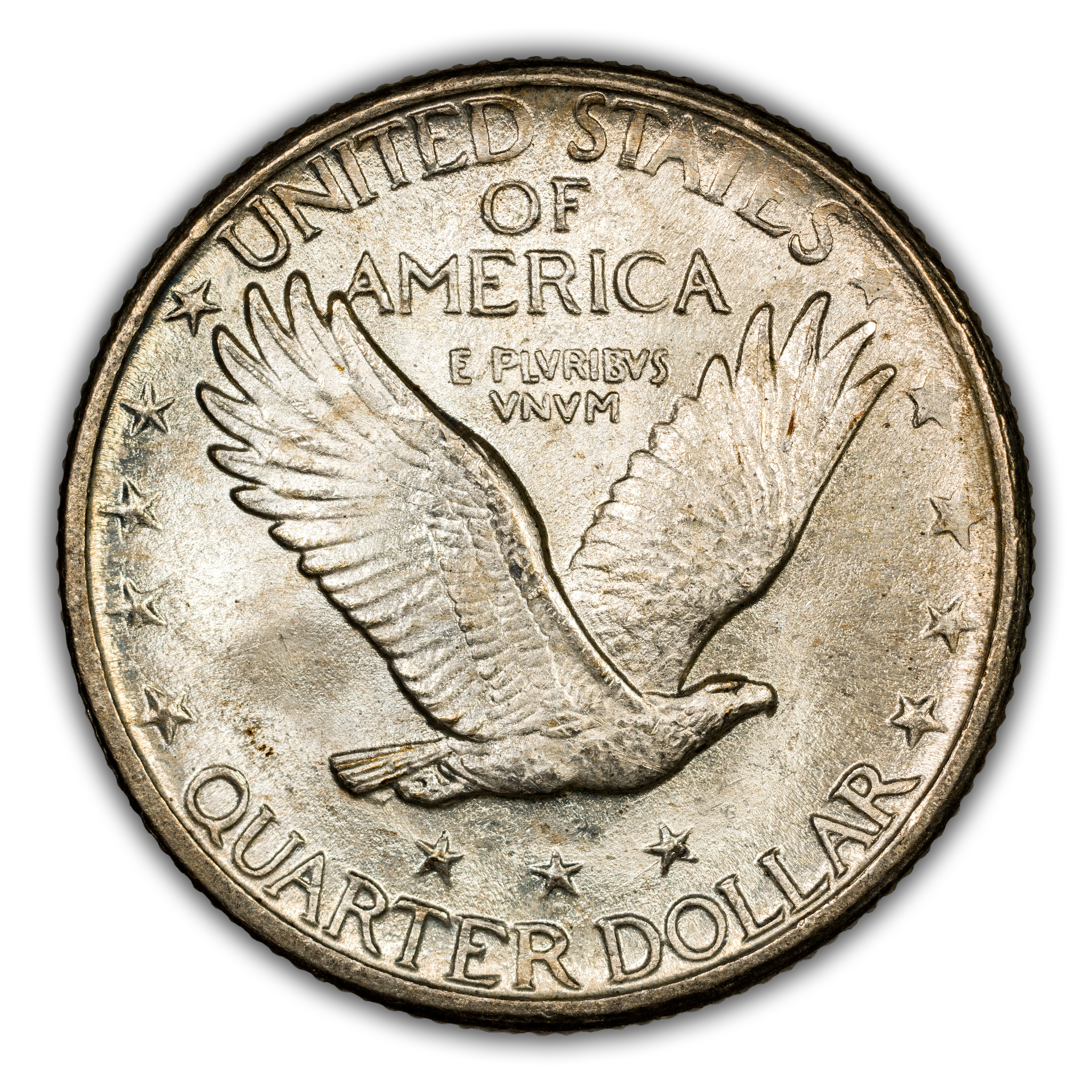 Reverse: An eagle in full flight, facing right, with UNITED STATES OF AMERICA above the great raptor. Stars flank the left and right peripheries with the words QUARTER DOLLAR at the bottom.