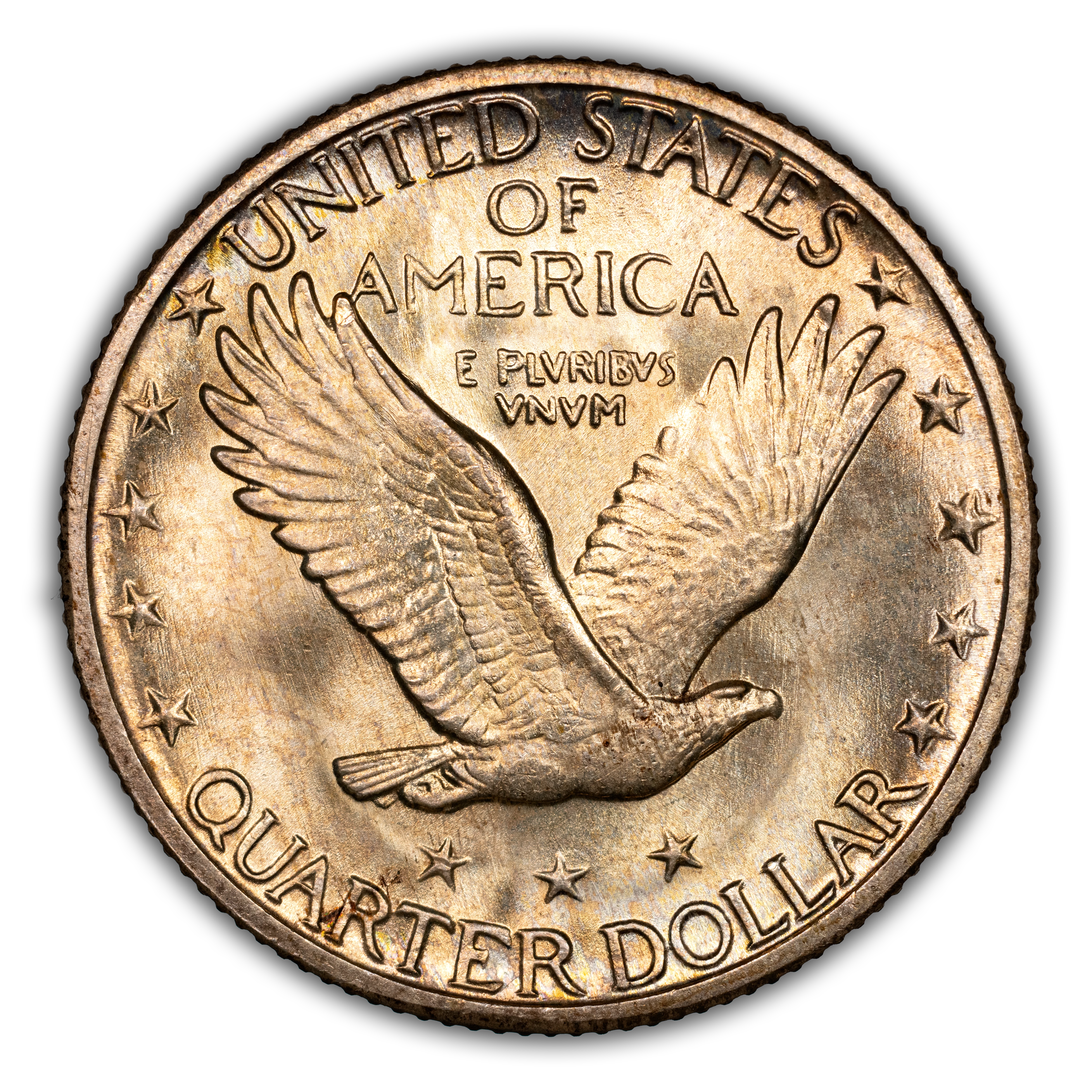 Reverse: An eagle in full flight, facing right, with UNITED STATES OF AMERICA above the great raptor. Stars flank the left and right peripheries with the words QUARTER DOLLAR at the bottom.