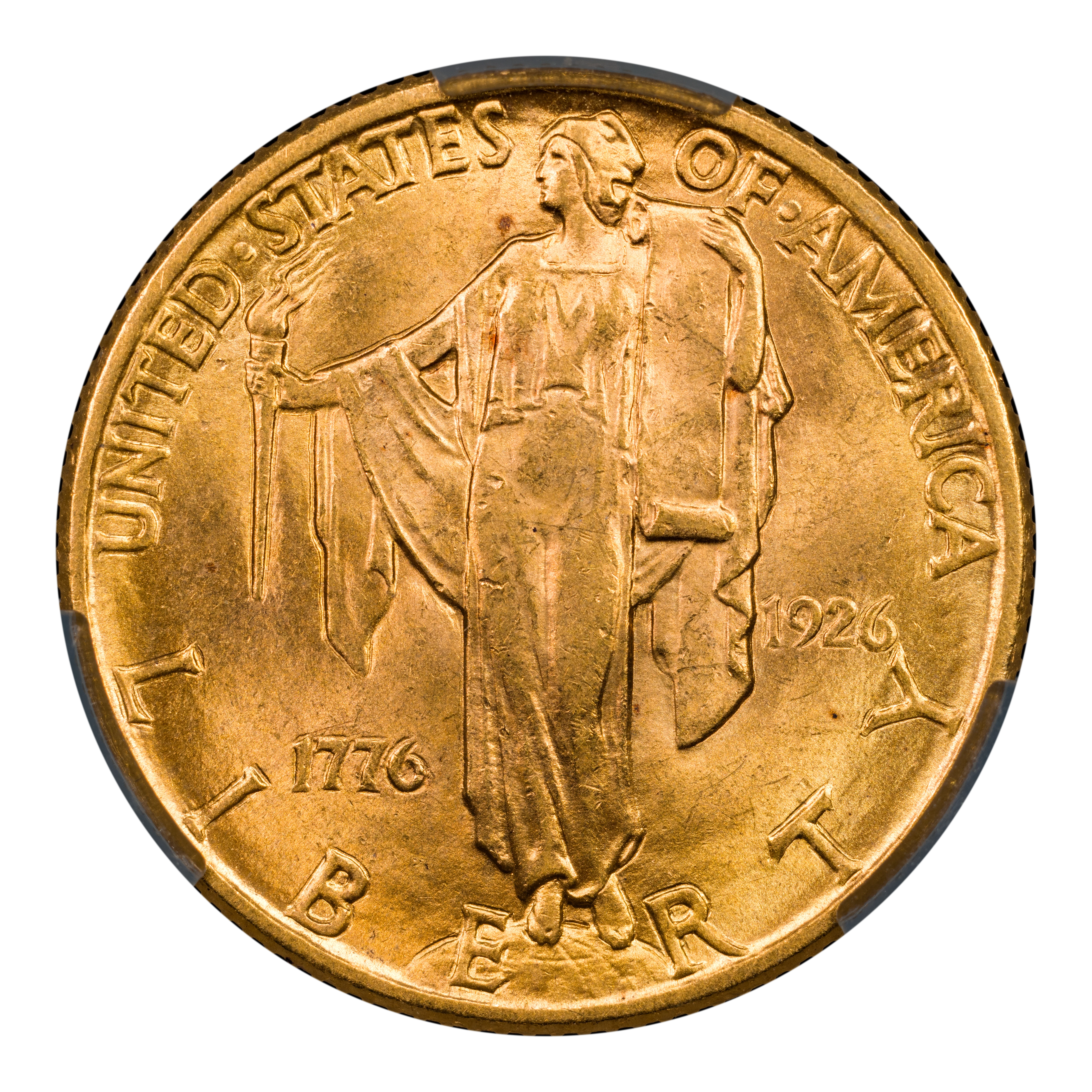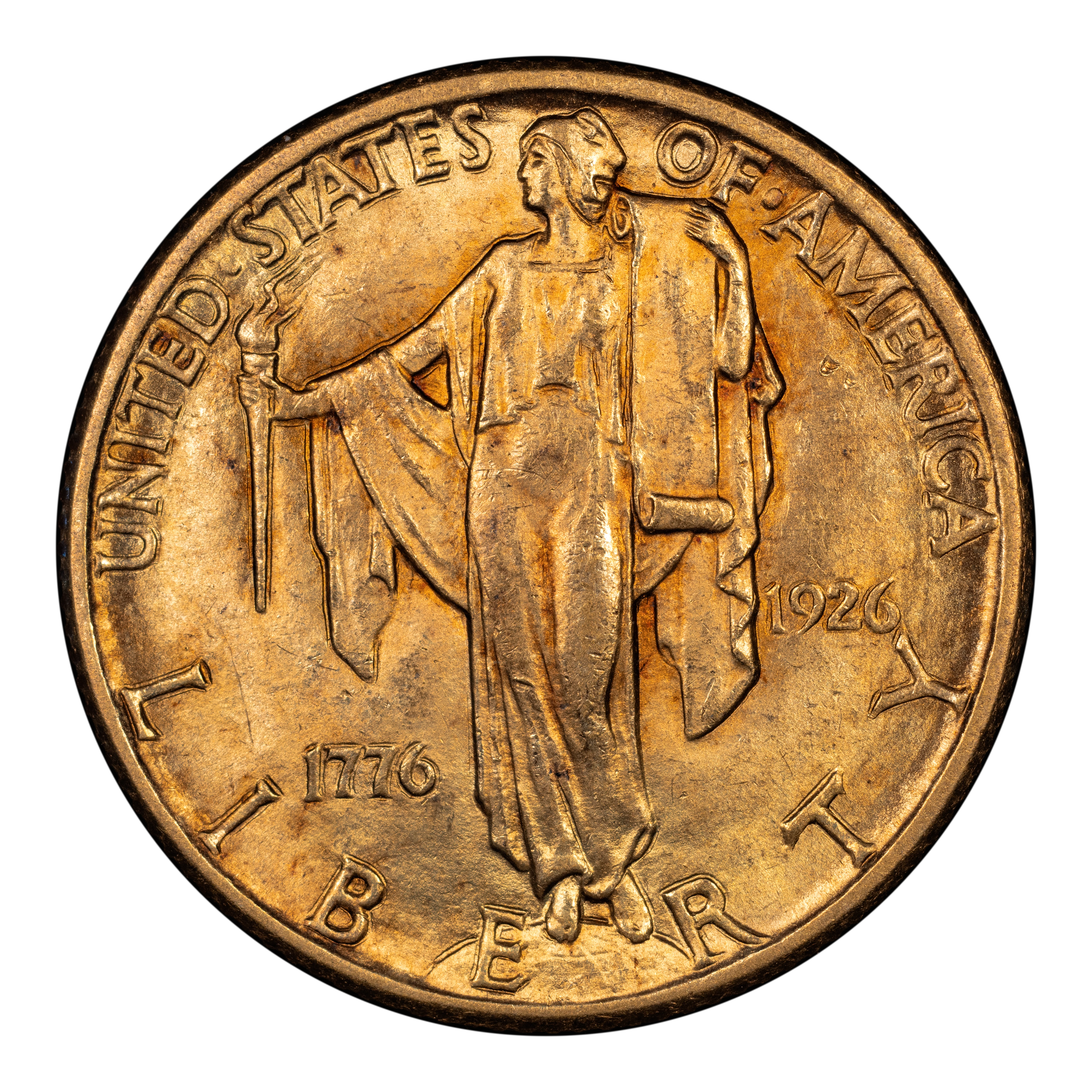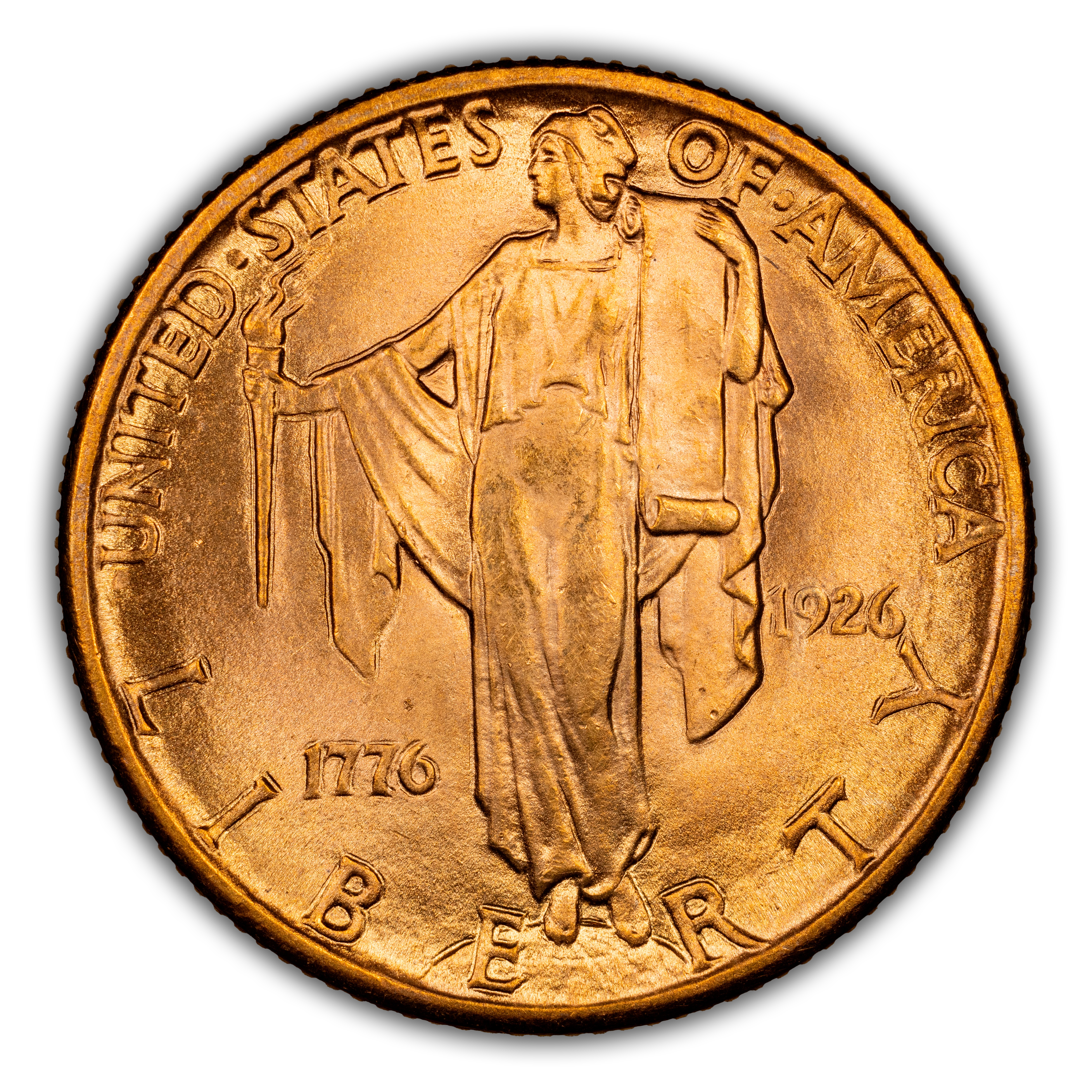 The last of the classic gold commemorative coins celebrates the 150th anniversary of the founding of the United States. Issued during the nation's grand Sesquicentennial in 1926 and struck alongside a half dollar also honoring the Sesquicentennial, this gold quarter eagle designed by John R. Sinnock features an obverse standing figure of Miss Liberty, who holds a scrolled Declaration of Independence in one hand and the Torch of Freedom in her other hand. The reverse showcases Independence Hall in Philadelphia.