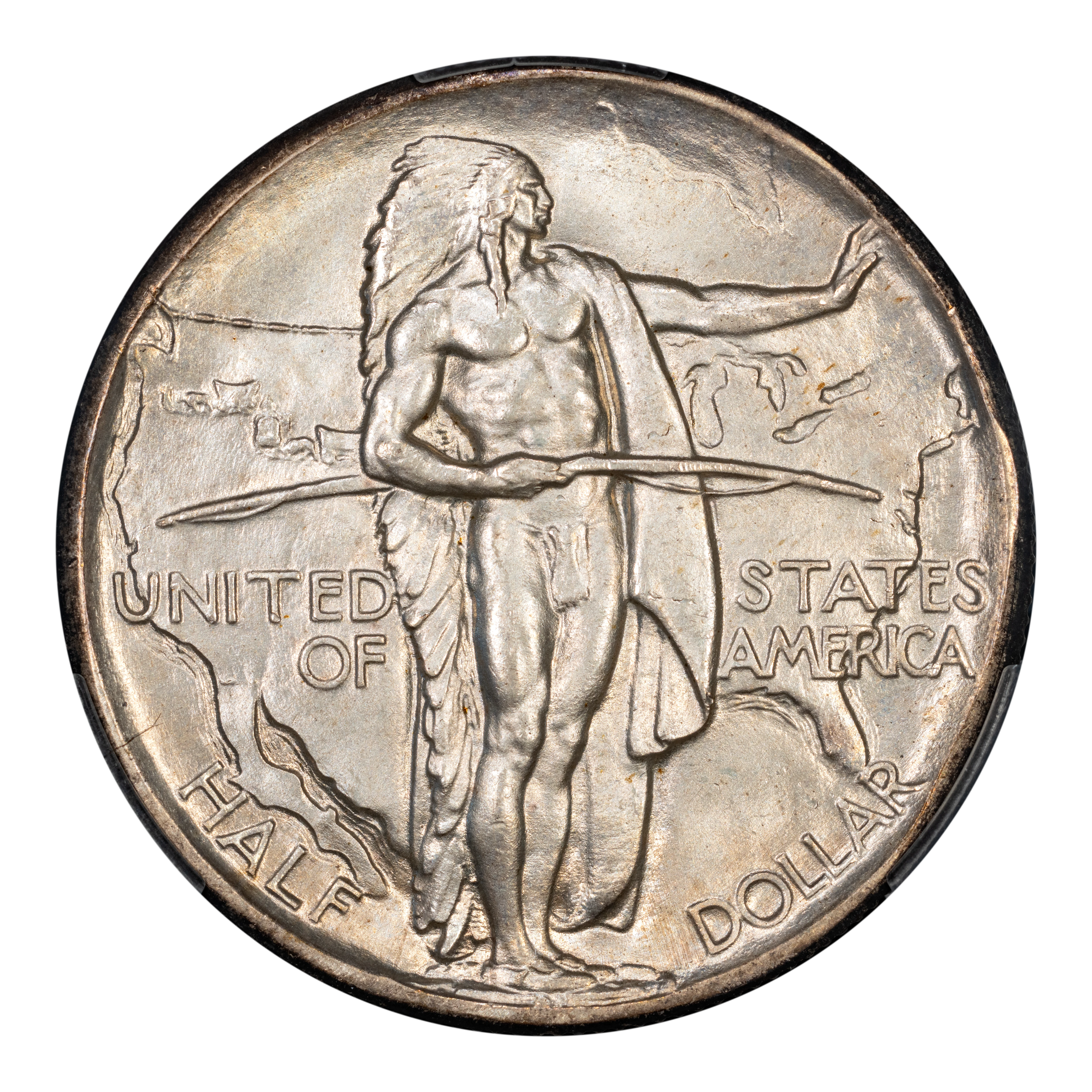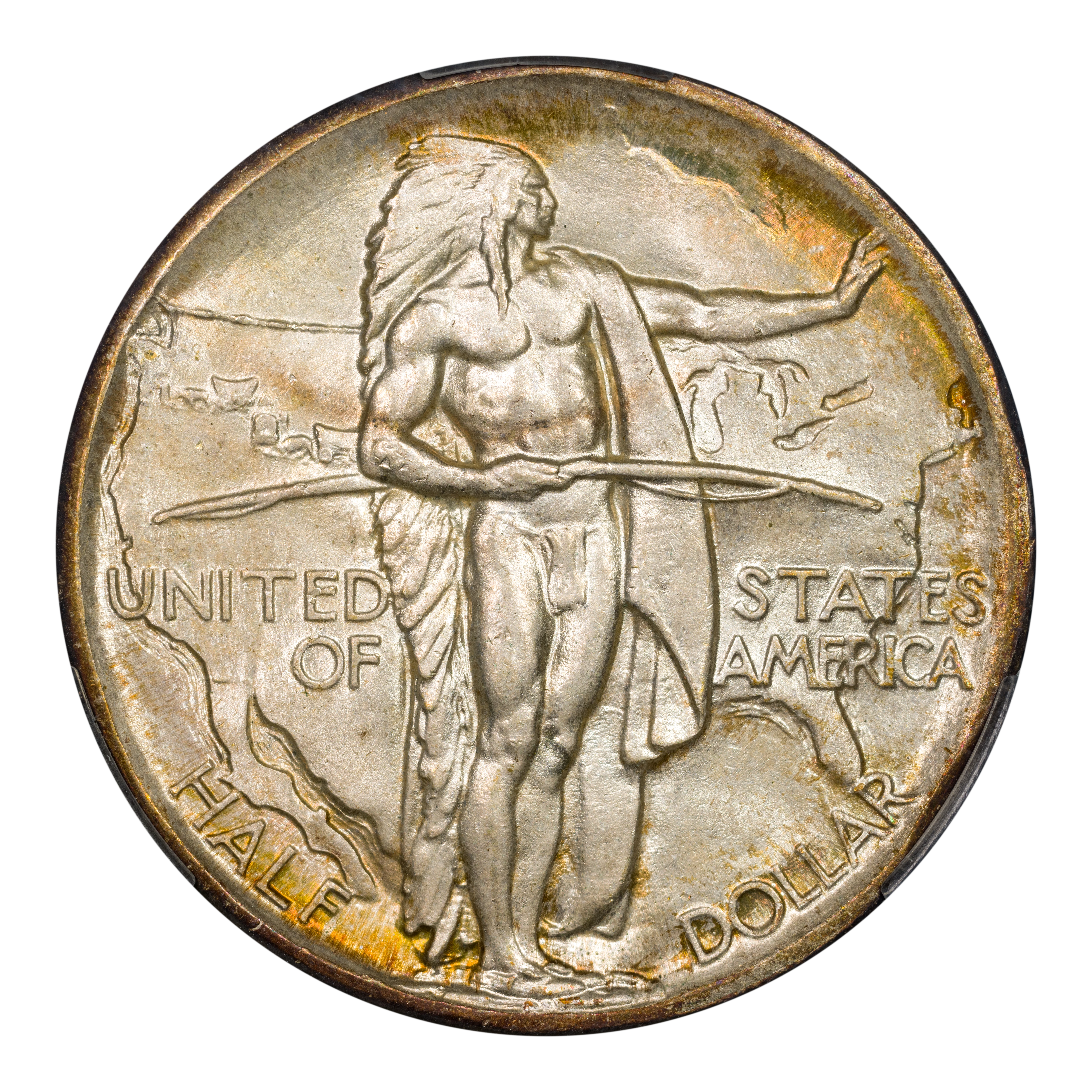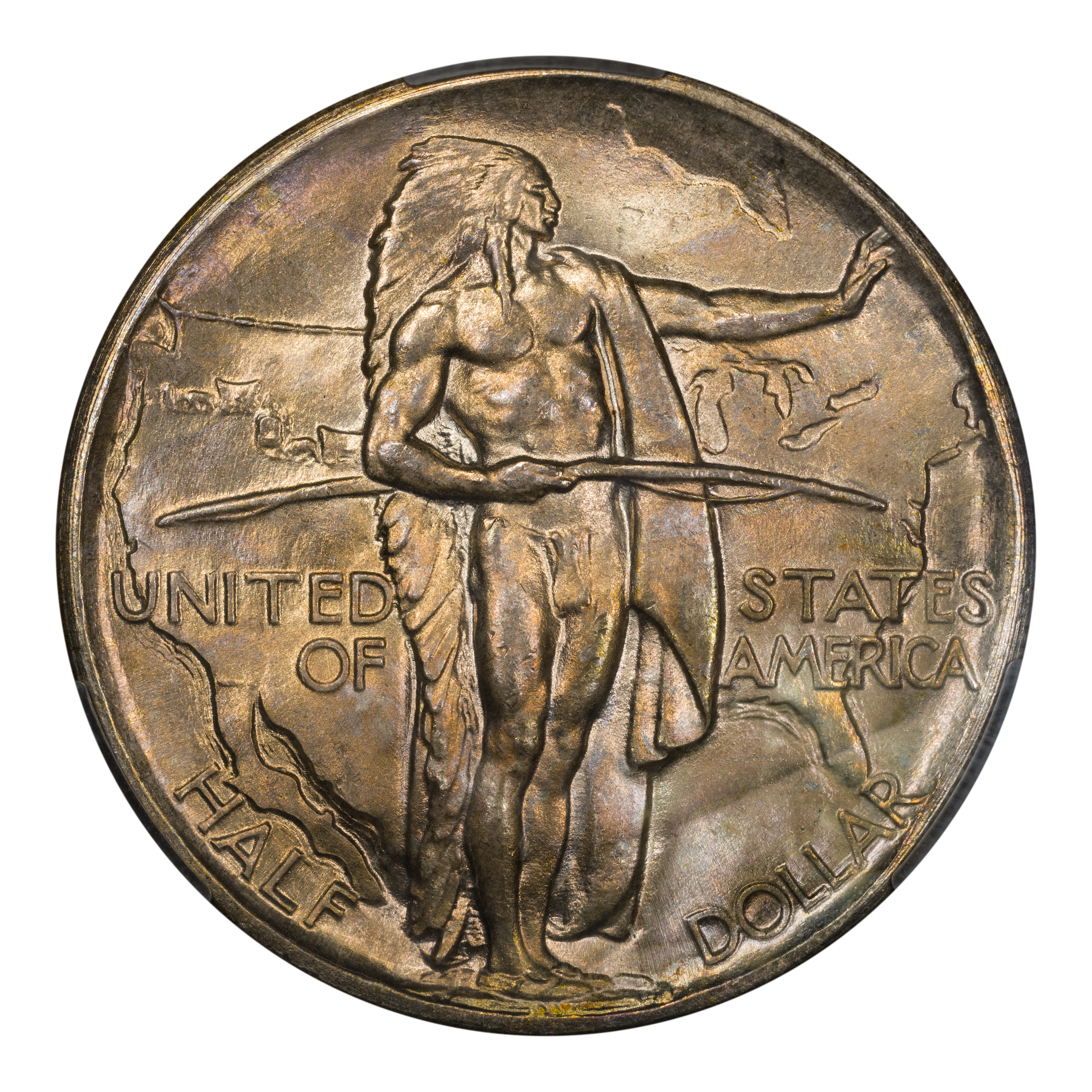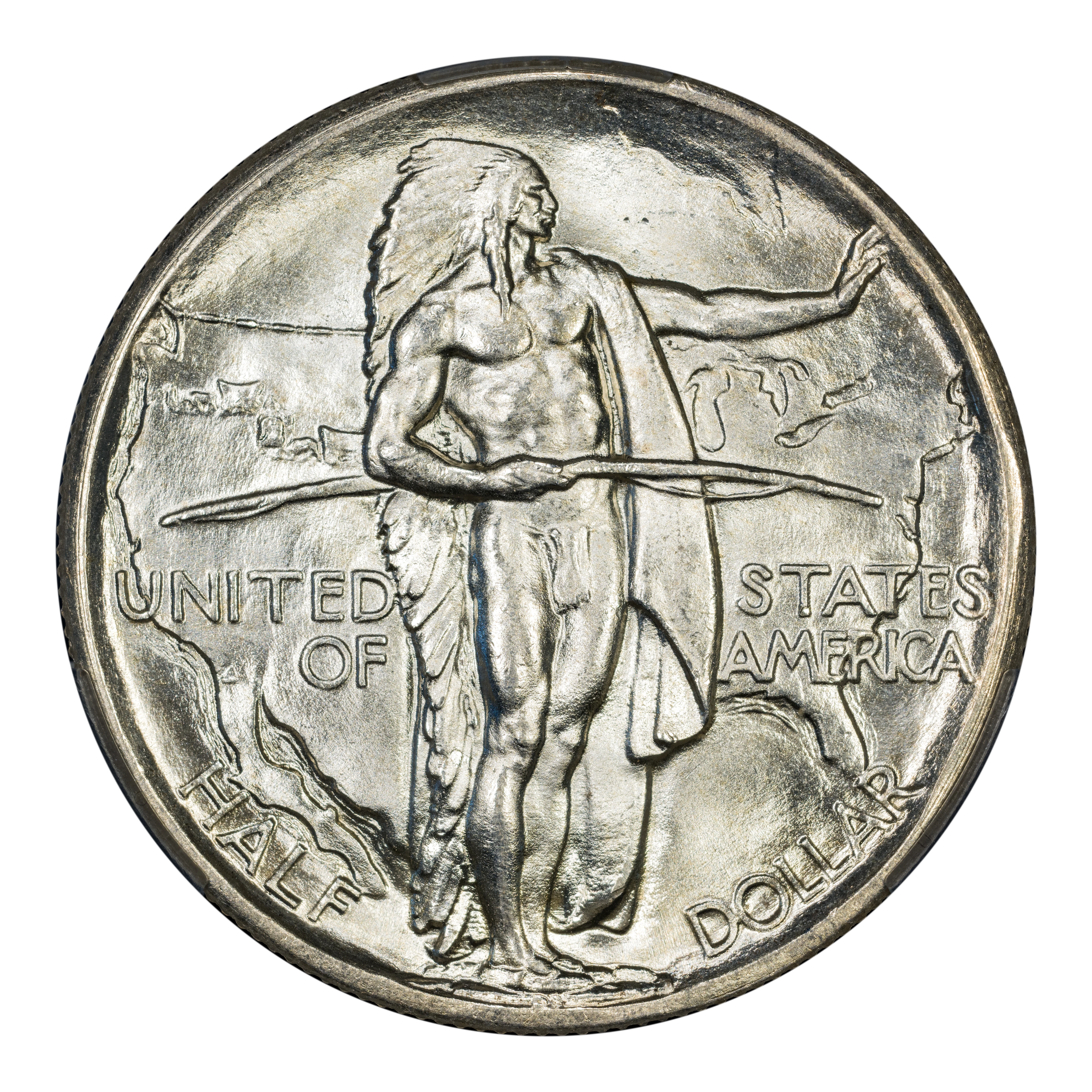 The 1928 Oregon half dollar, designed by husband and wife coin designers James Earle Fraser and Laura Gardin Fraser, shows on its obverse a Native American before a map of the continental United States highlighting the path of the Oregon Trail, while the reverse shows a cattle-driven stagecoach heading toward a sunset. The coin commemorates the historic 2,000-mile path across the western United States as well as the many pioneers who died along the way.