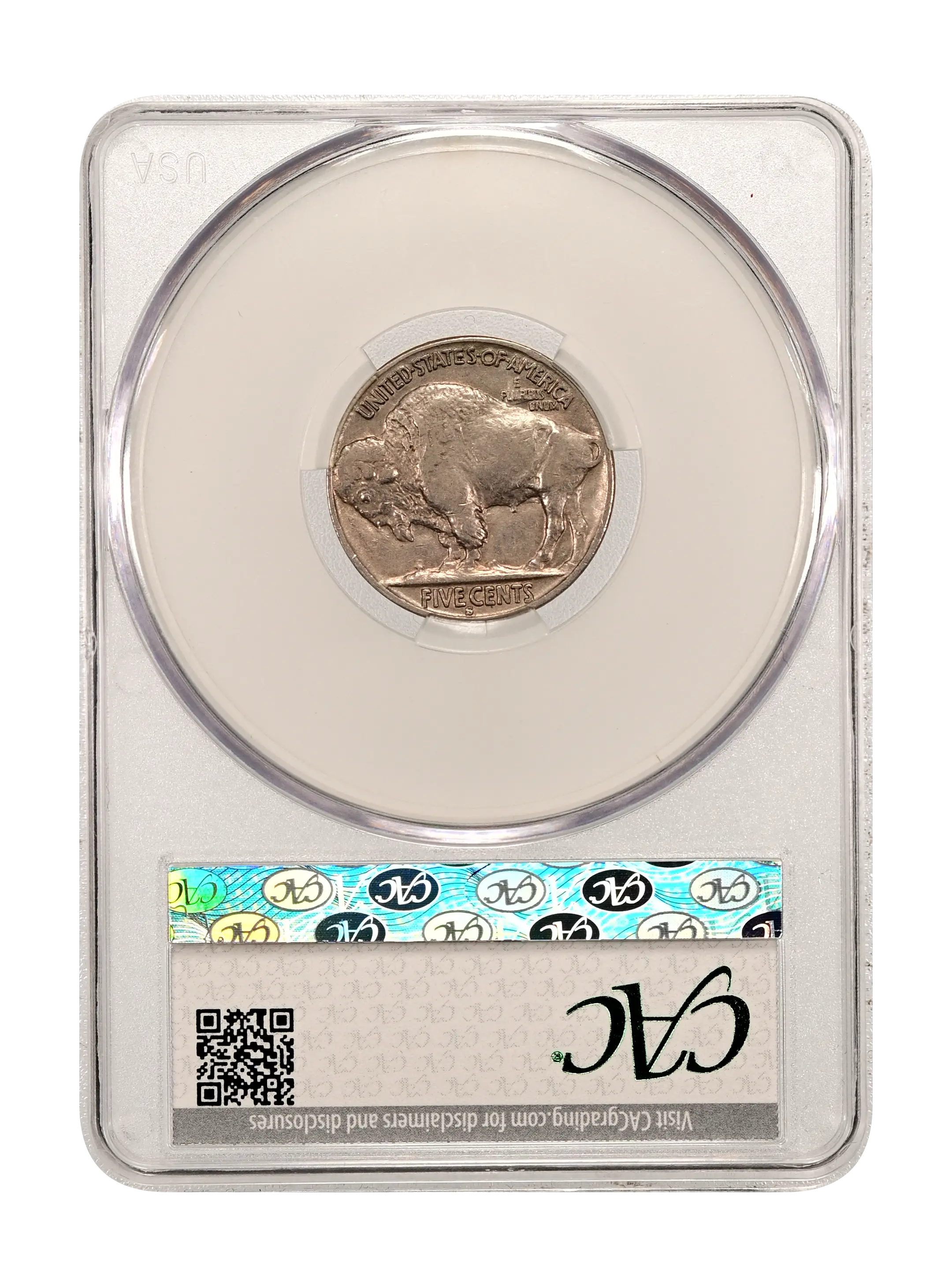 Reverse: A full portrait of the bison, Black Diamond, with the words UNITED STATES oF AMERICA at the top periphery with the motto E PLURIBUS UNUM just underneath. The denomination FIVE CENTS is spelled out at the bottom. For the Type 1, the denomination is embossed on a flat surface.