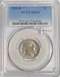 Reverse: A full portrait of the bison, Black Diamond, with the words UNITED STATES oF AMERICA at the top periphery with the motto E PLURIBUS UNUM just underneath. The denomination FIVE CENTS is spelled out at the bottom. For the Type 1, the denomination is embossed on a flat surface.