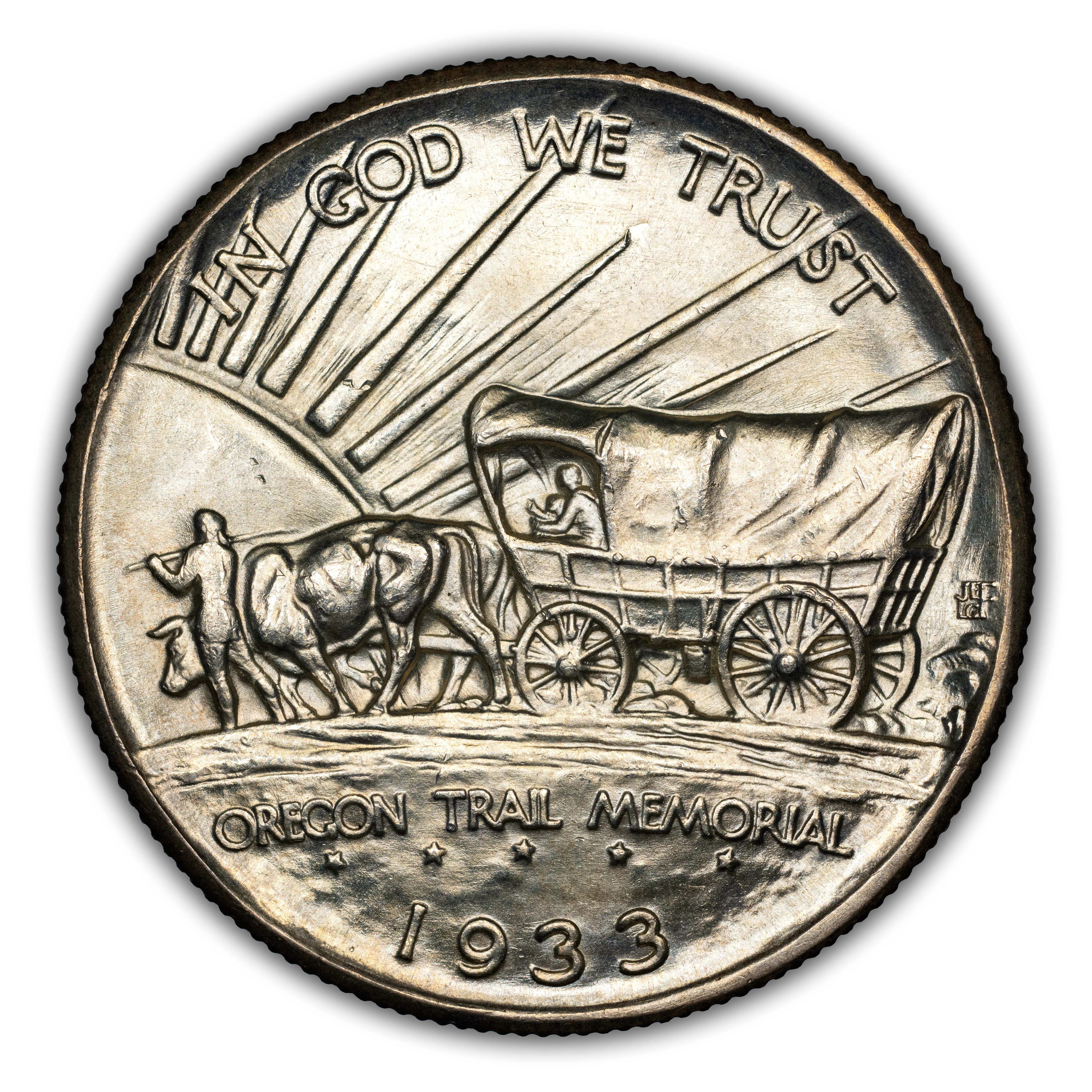 The 1933-D Oregon Trial half dollar, struck at the Denver Mint, is one of the scarcer of the examples of this commemorative type, which was struck over a 14-year period spanning from 1926 through 1939. The coin honors the many pioneers involved with the 2,000-mile-long Oregon Trail, charted across the western United States beginning in the early 19th century. The coin was designed by husband and wife coin designers James Earle Fraser and Laura Gardin Fraser -- two of the most celebrated coin artists of their time, and their handiwork shows on the Oregon half dollar -- a coin many say is among the most beautiful ever minted.