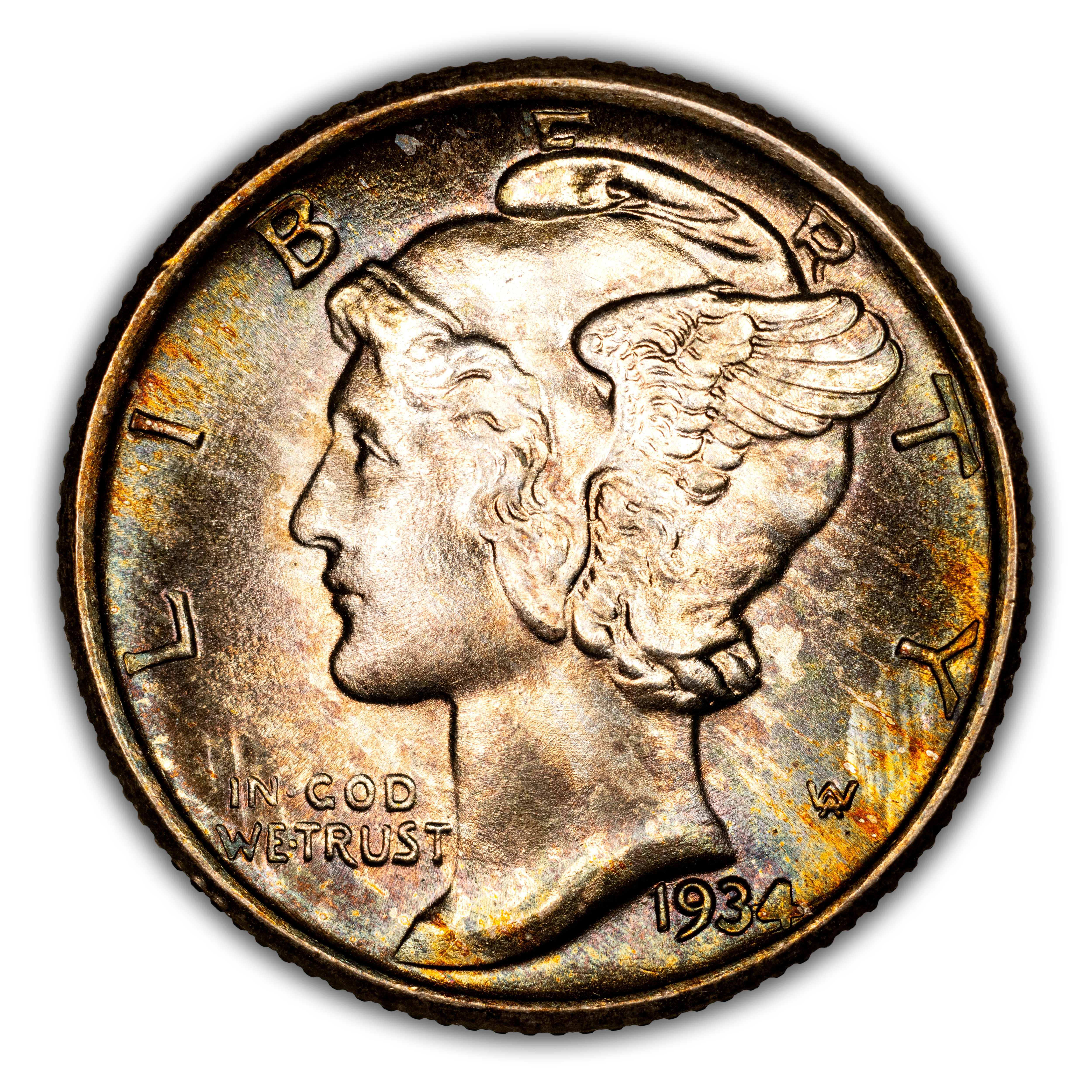 The nation was still reeling from the economic pathos of the Great Depression, but there were some positive signs that the situation was improving slightly. The United States Mint had also produced very little coinage during the previous few years, and the nation's supply of new coins needed a boost. All denominations, one-cent through silver dollar, saw production pick back up again in 1934, with Mercury dimes pumping out in large numbers, with nearly 25 million coming from the Philadelphia Mint alone. Most were very well struck and many uncirculated survivors exhibit Full Bands details.