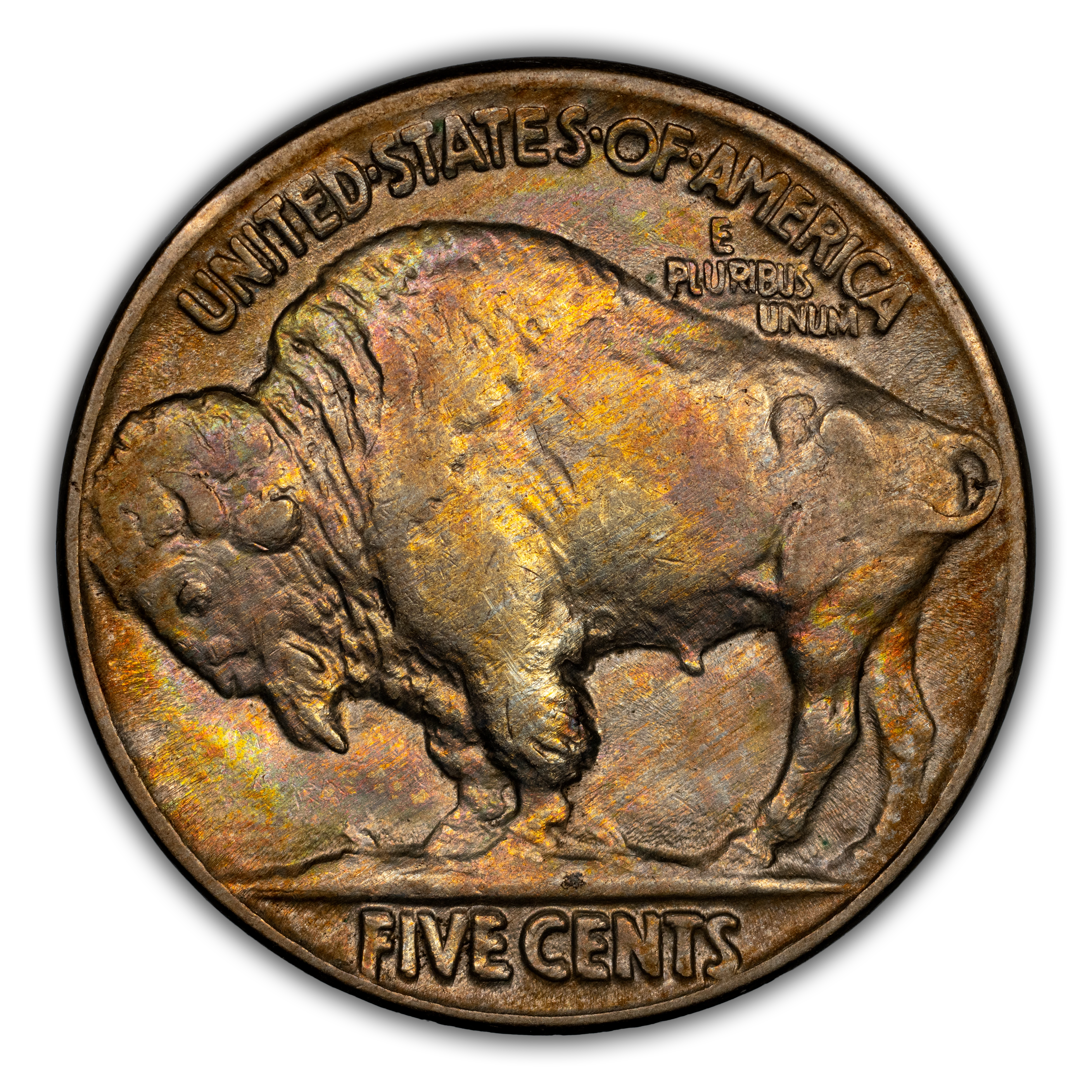 Reverse: A full portrait of the bison, Black Diamond, with the words UNITED STATES oF AMERICA at the top periphery with the motto E PLURIBUS UNUM just underneath. The denomination FIVE CENTS is spelled out at the bottom. For the Type 1, the denomination is embossed on a flat surface.